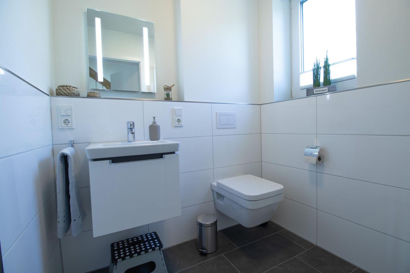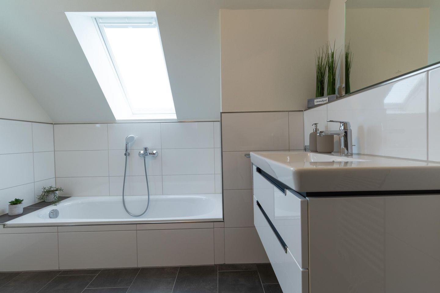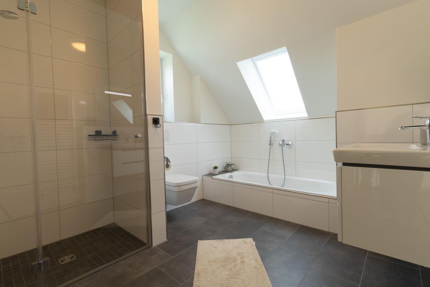 Das moderne Badezimmer im Obergeschoss überzeugt mit Sauna, Dusche und Badewanne – ideal für deine persönliche Auszeit. Ein zweites Bad mit Dusche und WC im Erdgeschoss rundet den Komfort ab.