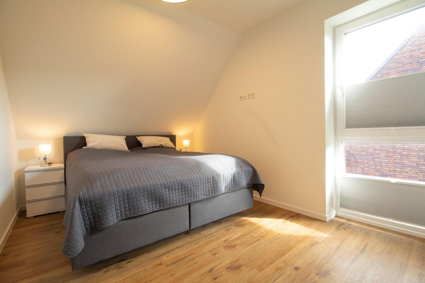 Zwei separate Schlafzimmer mit gemütlichen Boxspringbetten garantieren dir erholsame Nächte. Eines der Zimmer ist zusätzlich mit einem TV ausgestattet. Verdunkelungsplissees und große Fenster sorgen für Licht am Tag und Ruhe in der Nacht.