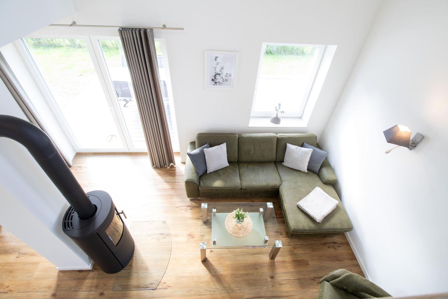 Im großzügigen Wohnbereich mit Kaminofen kannst du herrlich entspannen – ob bei einem Buch, einem Film oder einfach dem Blick ins Freie. Die offene Küche mit großem Esstisch ist voll ausgestattet und lädt zu gemeinsamen Mahlzeiten ein. Für zusätzliche Schlafmöglichkeiten steht eine komfortable Schlafcouch bereit. Bodentiefe Fenster und die Galerie sorgen für ein helles, offenes Raumgefühl. Von der überdachten Terrasse mit Sonnenschutz genießt du sonnige Frühstücke oder entspannte Abende im Freien.