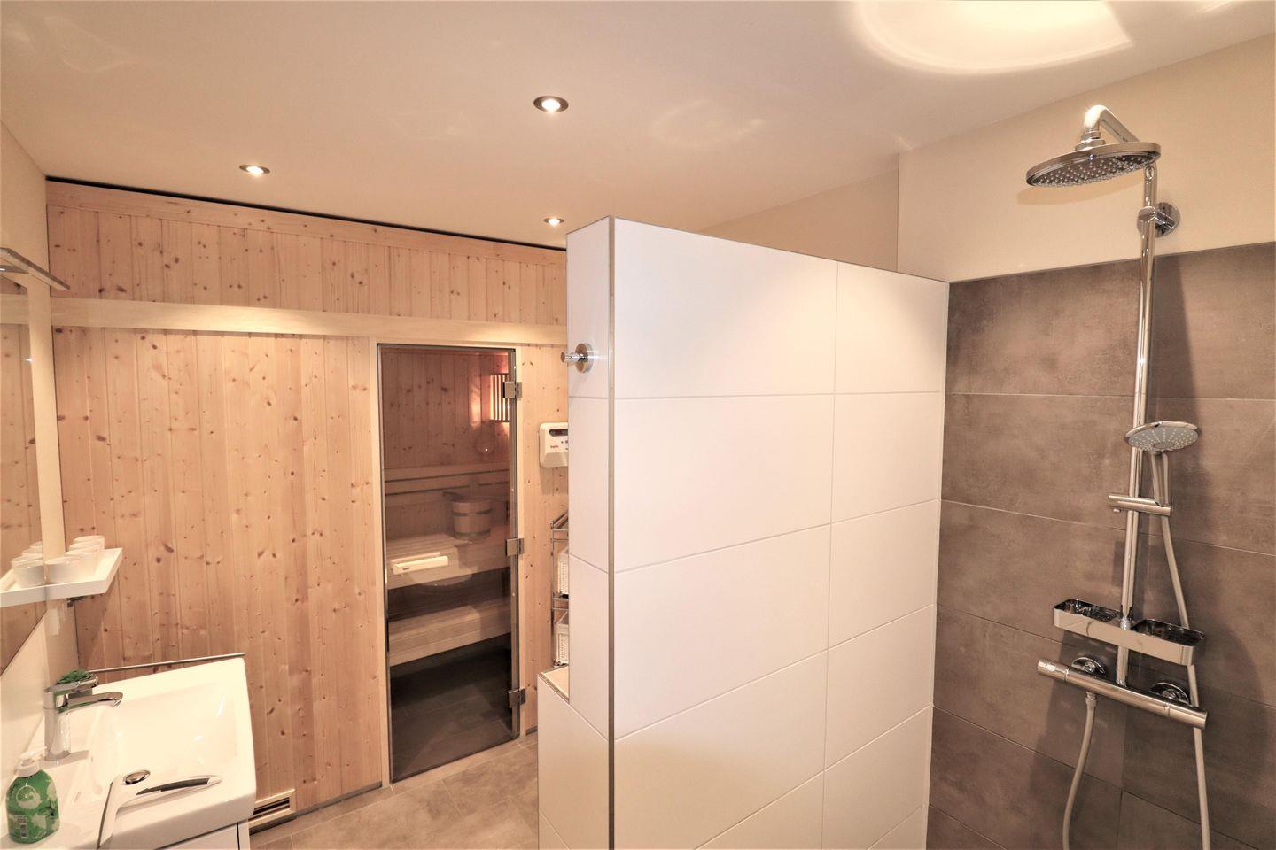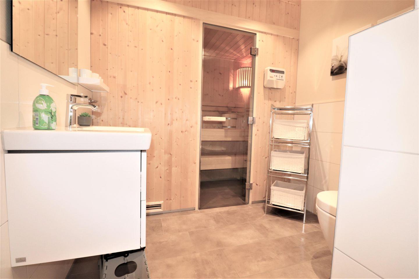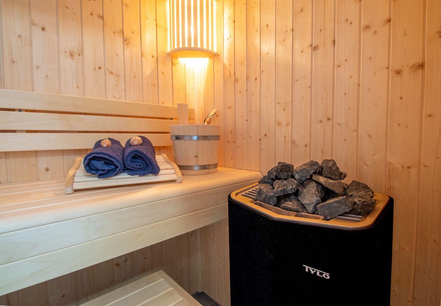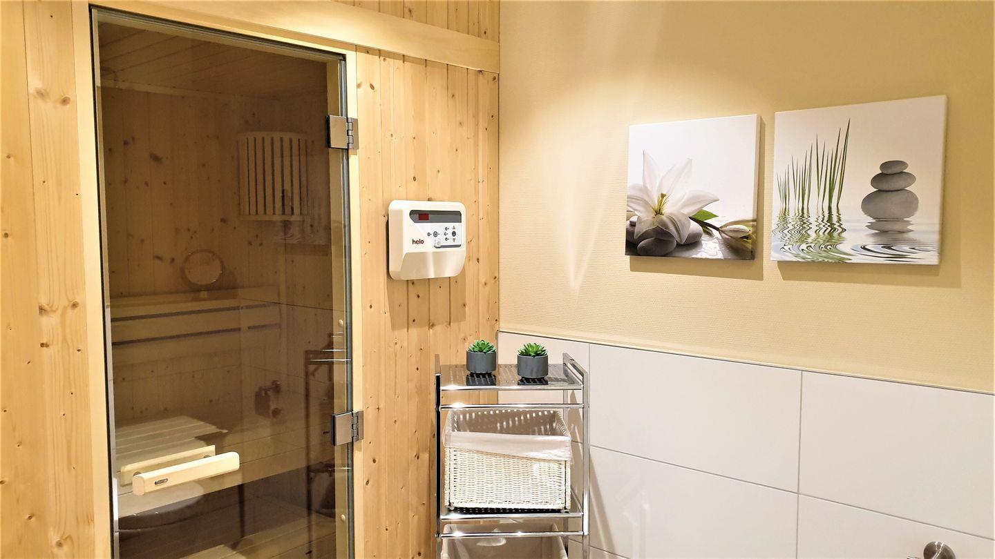 Das modern gestaltete Badezimmer ist dein persönlicher Rückzugsort. Hier kannst du unter der Regendusche neue Energie tanken oder in der privaten Sauna einen Aufguss genießen. Die Wellnessoase ist stilvoll eingerichtet und rundet das Erholungserlebnis perfekt ab.