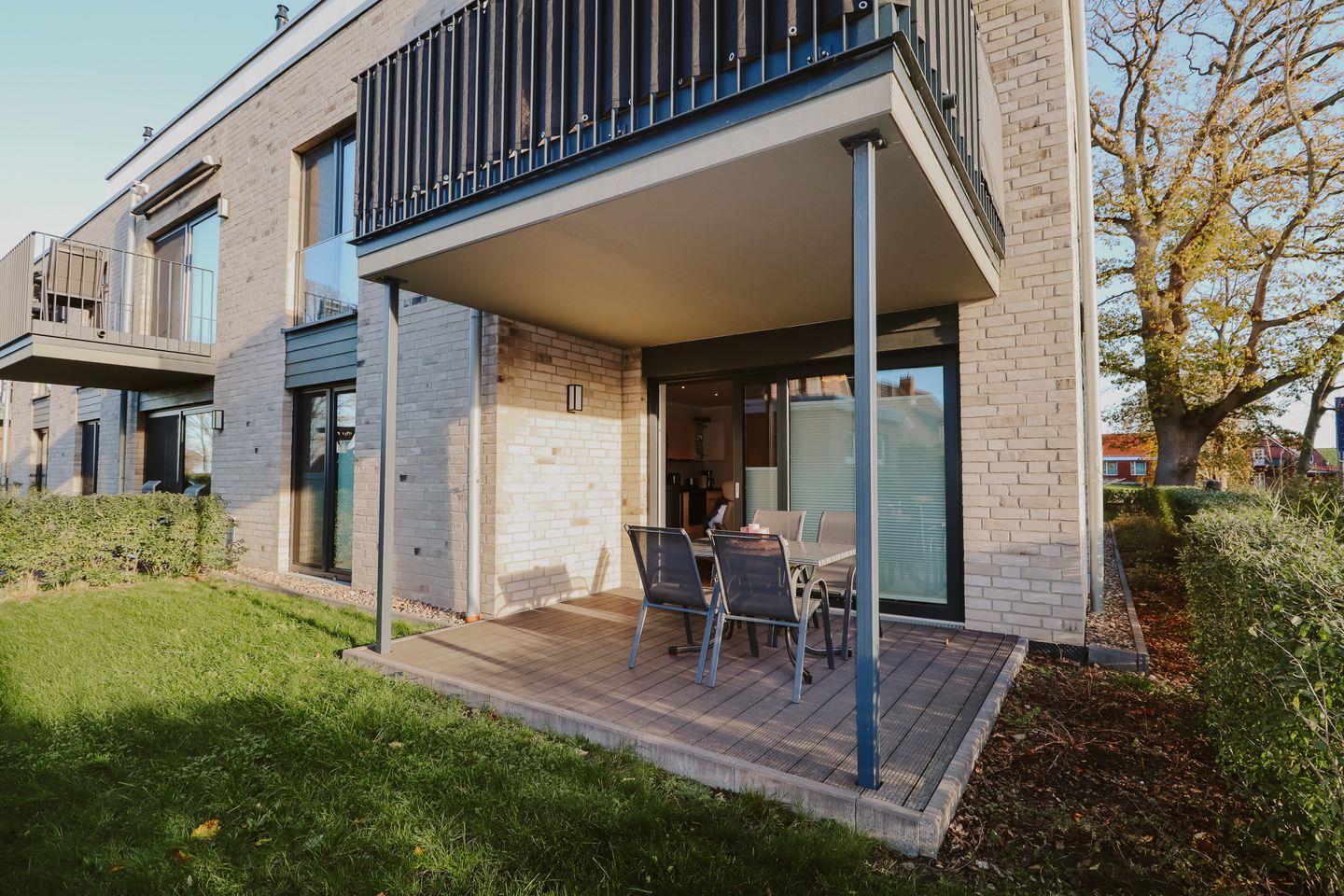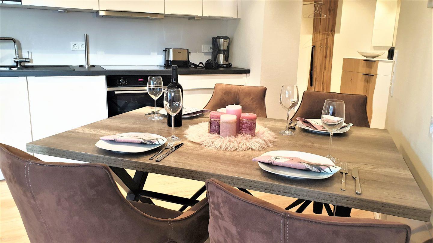 Der offene Wohnbereich empfängt dich mit bodentiefen Fenstern, die viel Licht hereinlassen und zugleich den Blick auf den Garten freigeben. Ein gemütlicher Gaskamin sorgt in der kühleren Jahreszeit für wohlige Wärme und lädt zu entspannten Abenden ein. Warme Farben und hochwertige Materialien schaffen eine Atmosphäre, in der du dich sofort zu Hause fühlst. Die angrenzende Küche ist modern und komplett ausgestattet – ideal, um gemeinsam zu kochen, zu spielen oder den Tag bei einem Glas Wein am Esstisch ausklingen zu lassen. Bei schönem Wetter lockt die überdachte Terrasse in Südwestlage mit Blick ins Grüne – der perfekte Ort für Mahlzeiten im Freien oder entspannte Stunden im Garten.