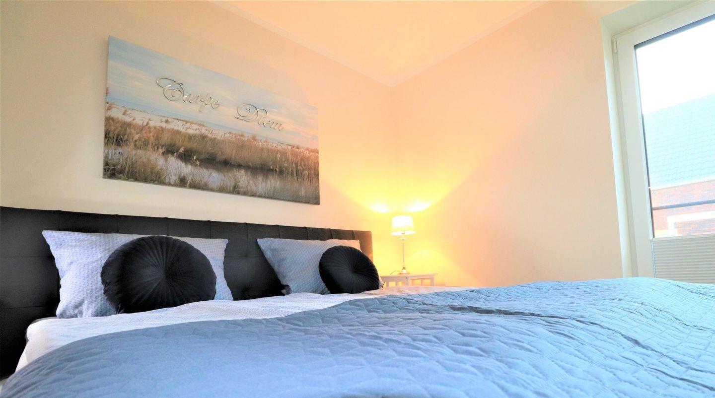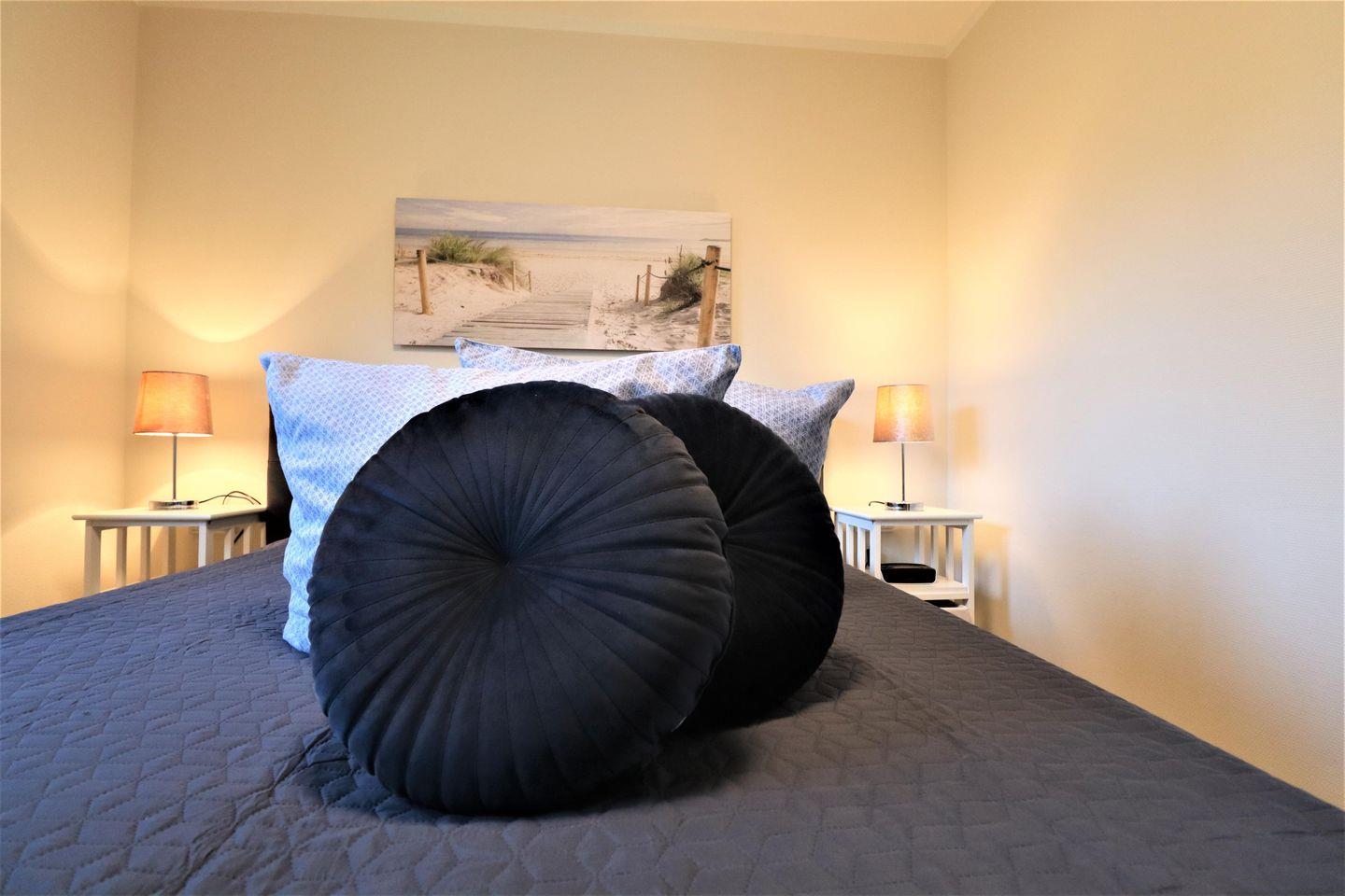 Beide Schlafzimmer verfügen über hochwertige Boxspringbetten mit Matratzen und Toppern für erholsamen Schlaf. Verdunkelungsplissees sorgen für angenehme Dunkelheit. In beiden Räumen findest du außerdem Smart-TVs und ausreichend Stauraum – perfekt für längere Aufenthalte.