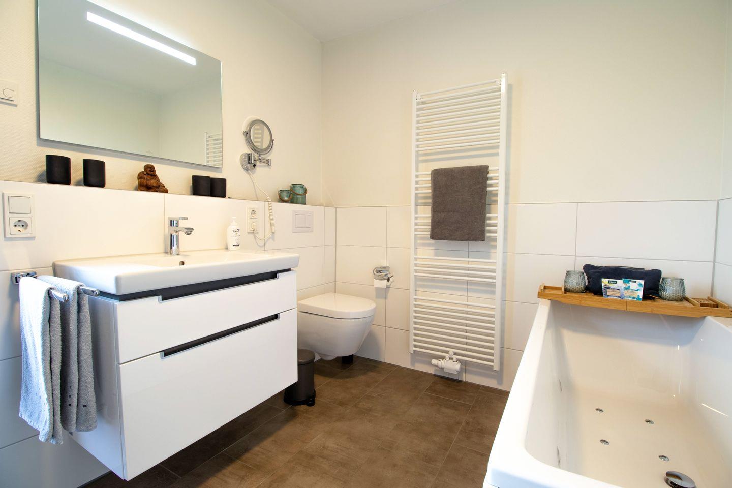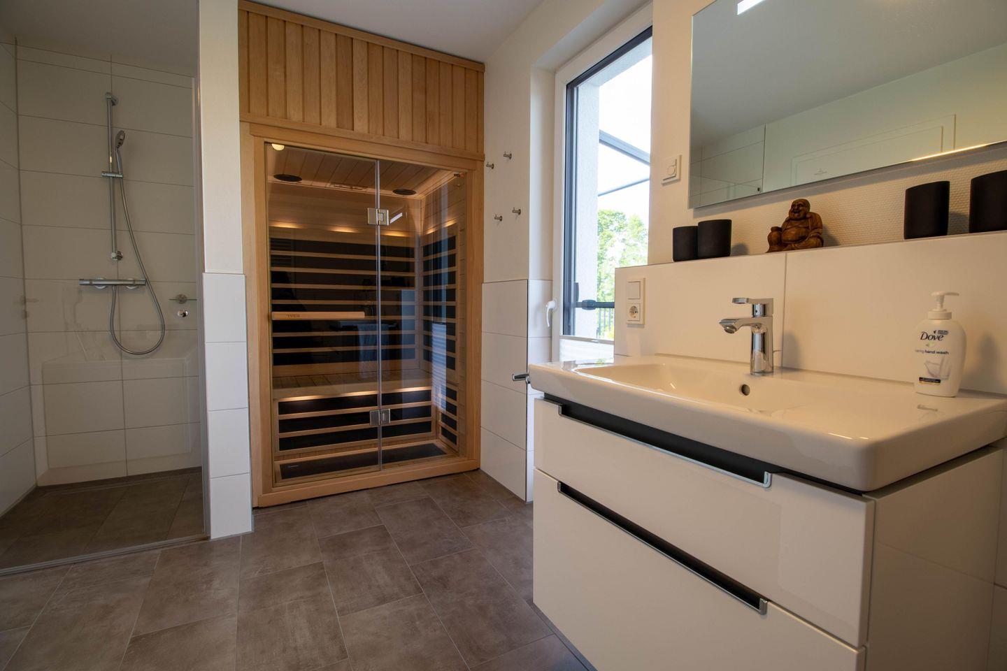 Im großzügigen Badezimmer findest du alles, was du zum Abschalten brauchst: Eine Whirlpool-Badewanne, eine geräumige Dusche und eine Infrarotsauna sorgen für pure Entspannung. Zusätzlich steht dir ein separates Gäste-WC zur Verfügung – besonders praktisch bei voller Belegung.