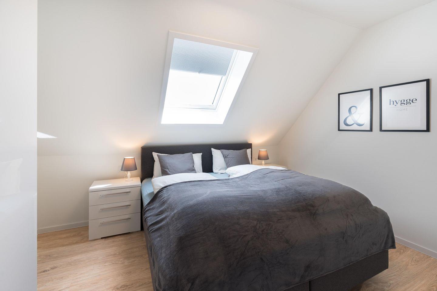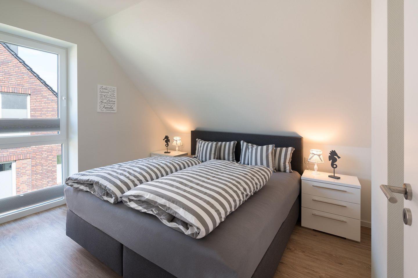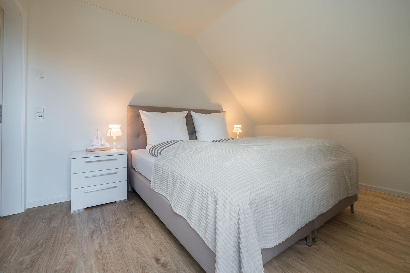 Drei stilvoll eingerichtete Schlafzimmer mit Boxspringbetten (180×200?cm) sorgen für traumhaften Schlafkomfort. Hochwertige Verdunkelungsplissees und die ruhige Lage im Hafendorf machen die Nächte besonders erholsam – perfekt für tiefe Entspannung nach einem Tag an der frischen Nordseeluft.