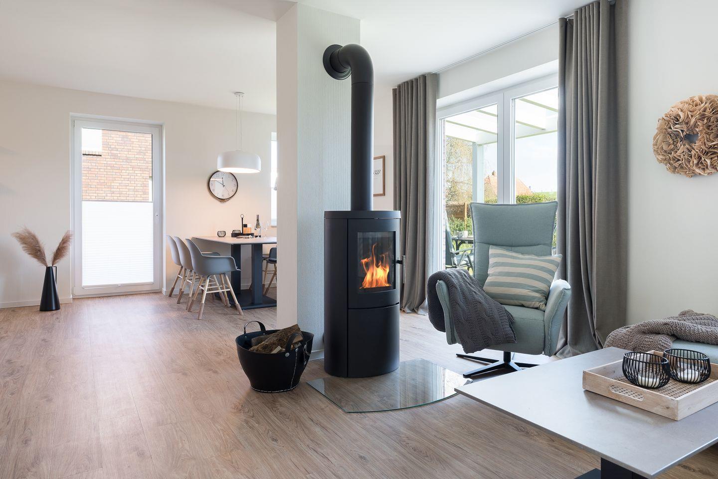 Der großzügige Wohnbereich mit Kaminofen lädt zu gemütlichen Stunden ein – ideal für kühlere Tage. Dank Fußbodenheizung bleibt es in allen Räumen angenehm warm. Durch bodentiefe Fenster gelangst du direkt auf die überdachte Terrasse mit Holzkohlegrill und Blick in den gepflegten Garten. Die offene Küche ist hochwertig ausgestattet und lässt mit Ceranfeld, Backofen, Spülmaschine und Kaffeemaschine keine Wünsche offen. Der große Esstisch verbindet Kochen und Genießen.