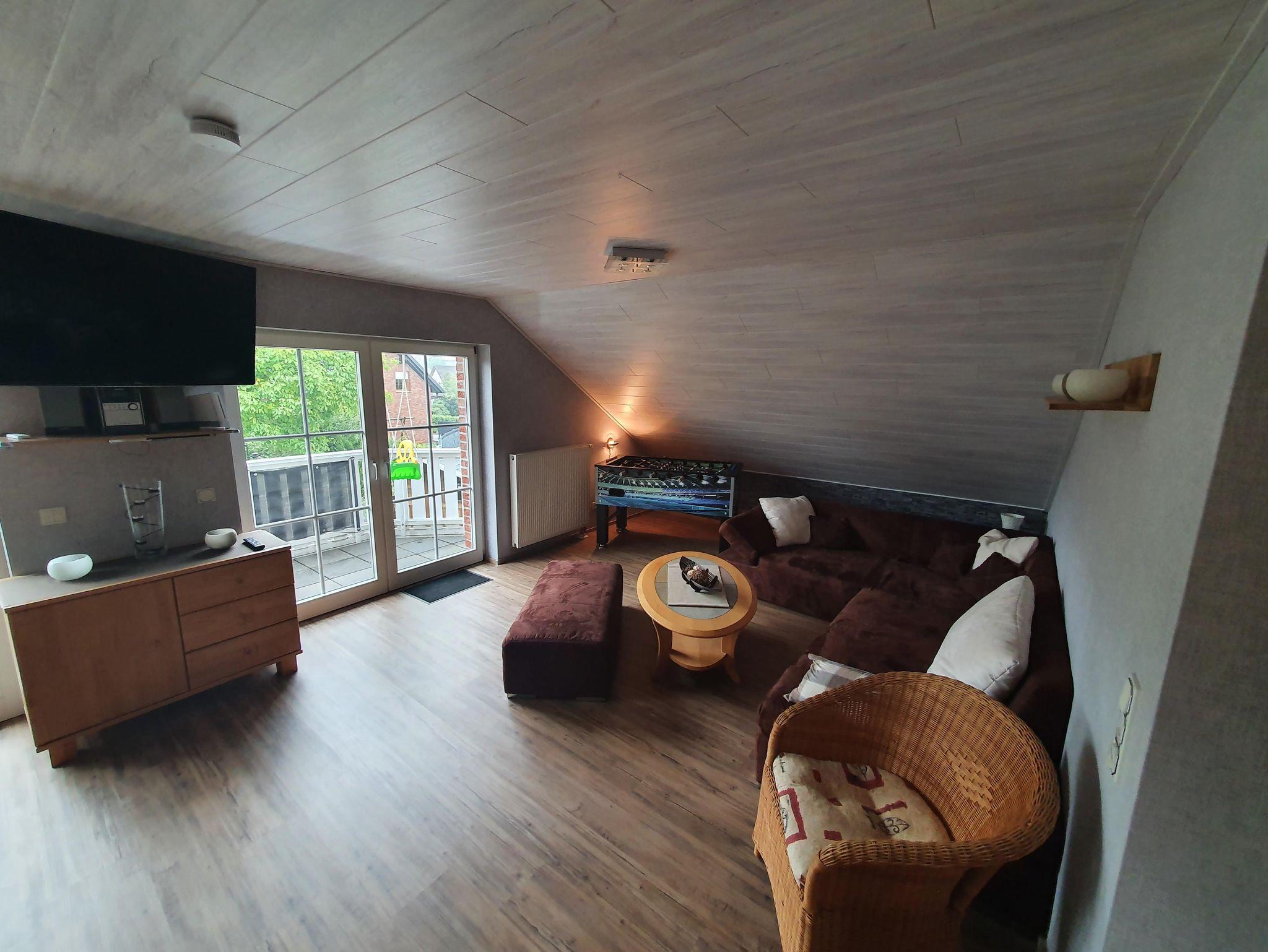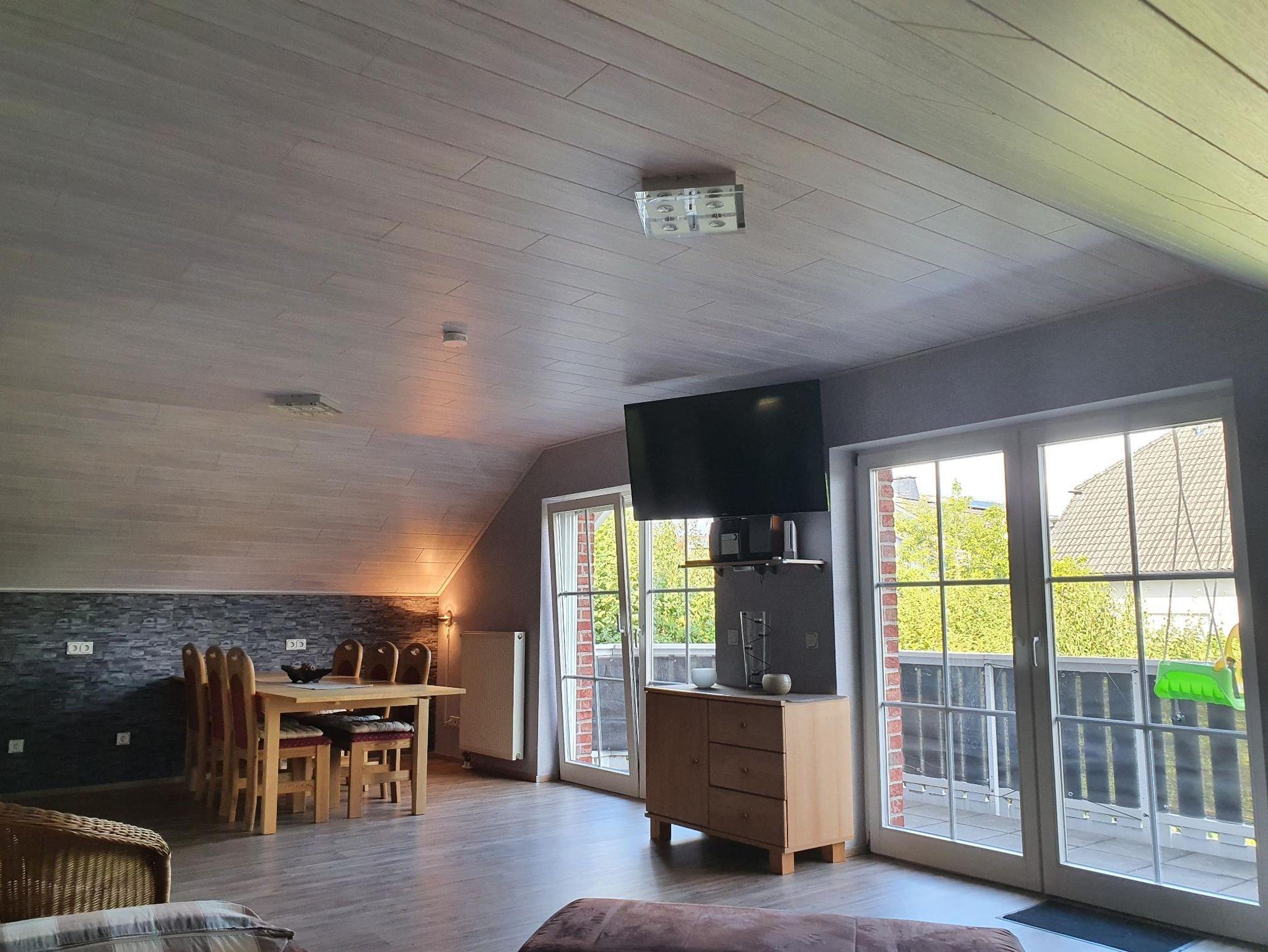 Das großeWohn-/Esszimmer mit Küchenzeile lädt zum Verweilen ein und eignet sich mit seinem großen Balkon, dem Smart TV, der Nintendo Wii und einigen Gesellschaftsspielen für gemütliche Stunden mit der Familie.