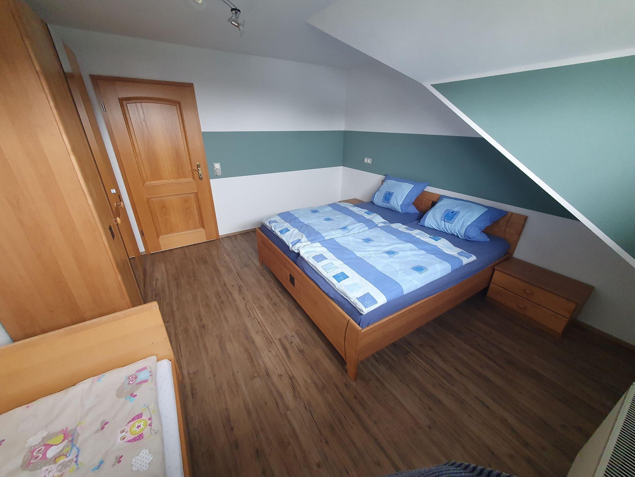 einem Schlafzimmer mit Doppelbett (1,80m x 2,00m) und einem Kinderbett (0.70m x 1,40m).