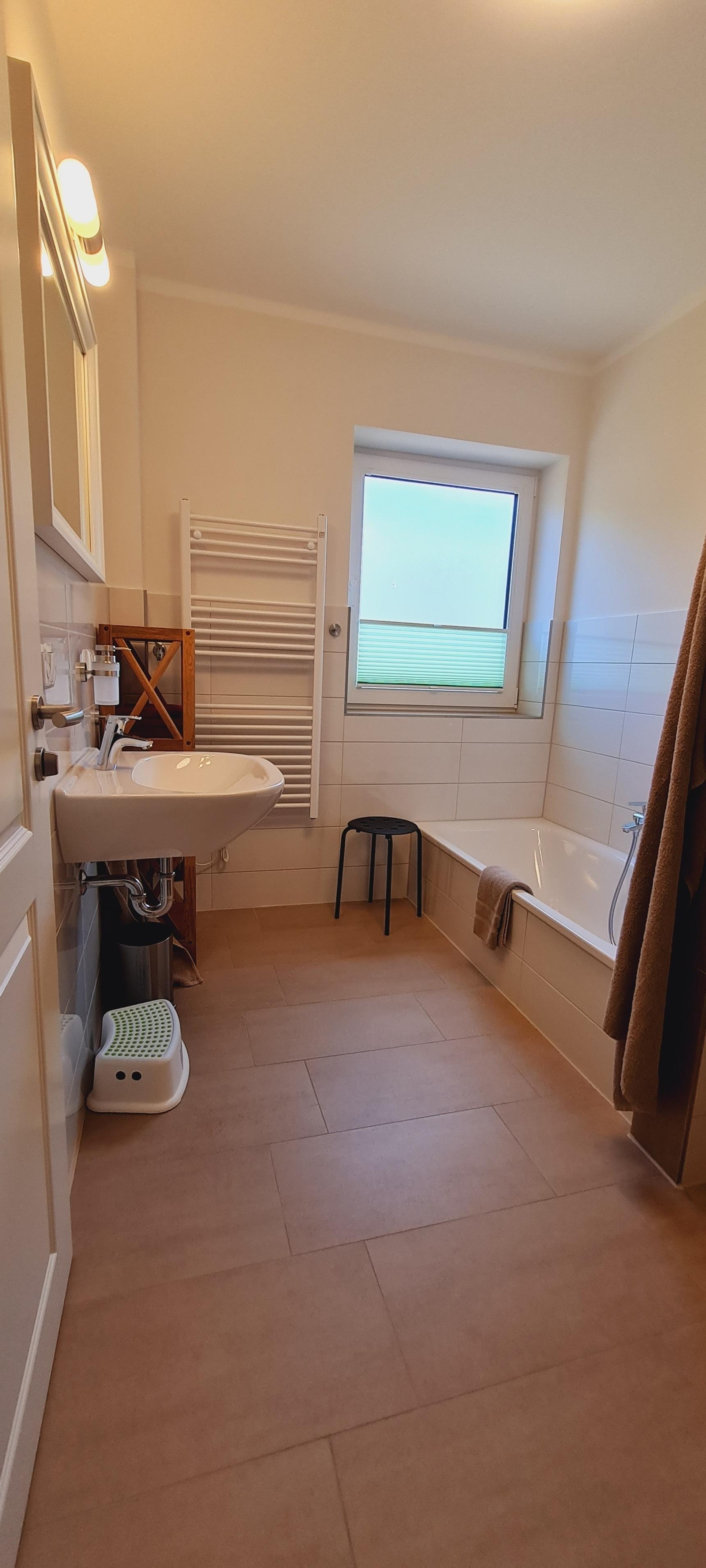 * Badezimmer mit Dusche, Badewanne, Föhn, Handtuchheizung