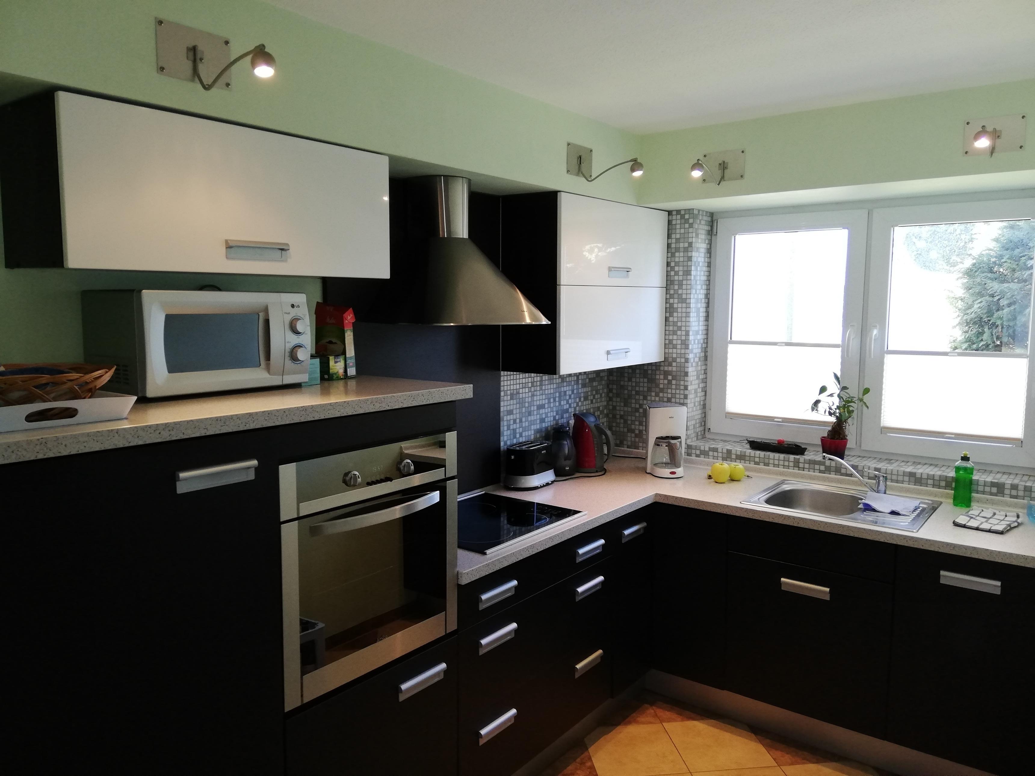 FW oder kleine DHH mit Terrasse und Garten. Die Wohnung bietet Platz für 2 Erwachsene. EG: kleiner Flur, schönes Wohnzimmer mit Sitz- und Essecke, großer Flachbildschirm, Magenta TV auch Radiosender über TV, Netfix etc. mit Anmeldung in Ihrem Account möglich. Küche zum Wohnraum hin offen, komplett ausgestattet: Backofen, Cerankochfeld, sehr leiser Geschirrspüler, Toaster, Mikrowelle, Kaffeemaschine und Nespresso.