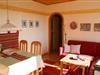 Im hellen Wohn-/Esszimmer mit Küchenzeile befinden sich eine Sofaecke und ein Esstisch mit 4 Stühlen.