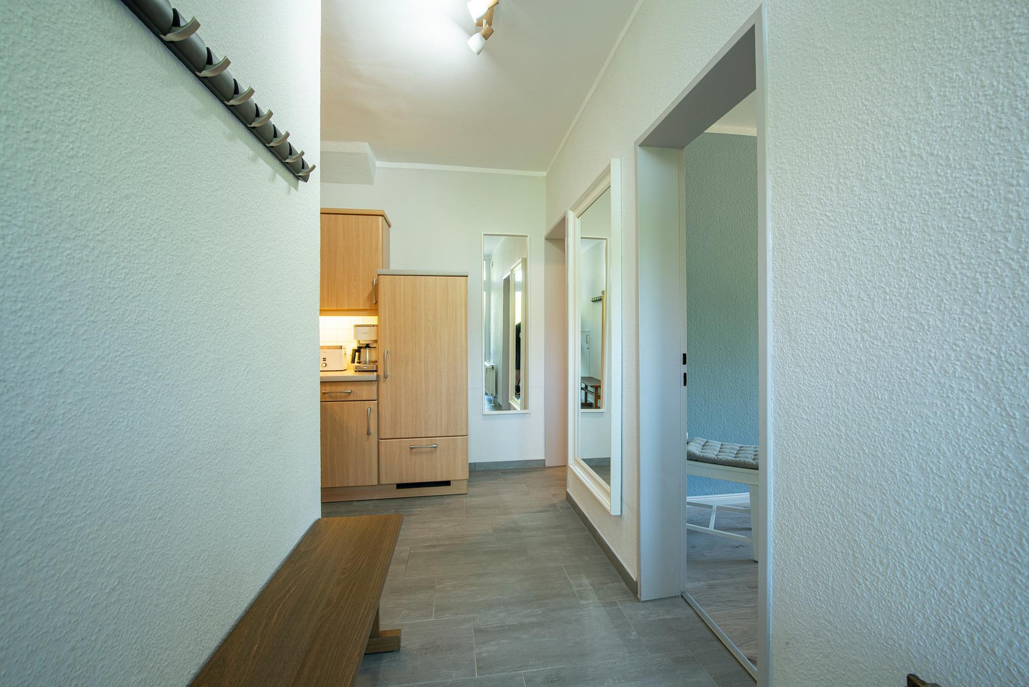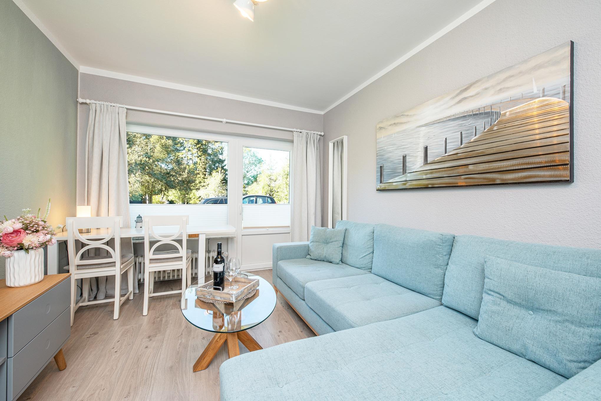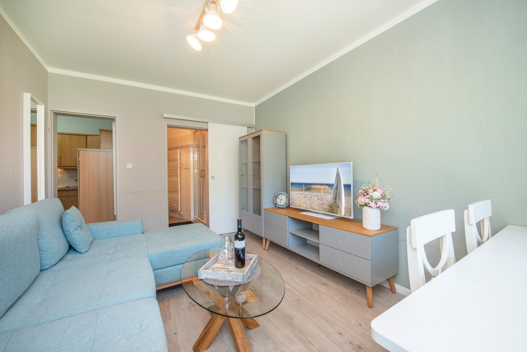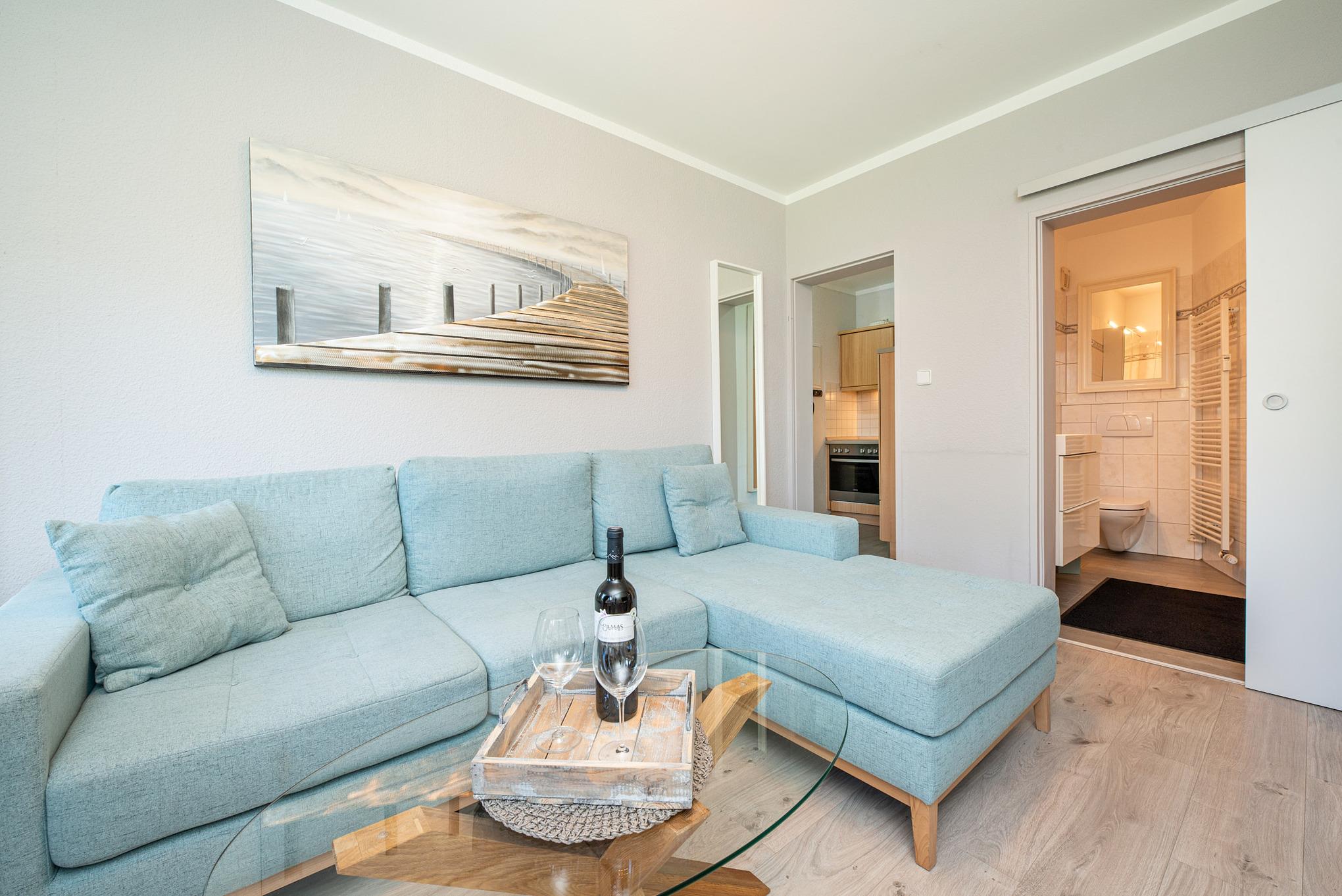 Herzlich Willkommen im Urlaub! Die liebevoll eingerichtete Wohnung wird Sie begeistern. Der schicke Wohnbereich lädt zum Entspannen ein. Machen Sie es sich gemütlich vor dem TV-Gerät - oder genießen Sie im möblierten Gemeinschaftsgarten die gute Seeluft. Dazu hibt es einen schönen Blick ins Grüne. Der Flur- und Küchenbereich ist mit einer praktischen Einbauküche ausgestattet. Im Schlafzimmer befindet sich ein bequemes Doppelbett (160x200 cm, durchgehende Matratze), in dem Sie sicher von Ihren Urlaubstagen träumen werden. Das moderne Badezimmer ist mit einer großen Dusche und einem Handtuchwärmer ausgestattet. Der Fußboden ist mit Laminat und Fliesen ausgelegt. Die ruhige und idyllische aber dennoch zentrale Lage lädt zum Abschalten und Entspannen ein. Der weite Garten sowie die angrenzenden Wanderwege bringen einem die Natur nahe.