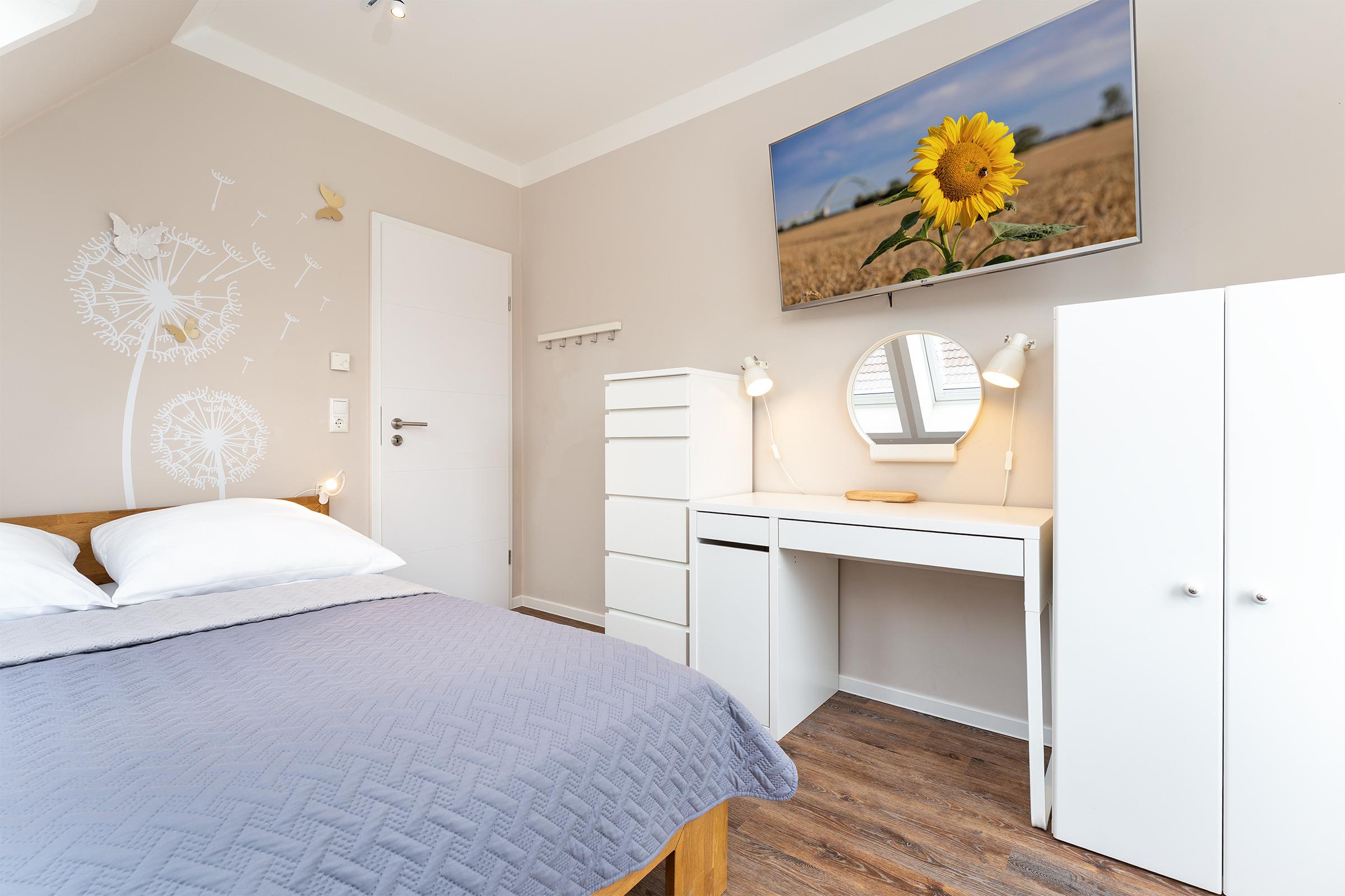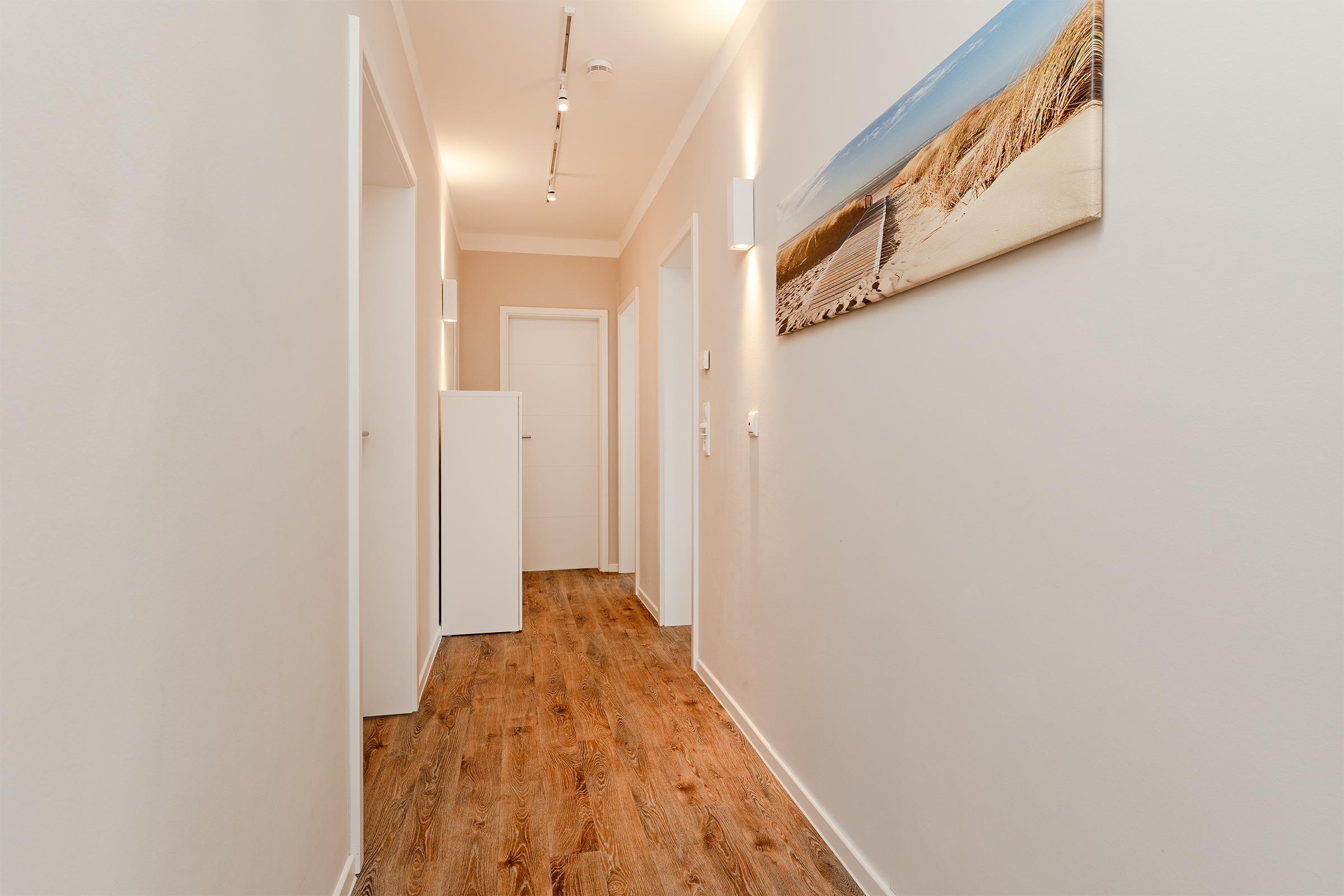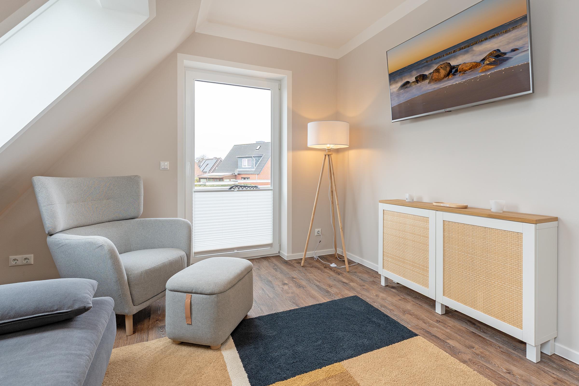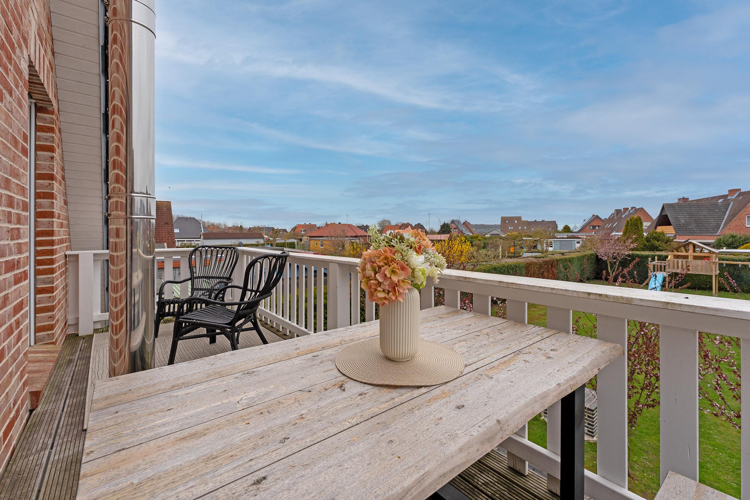 Modern eingerichtete 4-Zimmer-Ferienwohnung im 2. Stock mit Balkon in Burg auf der Sonneninsel Fehmarn bietet auf 78 m² genug Platz für bis zu 5 Gäste.