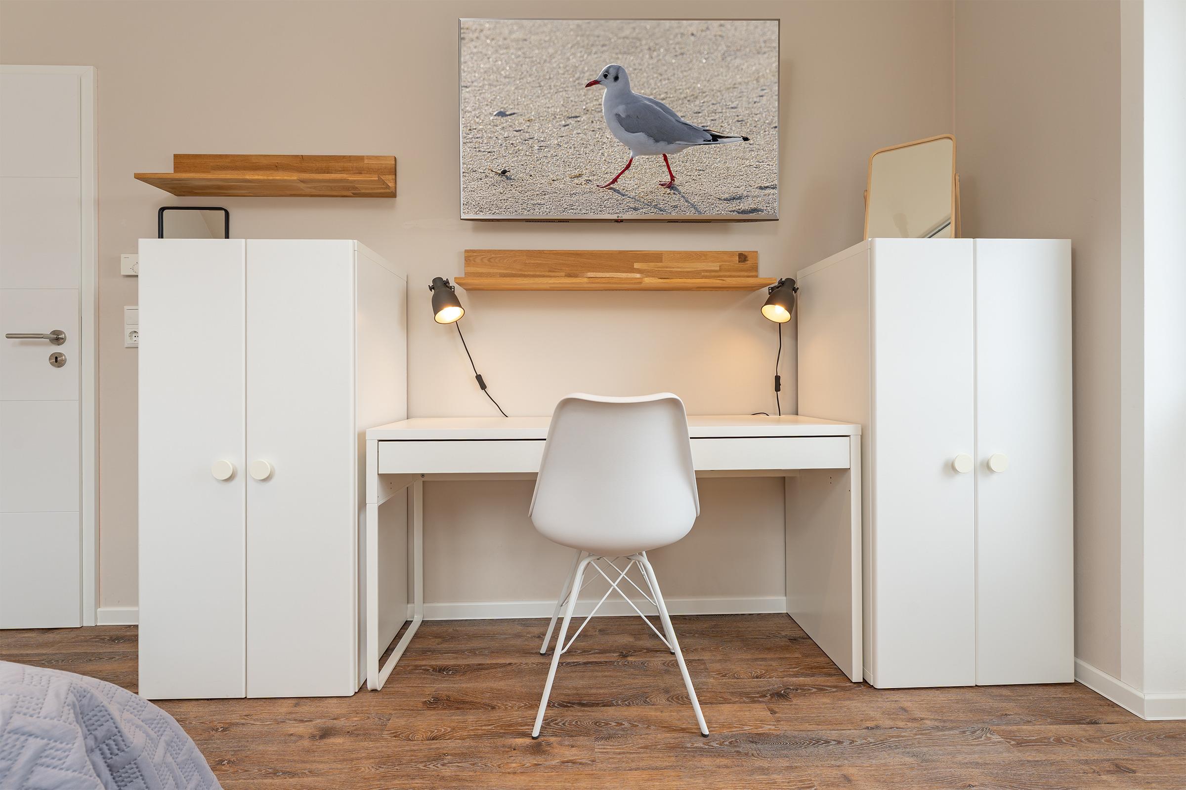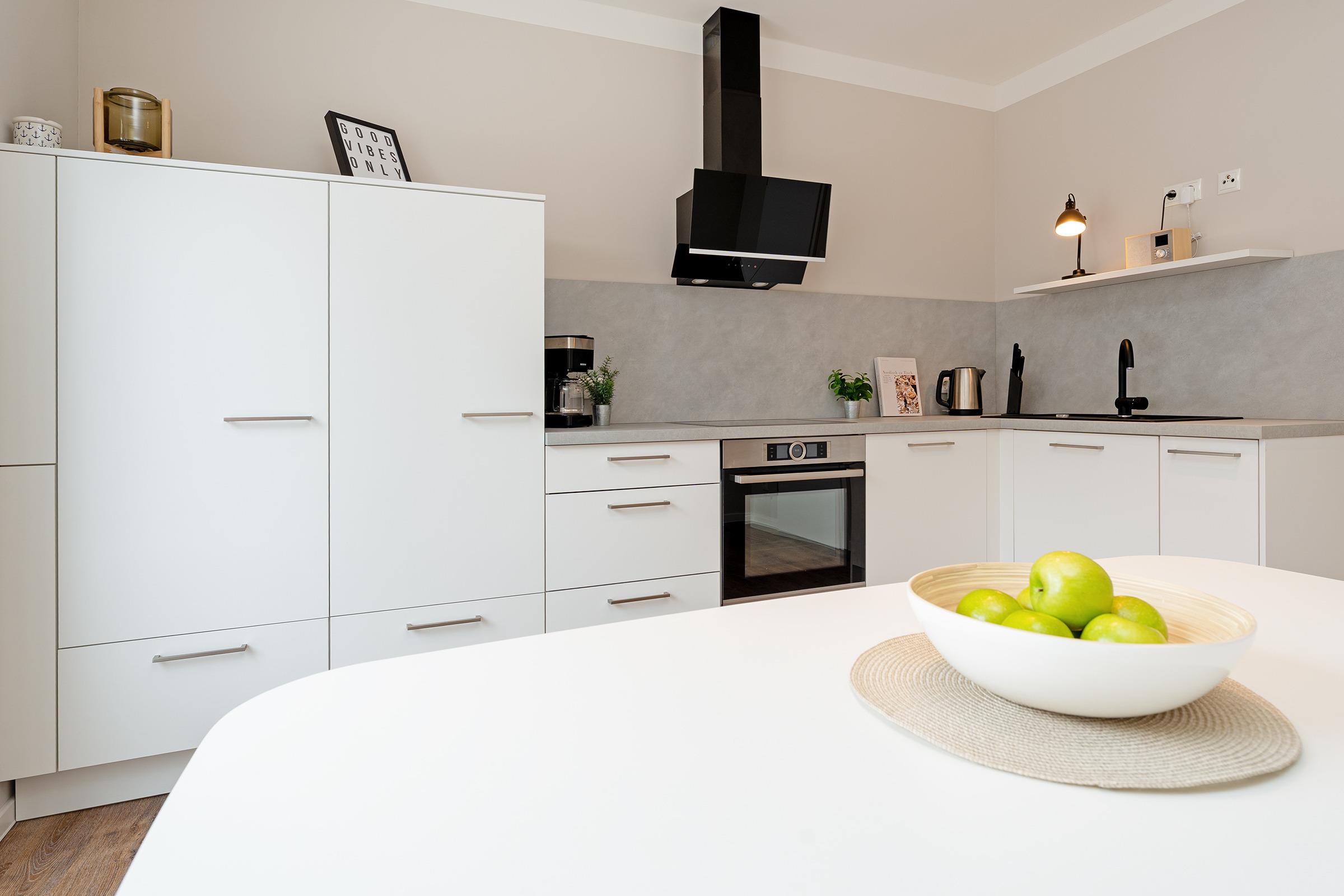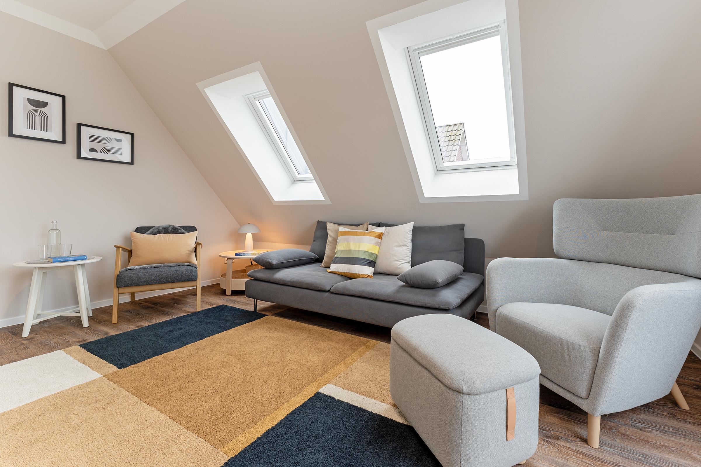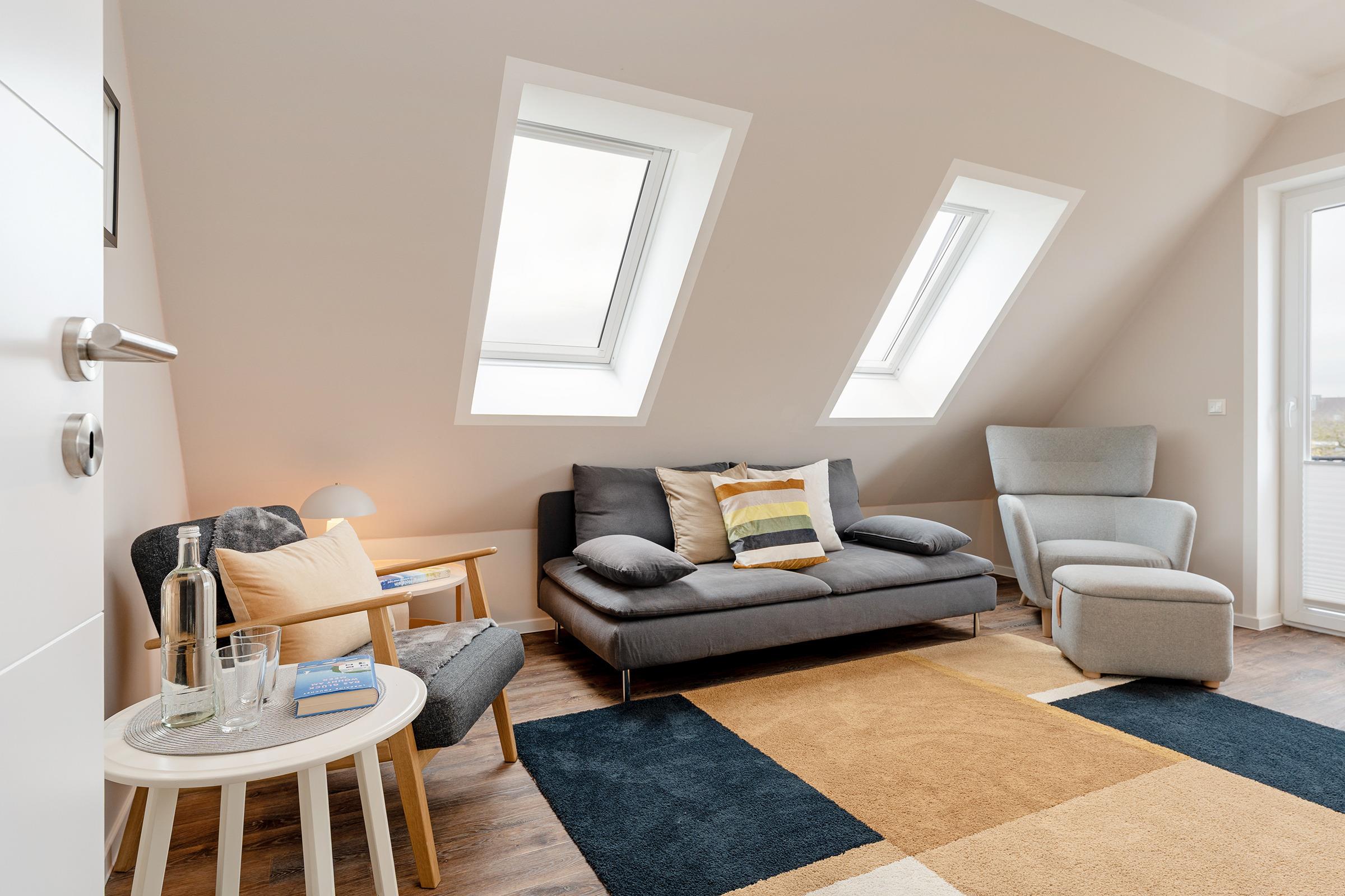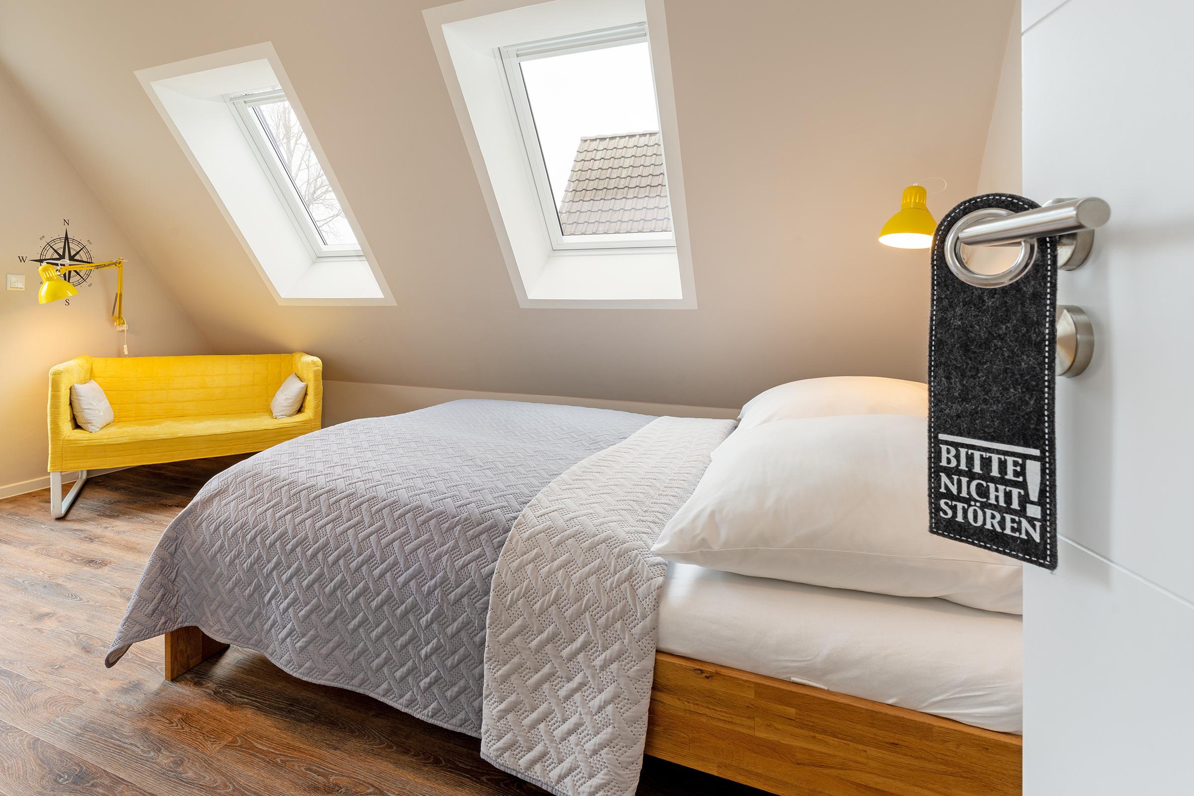 Diese stilvolle Ferienwohnung bildet den perfekten Rückzugsort für Ihren Urlaub. Die moderne Einrichtung gepaart mit dem Charme einer Dachgeschoss-Wohnung eignen sich ideal für Familienurlaube oder Remote Work. Das gemütliche Wohnzimmer lädt zum Verweilen ein, auch haben Sie hier Zutritt auf den möblierten Balkon, auf dem Sie die Sonne genießen können. Die moderne, sehr gut ausgestattete Küche bietet alles, was der Herz begehrt, sodass Sie sich wie zu Hause fühlen können. In den drei komfortablen Schlafzimmern, zwei mit einem Doppelbett und eins mit einem Einzelbett, finden Sie erholsamen Schlaf. Alle Schlafzimmer sind mit einem modernen Schreibtisch ausgestattet - somit eignet sich dieses Feriendomizil auch perfekt für das fokussierte Arbeiten oder die vielen bekannten Online-Meetings während einer Workation. Ein modernes Badezimmer mit begehbarer Regendusche darf natürlich auch nicht fehlen. Elektrische Außenrollläden sind an allen Fenstern, auch den Dachfenstern, vorhanden. Die Unterkunft liegt in einer ruhigen Wohngegend. Sowohl das Zentrum von Burg als auch der Hafen in Burgtiefe sind bequem zu Fuß erreichbar. Sie können also problemlos die Vorteile der Stadt und den Trubel des Hafens genießen.