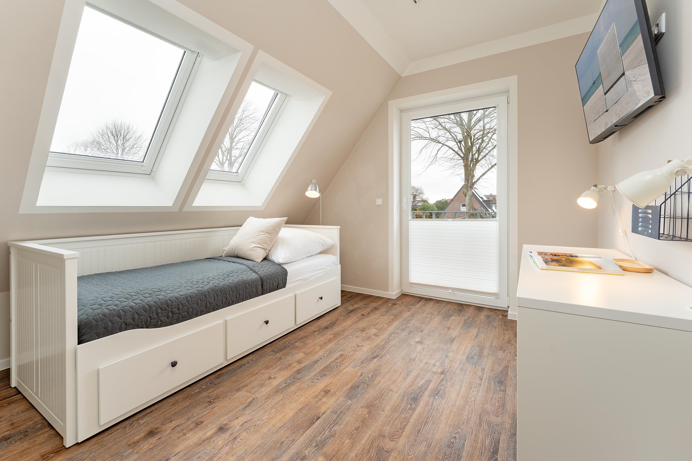 Schlafzimmer 3: 1 Einzelbett, Verdunkelung: elektronische Außenjalousien, Kleiderschrank, TV, Platz für ein Babybett vorhanden
