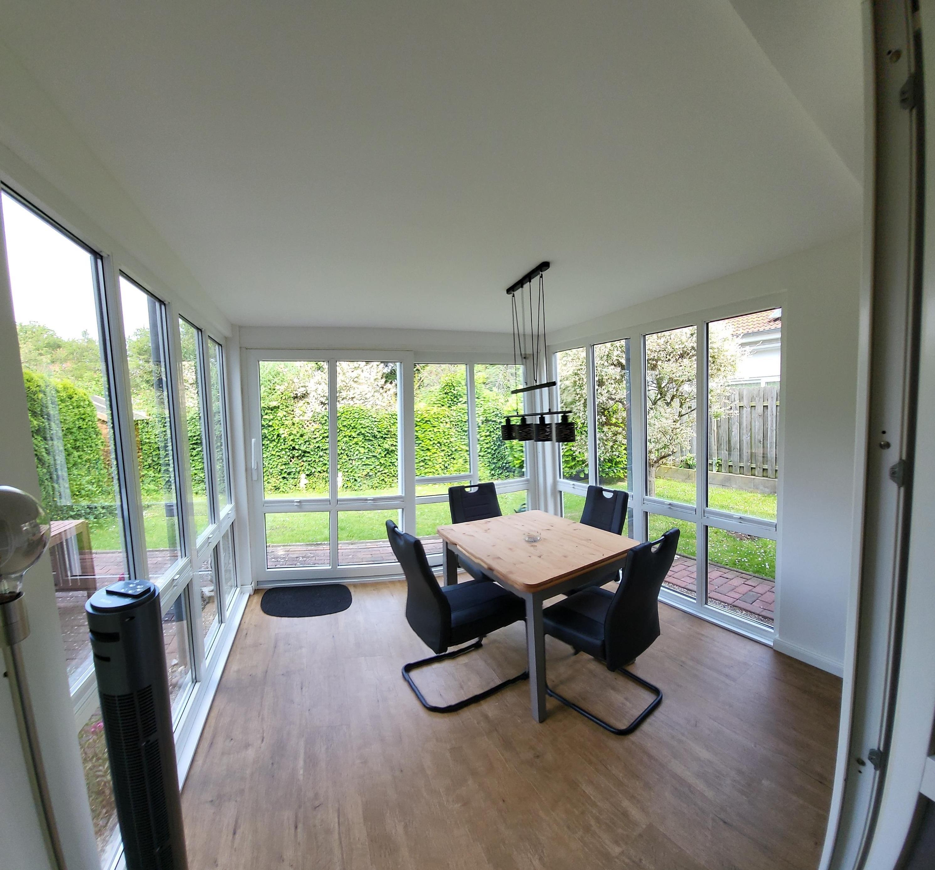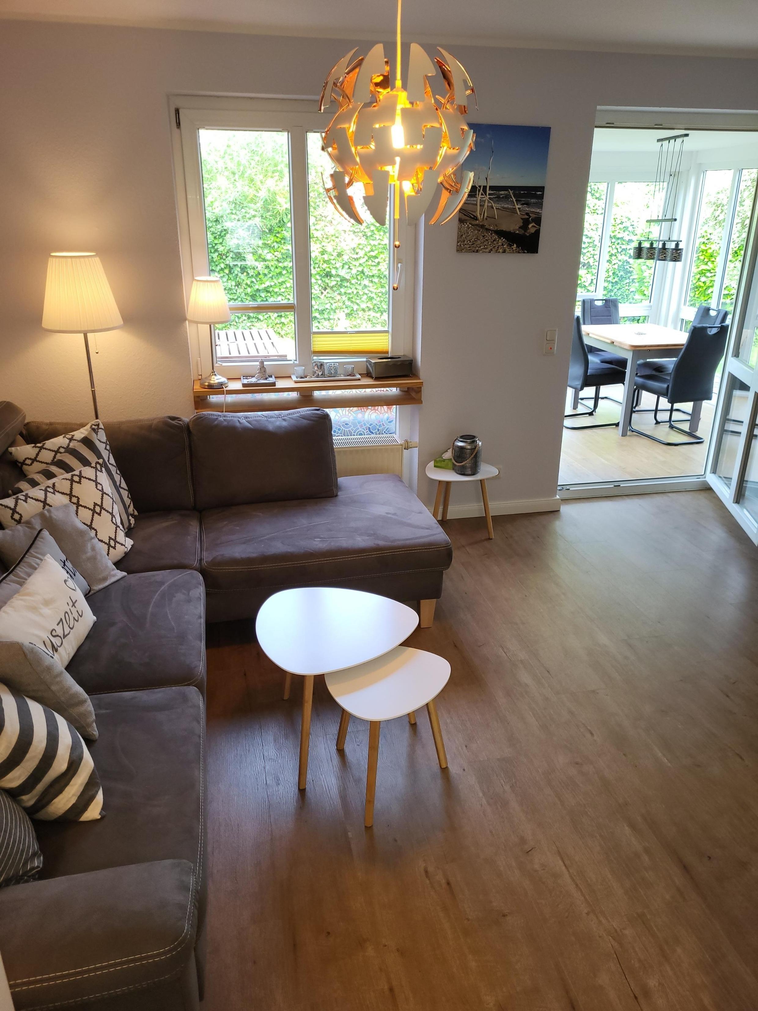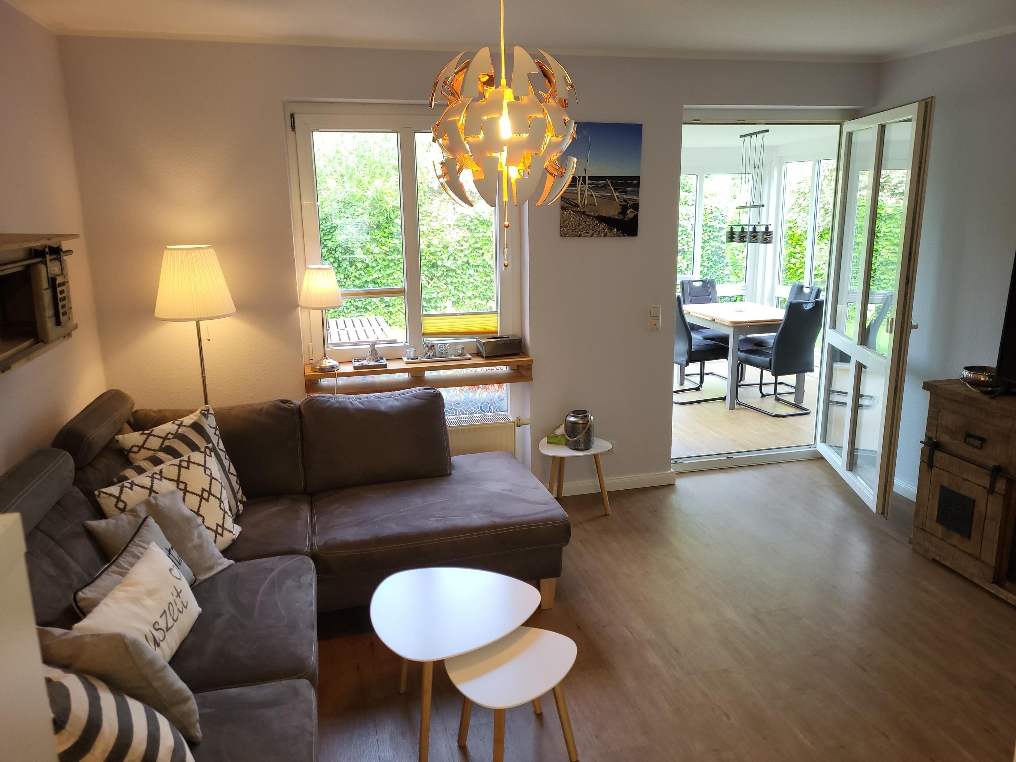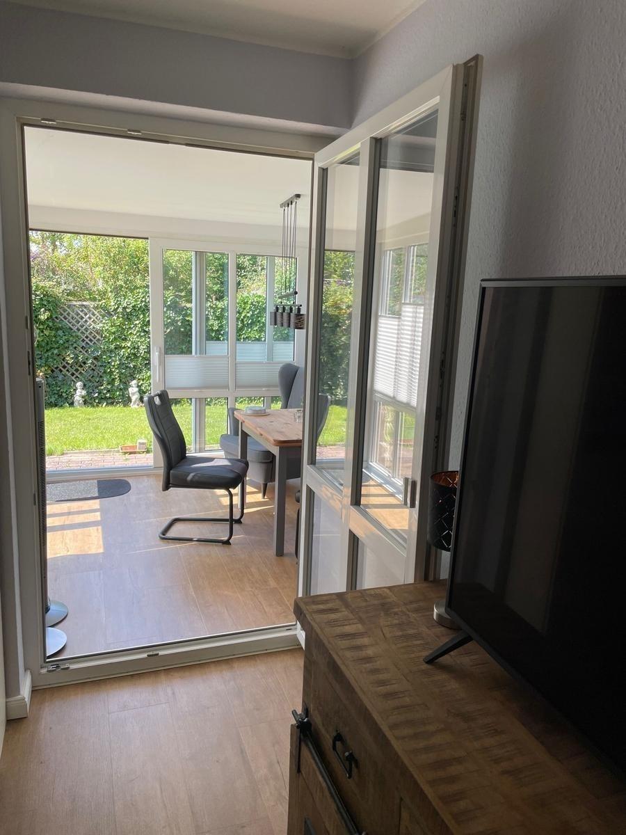 Ebenfalls vom Flur aus kommen Sie in das Wohnzimmer, hier gibt es eine Schlafcouch von 140 x 200 cm, und einen Smart TV. Die vollständige ausgestattete Küche mit Kühl- / Gefrierschrank, Backofen, Ceranfeld und Geschirrspüler ist zum Wohnbereich hin offen gestaltet und vor dem Wohnzimmer befindet sich der Wintergarten der als Essplatz ausgestattet ist.