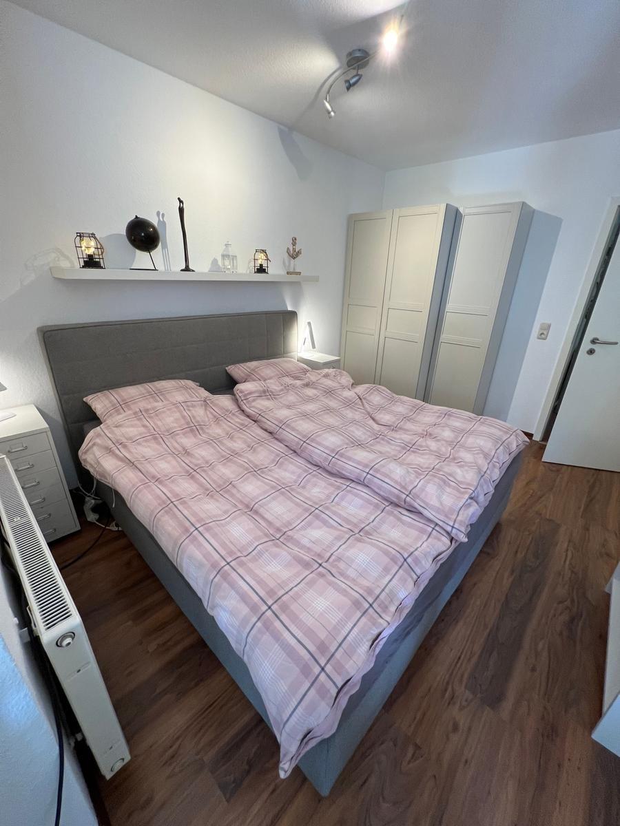 Vom Flur aus erreichen Sie das Schlafzimmer, welches mit einem Boxspringbett und einem durchgehenden Topper von 180 x 200 Meter ausgestattet ist, einen Kleiderschrank und einen Fernseher.