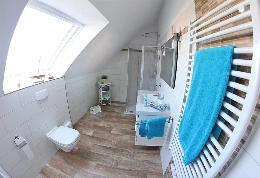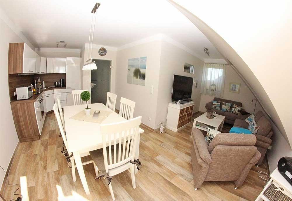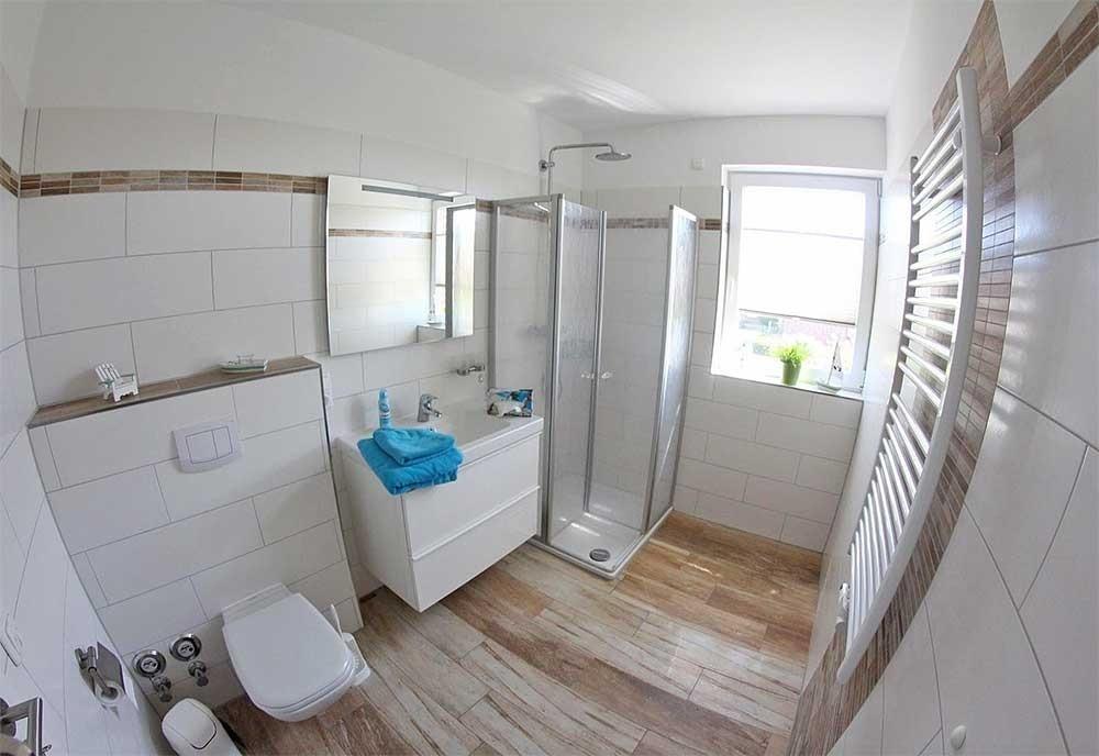 Im unteren Bereich der Wohnung befinden sich zwei Schlafzimmer, (beide verfügen über einen Flachbild-TV) sowie ein Duschbad, sodass jeder nach einem schönen und geselligen Abend in seinen vier Wänden, alternativ im gemeinsamen Wohnbereich, die wohlverdiente Ruhe genießen und den Tag ausklingen lassen kann. Im Studio im DG gibt es ein Doppelbett (1,80 x 2,00 m), ein zweites Duschbad und ausreichend Schränke sind vorhanden. Durch dies geräumige Studio im zweiten Obergeschoss, das mit einer gemütlichen Couch und einem Flachbild-Fernseher ausgestattet ist, können auf insgesamt 95 qm zwei Familien oder auch mehrere Generationen gemeinsam Urlaub machen, ohne auf einen eigenen Rückzugsbereich verzichten zu müssen. Der Wohnbereich unterteilt sich in ein großzügiges Wohnzimmer, eine komplett eingerichteten Küchenzeile und einen Essbereich, dessen Tisch bei Bedarf noch vergrößert werden kann. Der Wohnraum ist mit einer Couchgarnitur gemütlich und stilvoll eingerichtet, er verfügt ebenfalls über einen 46 Zoll Flachbildfernseher, einen CD-Spieler mit Radio und Bluetooth und einen DVD-Player. WLAN ist vorhanden. Die Küchenzeile im Wohnraum ist komplett ausgestattet mit Kühlschrank und Gefrierfach, Ceranfeld, Backofen, Mikrowelle, Kaffeemaschine, Wasserkocher, Mixer und einem Stabmixer sowie diversen Auflaufformen und einem Elektrogrill. Es sind ausreichend Geschirr und Besteck sowie die verschiedensten Küchenhelfer vorhanden. Die beiden geräumigen Badezimmer verfügen jeweils über eine Dusche. Einen Fön finden Sie im Waschbeckenunterschrank.