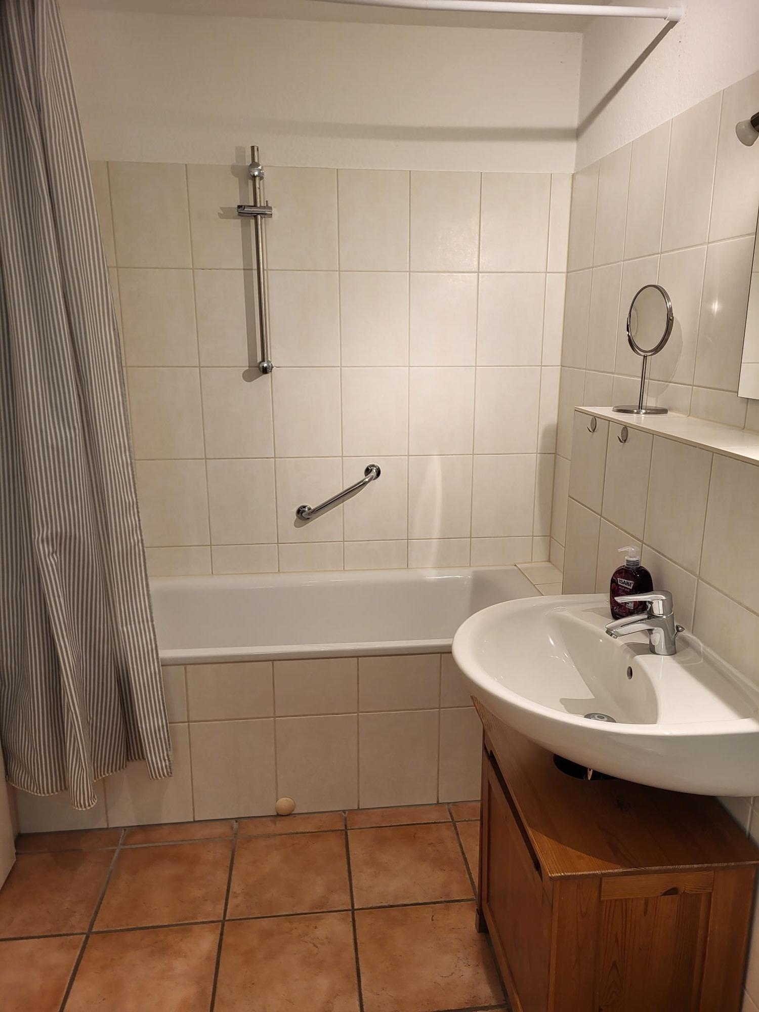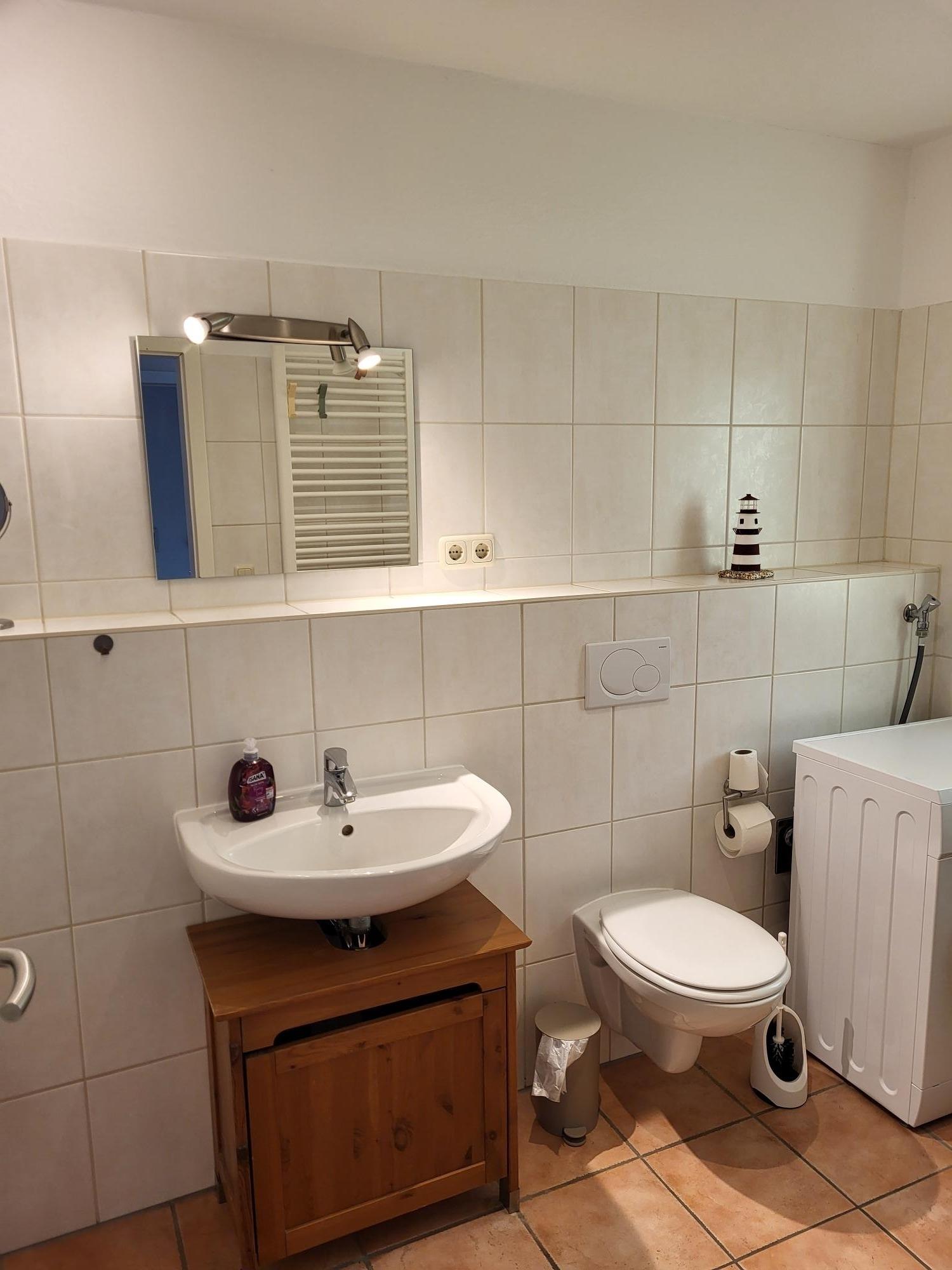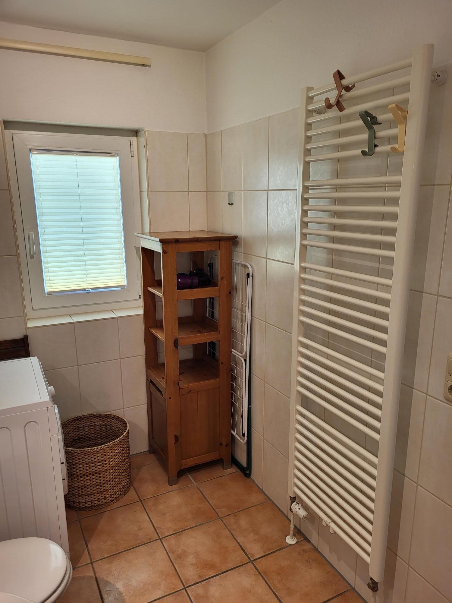 Ferner ein großes Badezimmer mit Wanne, Fußbodenheizung und Waschmaschine.