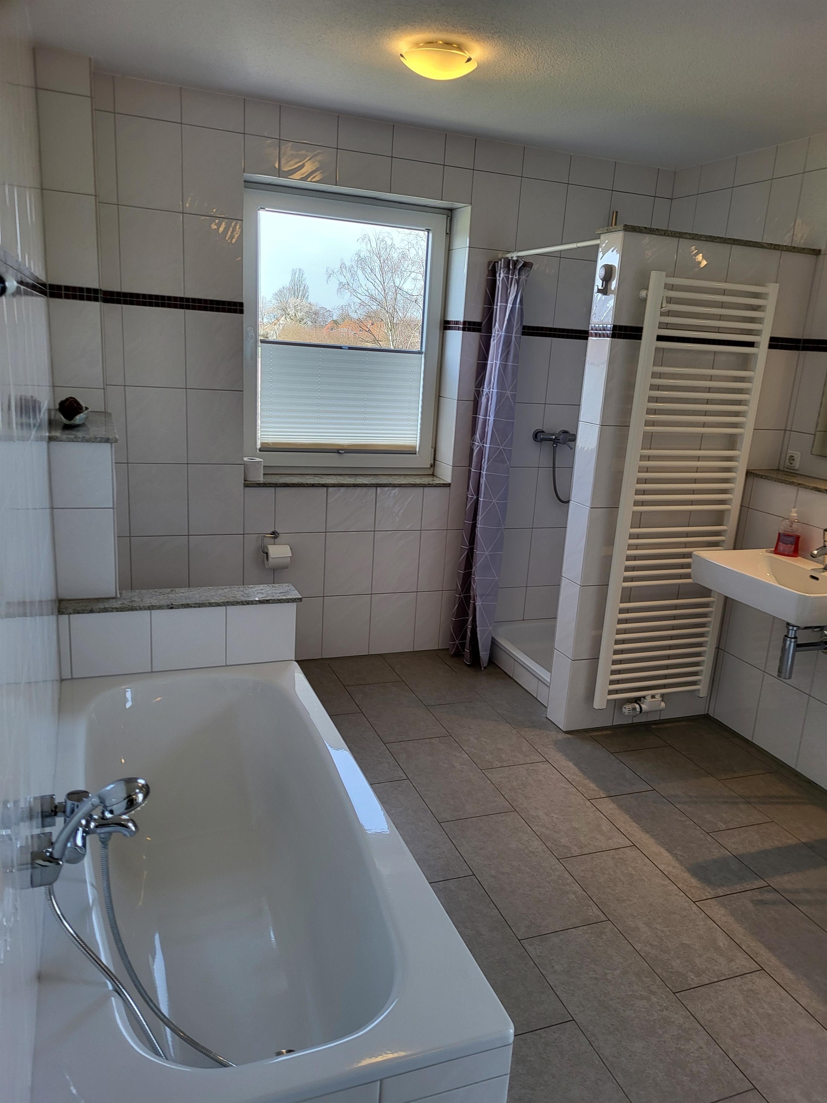 Im Obergeschoss finden sie 2 helle Schlafräume mit Doppelbetten, 1 großes Komfortbad mit Dusche, Badewanne , Doppelwaschbecken und Saunabereich sowie Waschmaschine und Wäschetrockner.