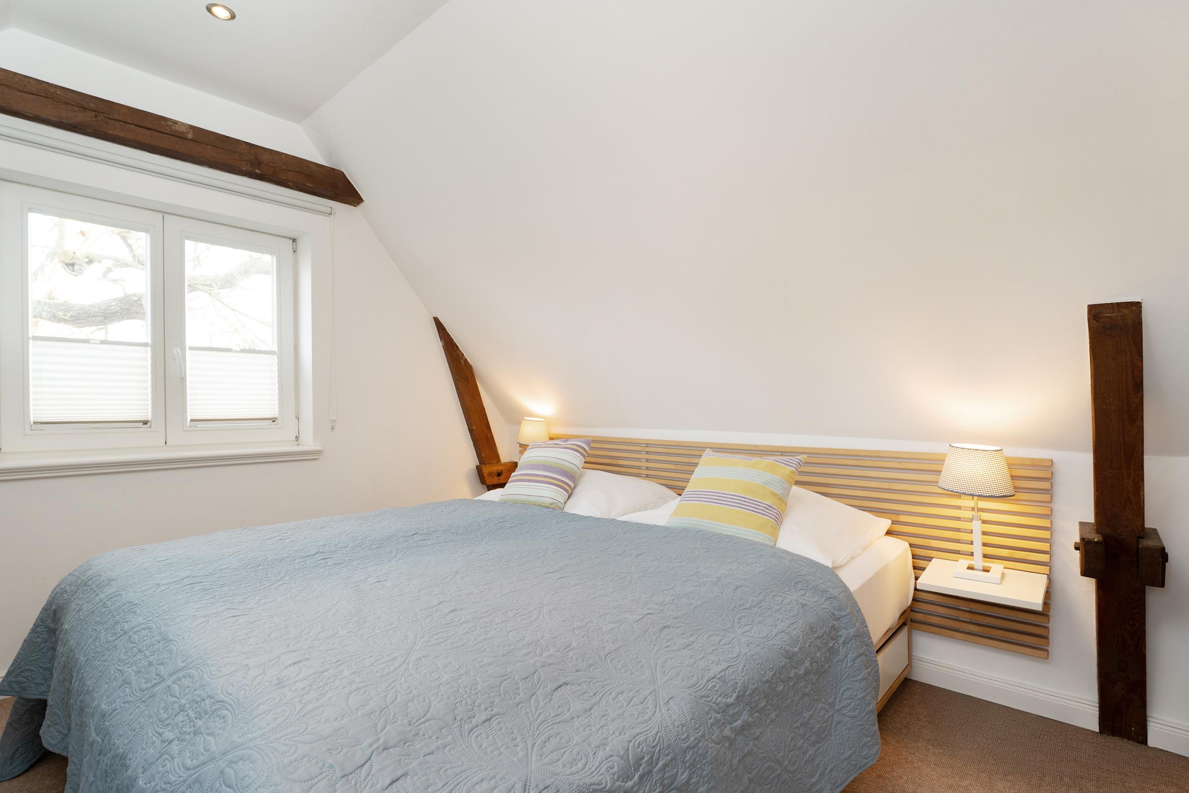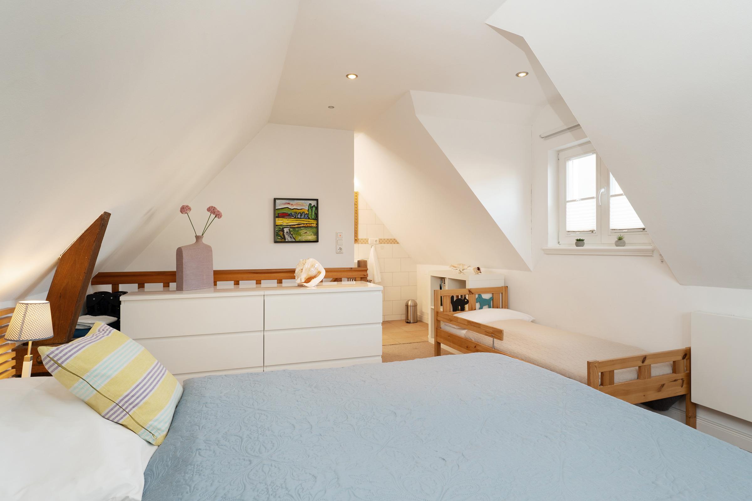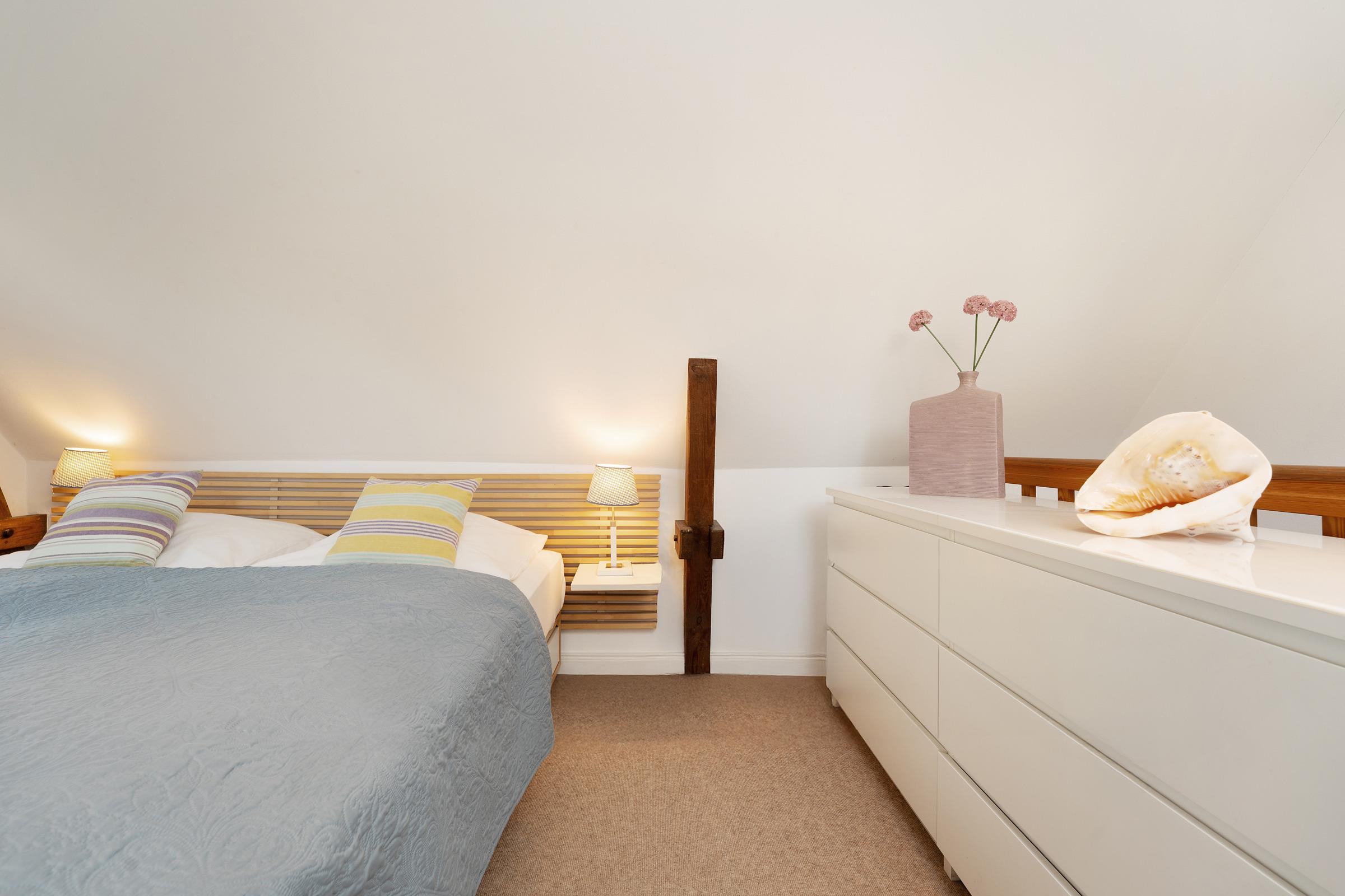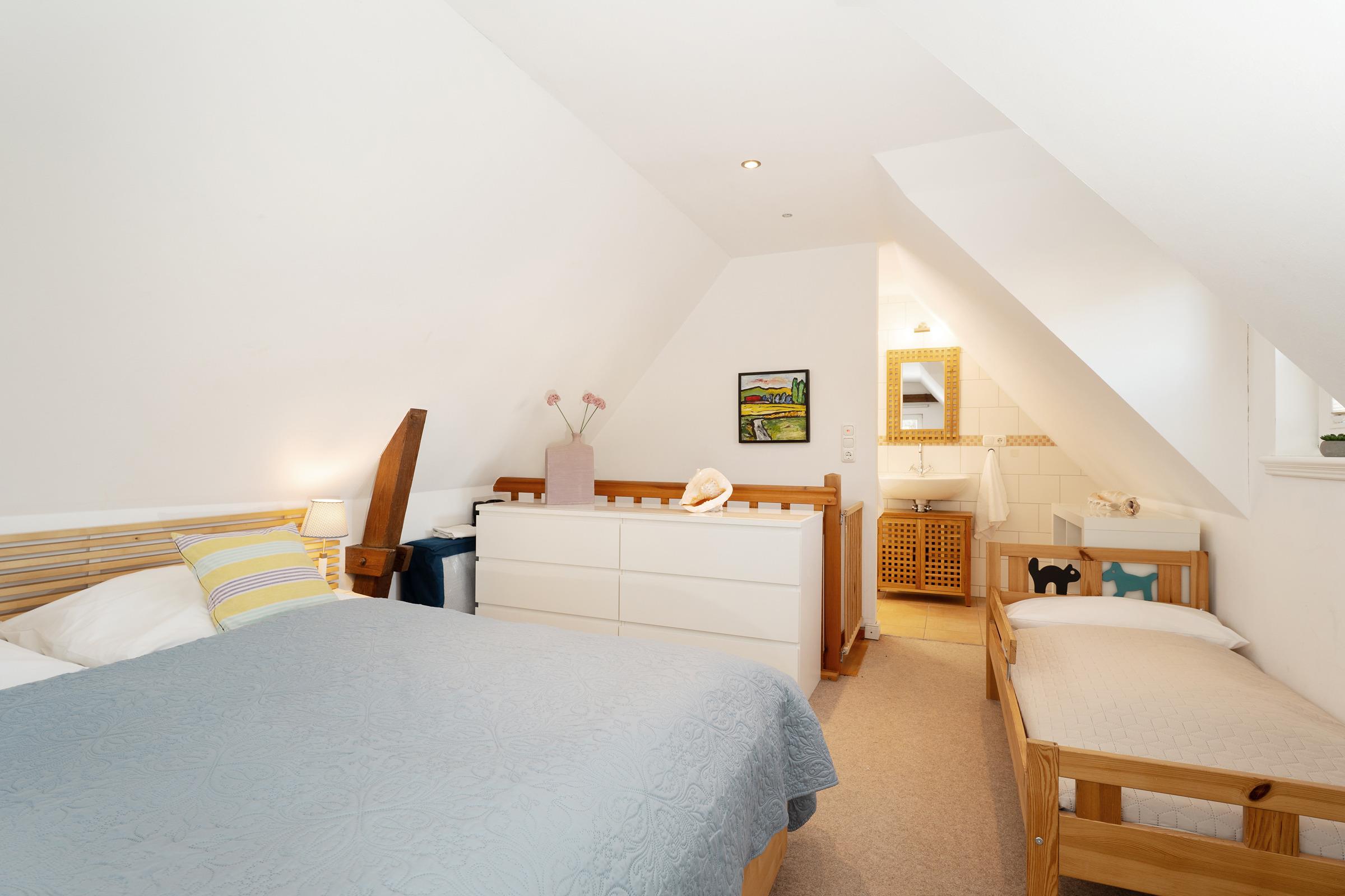 Das Schlafzimmer im 1. OG lädt mit behaglicher Atmosphäre zum Erholen ein, im modernen Duschbad en Suite starten Sie frisch in den Tag. Ein Kinderreisebett und ein Hochstuhl stehen zur Verfügung.