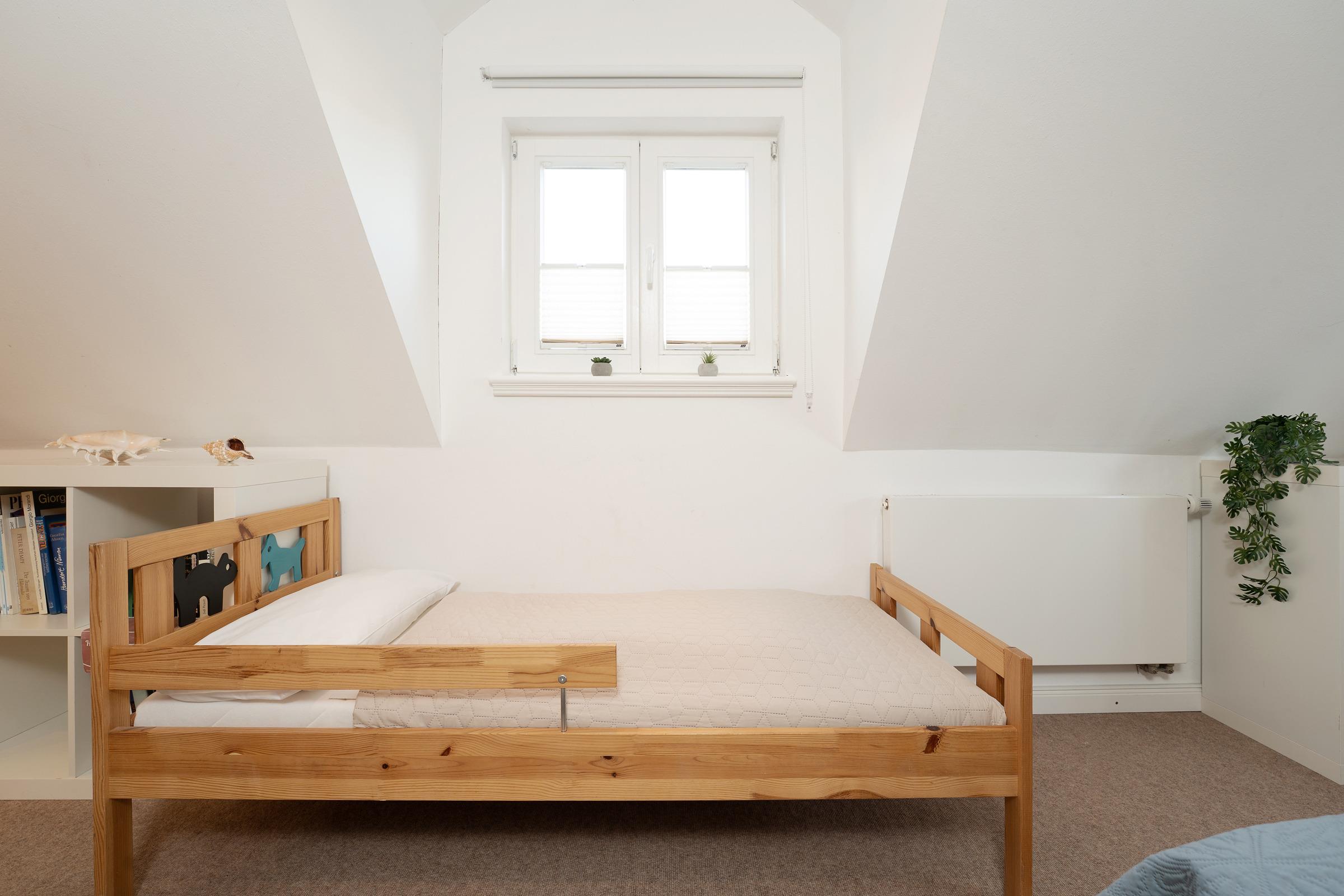 Schlafzimmer (1.OG): 1x Doppelbett (180 x 200 cm) mit durchgehender Matratze und 1x Einzelbett, Kleiderschrank, Verdunkelung: Plissee, Platz für ein Babybett vorhanden