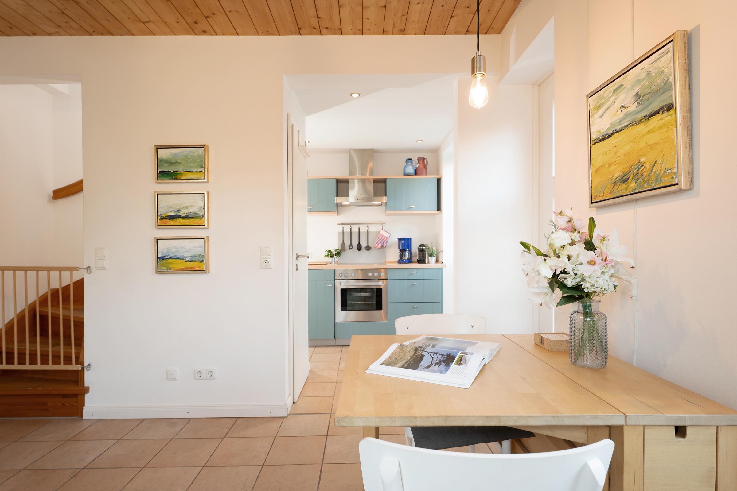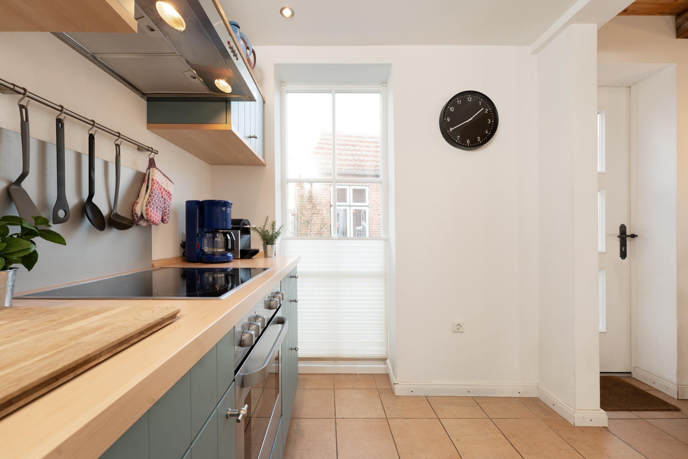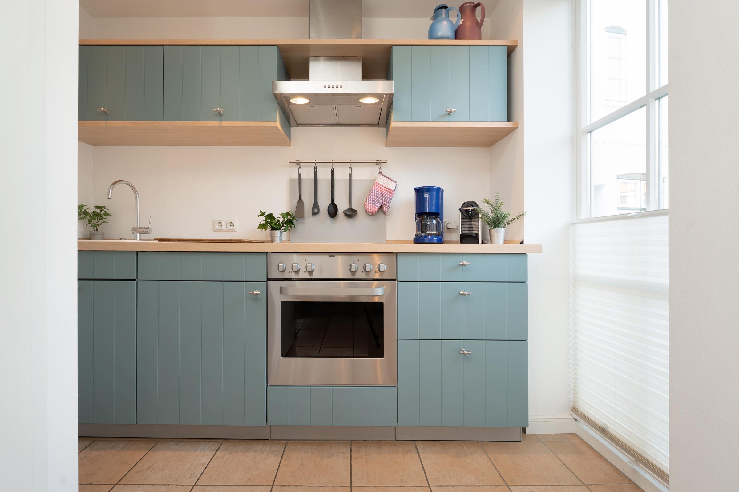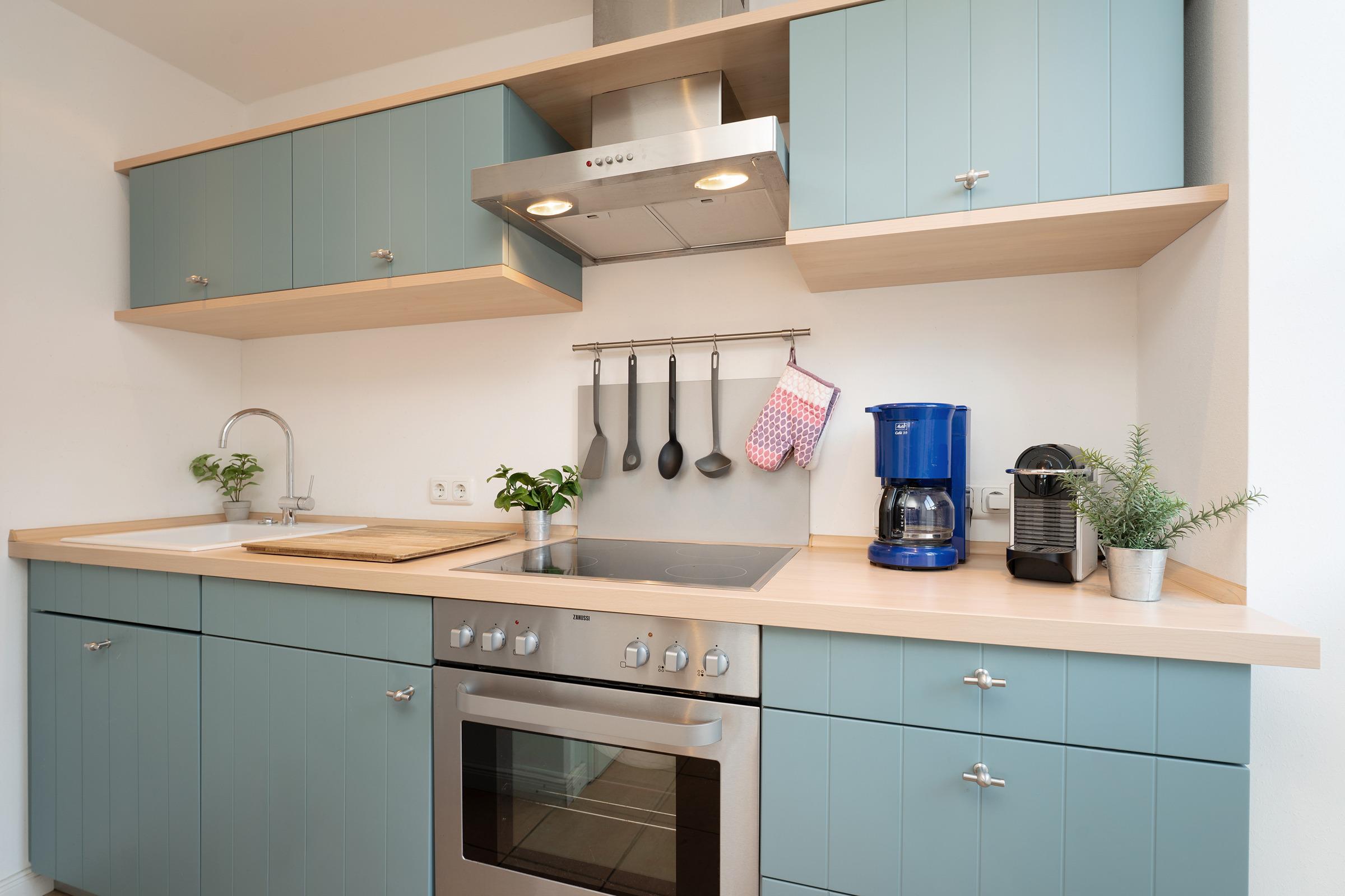 Im eingezäunten Gemeinschaftsgarten warten zudem Schaukel und Sandkasten auf die kleinen Gäste. Ein Kohlegrill ist ebenso vorhanden. Anschließend führt der Weg in die praktische Küchenzeile mit Nespresso-Kapselmaschine, die komplett für die unkomplizierte Selbstversorgung ausgestattet ist.