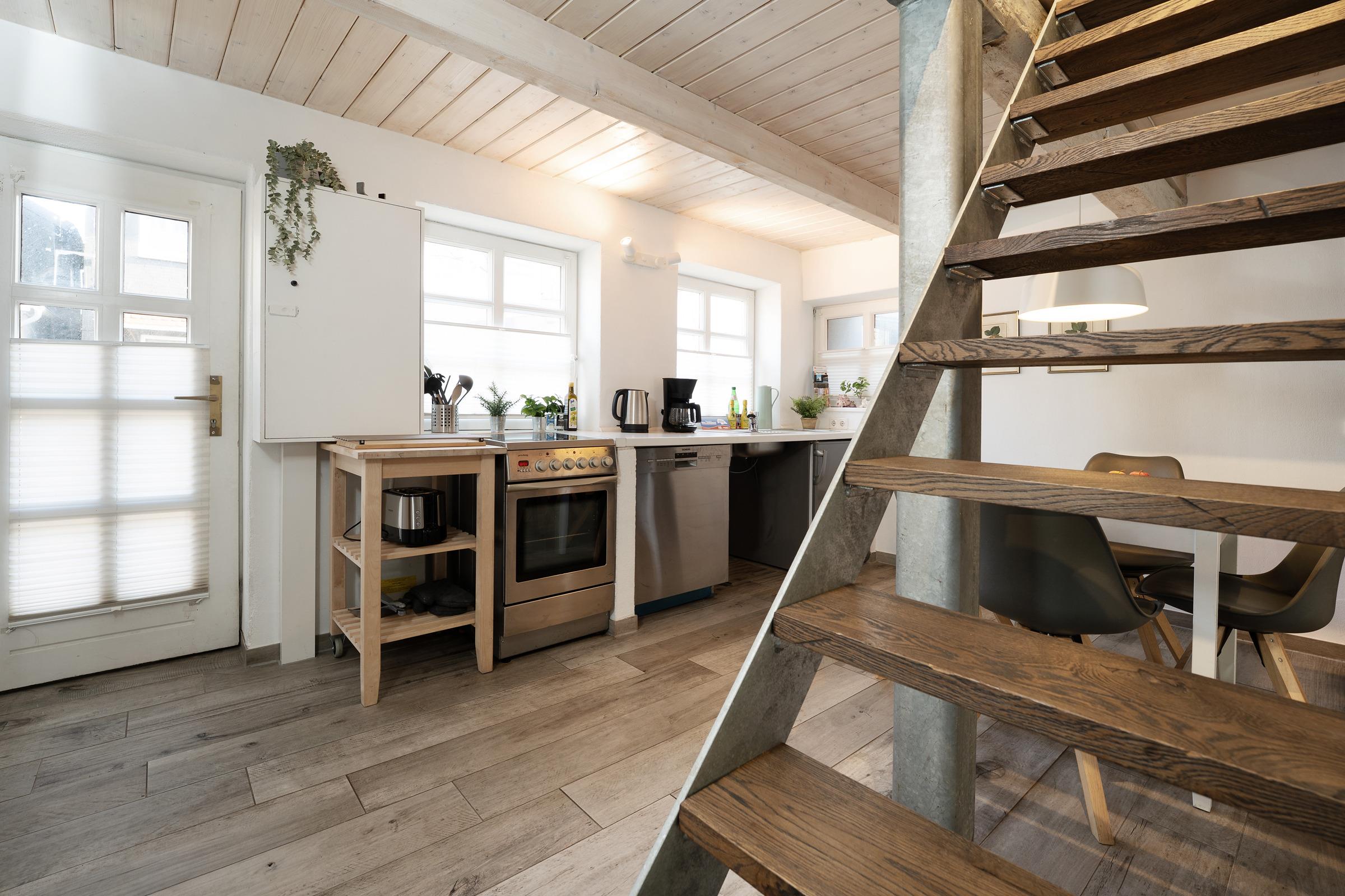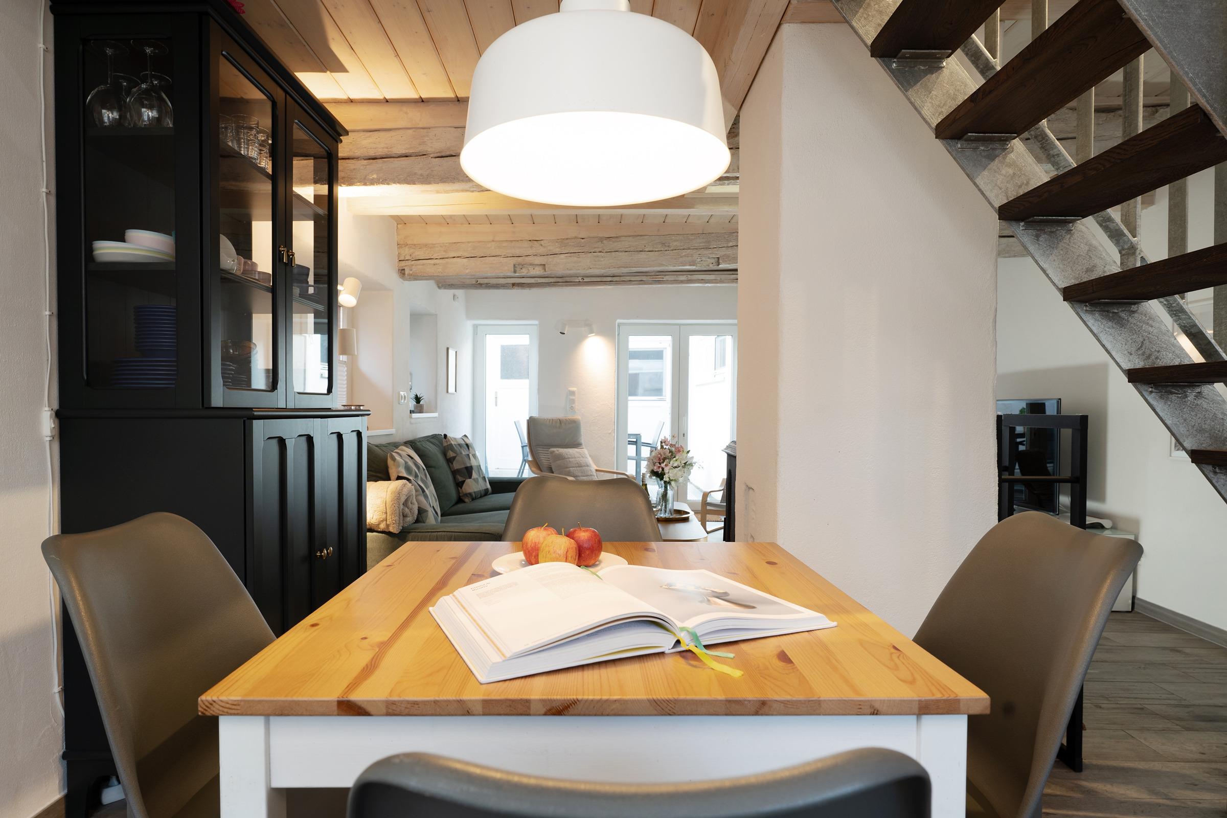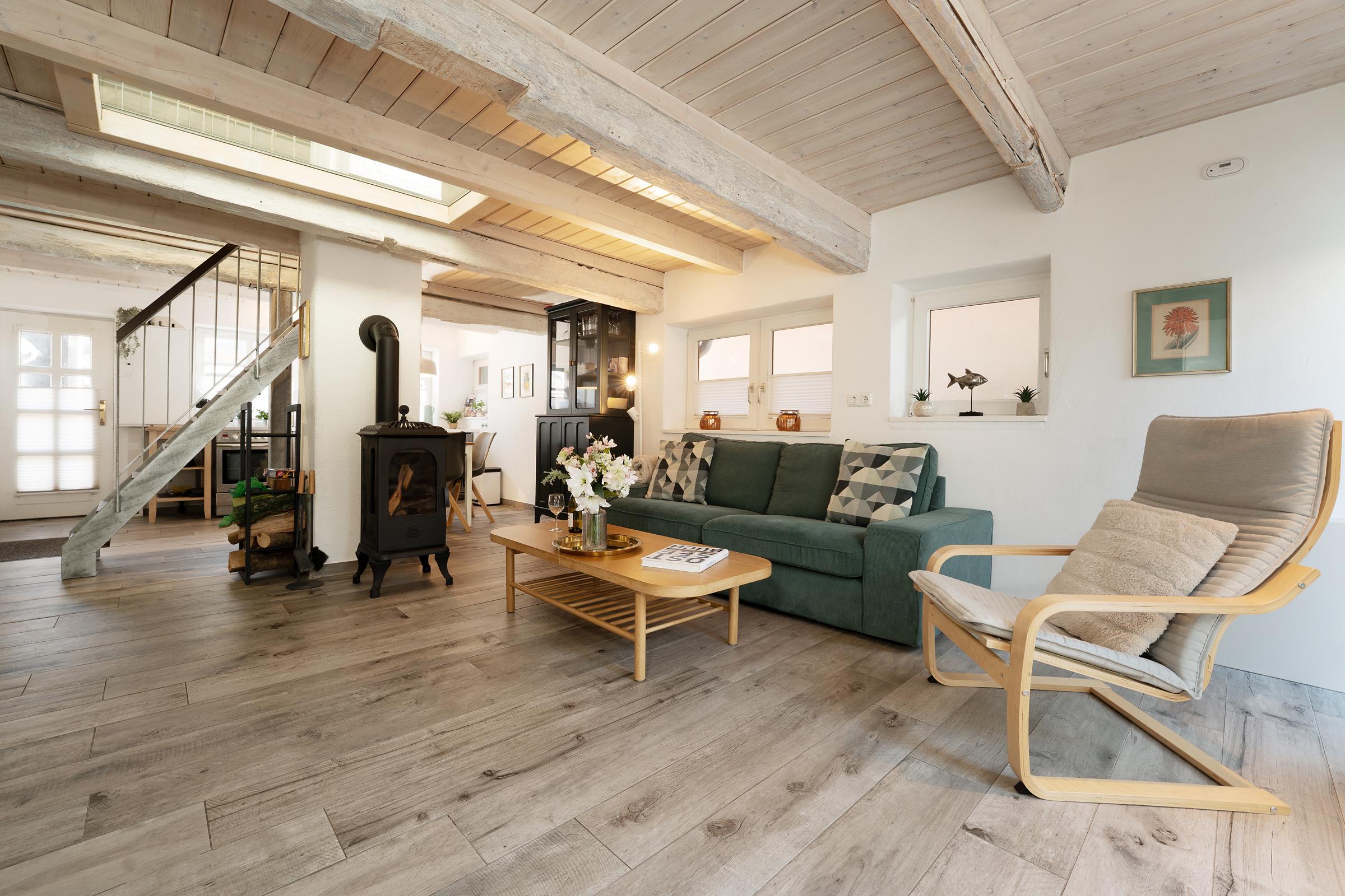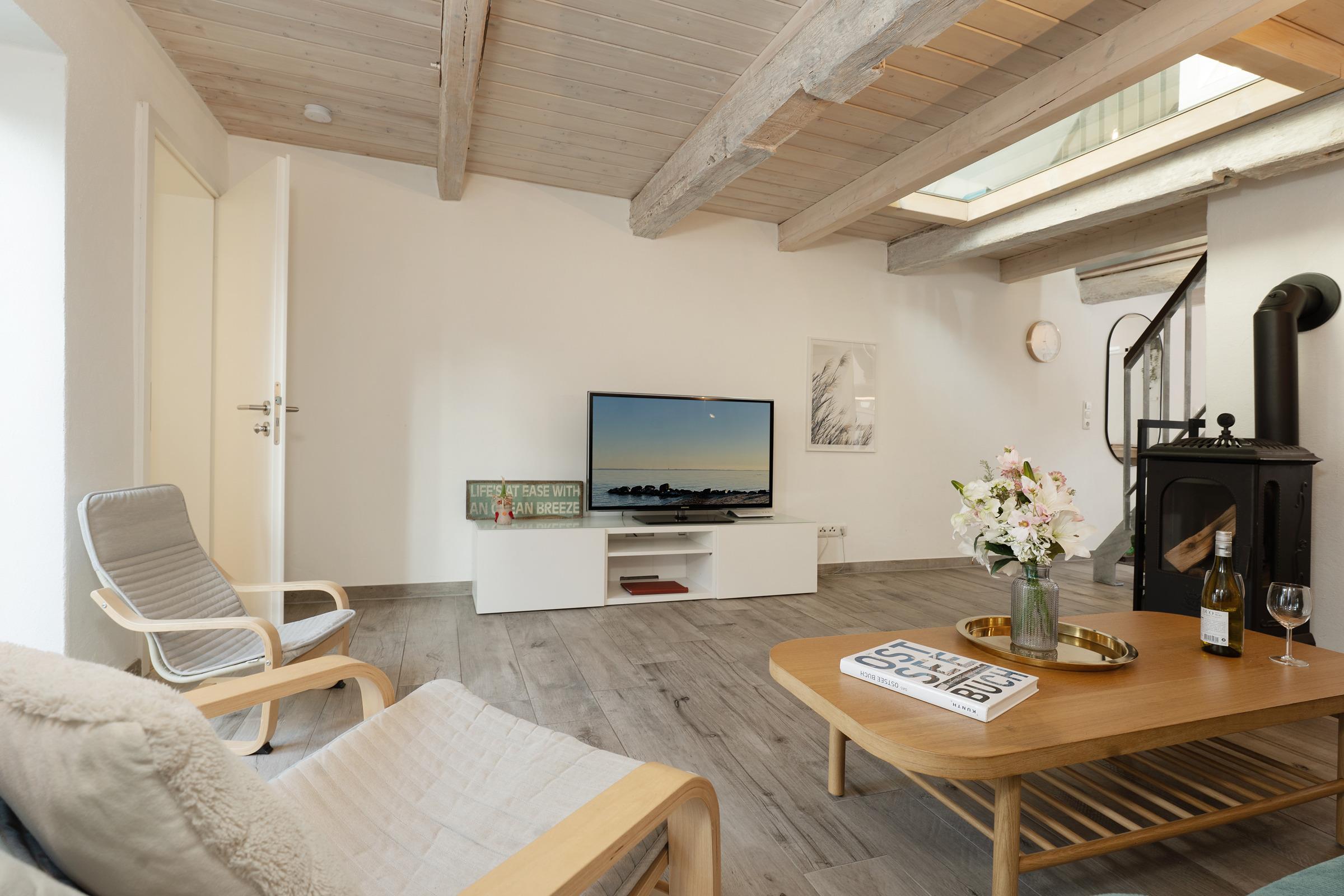 Der Rundgang beginnt im hellen Wohnbereich, der mit Fernseher und einem behaglichen Kaminofen zum Verweilen einlädt. Vom Wohnraum aus treten Sie direkt auf die West-Terrasse, die mit Gartenmöbeln und Elektrogrill ausgestattet ist – perfekt für entspannte Stunden im Freien. Weiter geht es in die gut ausgestattete Küchenzeile mit Backofen, Herd (4 Ceran-Kochfelder), Geschirrspülmaschine, Kühlschrank, Toaster, Wasserkocher und Kaffeemaschine - ein einladender Essbereich schließt sich direkt an.