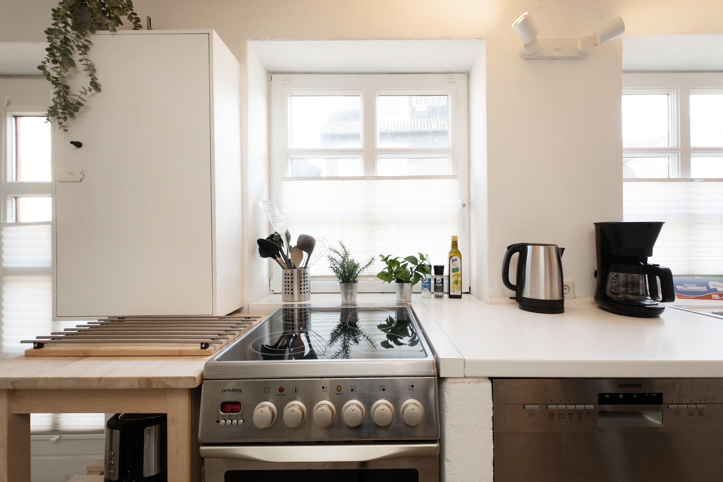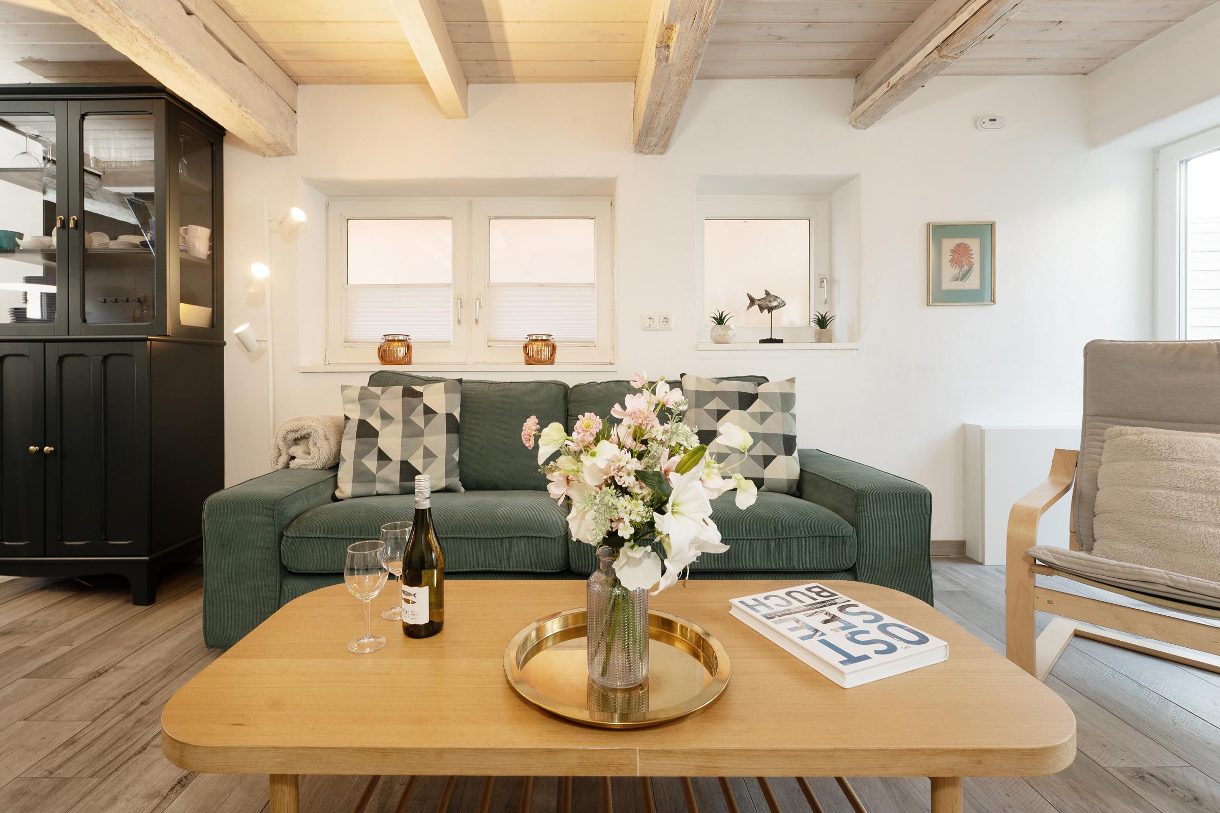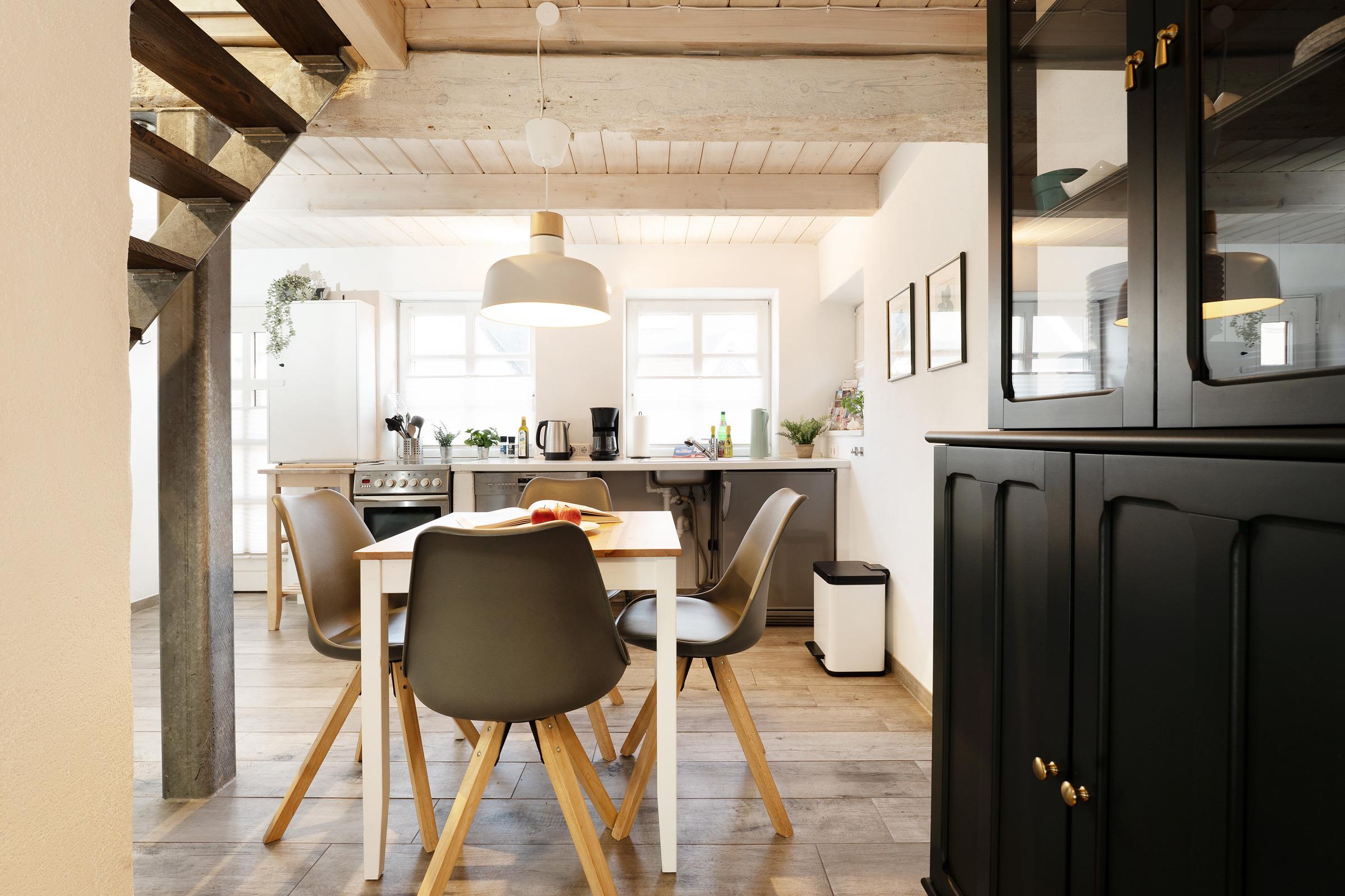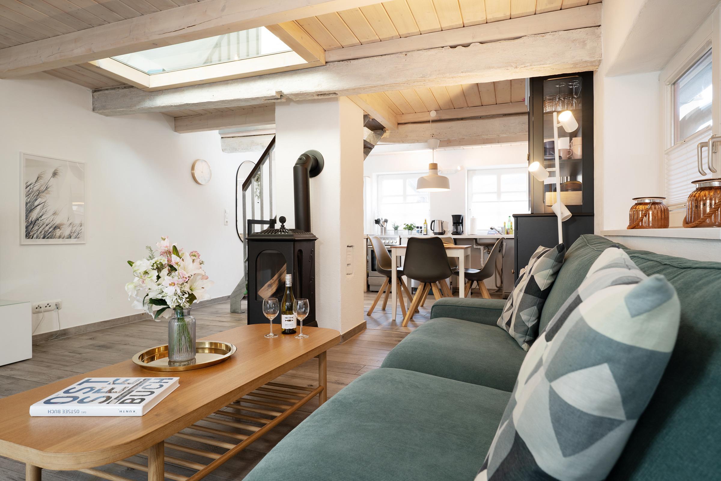 Der Rundgang beginnt im hellen Wohnbereich, der mit Fernseher und einem behaglichen Kaminofen zum Verweilen einlädt. Vom Wohnraum aus treten Sie direkt auf die West-Terrasse, die mit Gartenmöbeln und Elektrogrill ausgestattet ist – perfekt für entspannte Stunden im Freien. Weiter geht es in die gut ausgestattete Küchenzeile mit Backofen, Herd (4 Ceran-Kochfelder), Geschirrspülmaschine, Kühlschrank, Toaster, Wasserkocher und Kaffeemaschine - ein einladender Essbereich schließt sich direkt an.