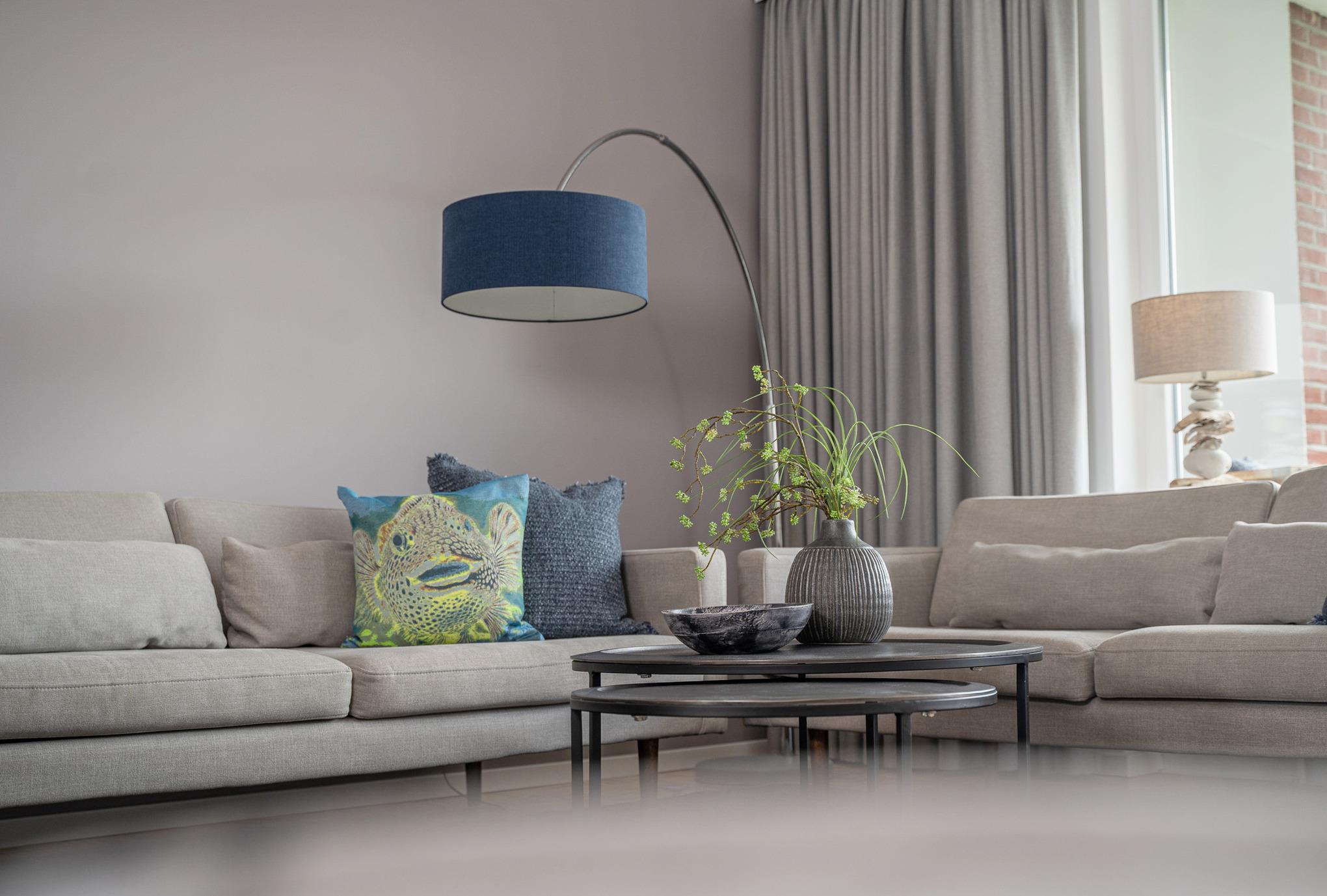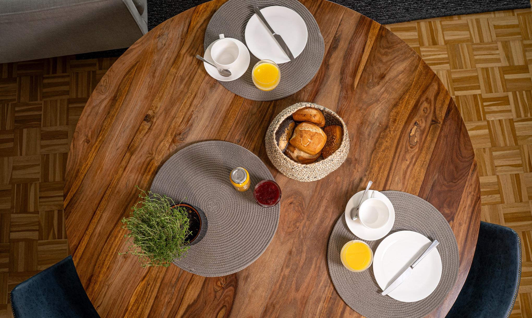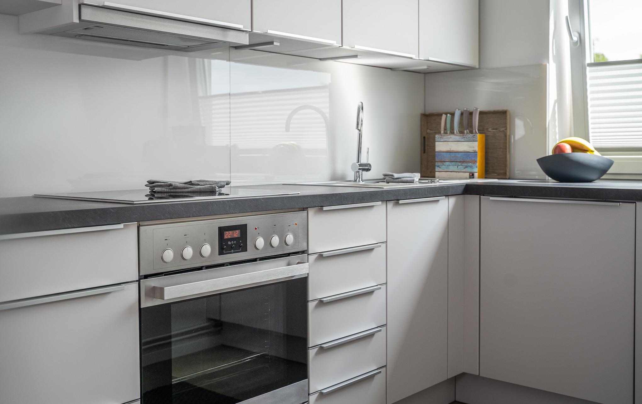 Die offene Küche ist in den Wohnbereich integriert und fügt sich optisch gut ein. Sie ist ausgestattet mit einem Heißluftherd mit Induktionkochfeld, Kühlschrank mit Gefrierfach, Geschirrspüler und viel Schrankplatz. Die Küchenausstattung ist hochwertig und mit Designartikeln wie z.B. der Geschirrlinie Bone China by ASA, Küchenhelfern von MENU, WMF, LINUM etc., um nur einige zu nennen, ausgestattet.