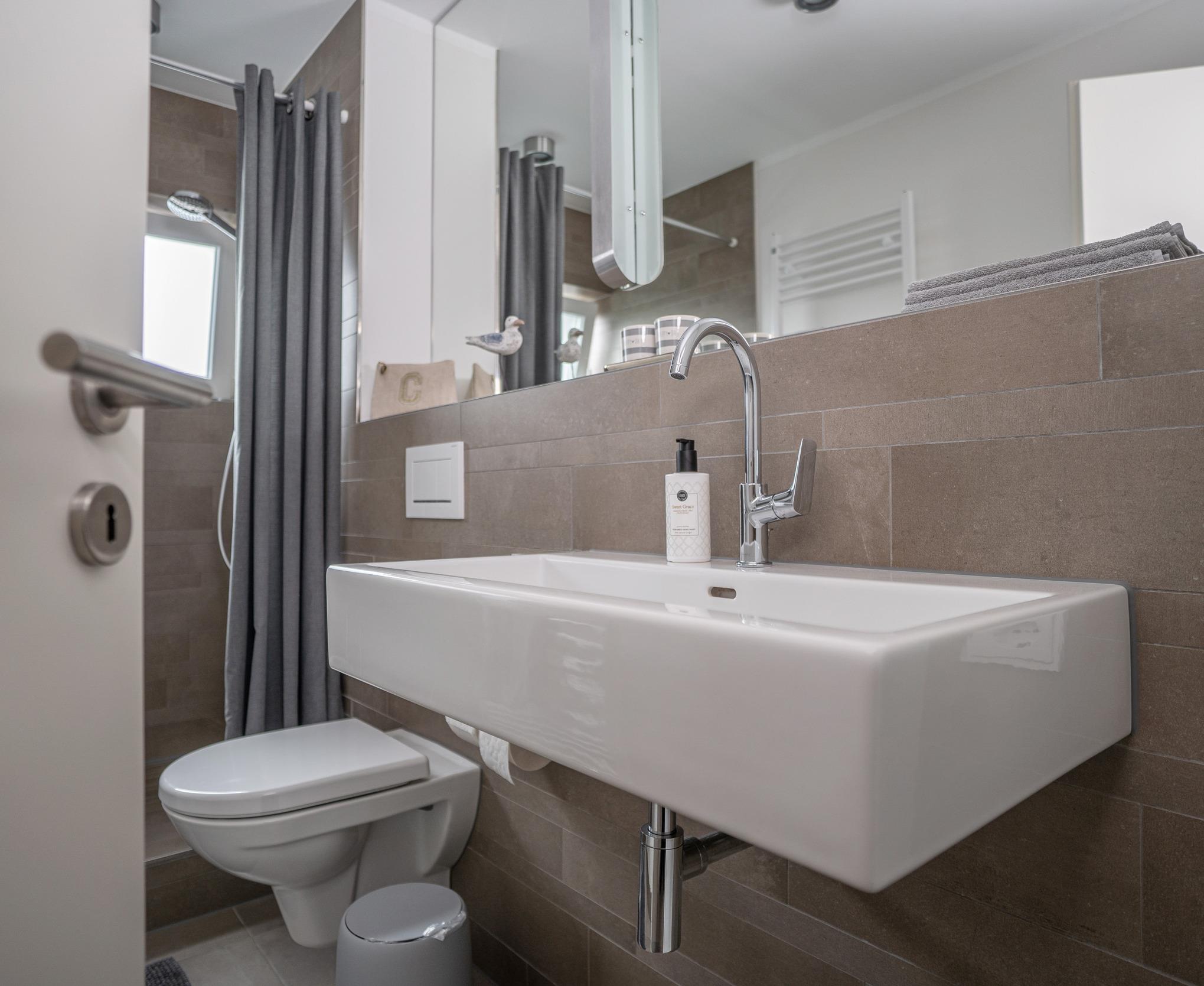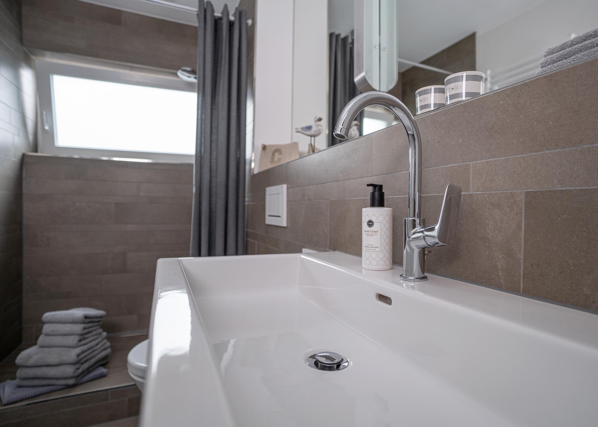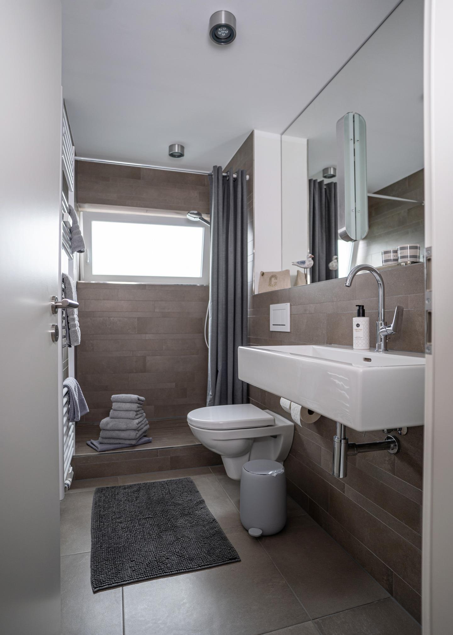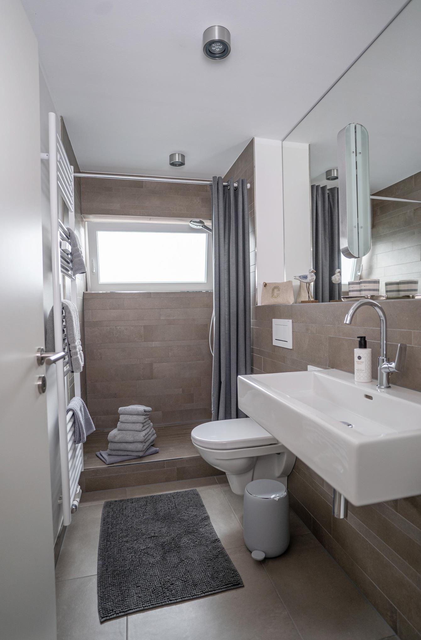 Im Badezimmer dominieren hellgraue Naturtöne im Einklang mit den großen Spiegelflächen.