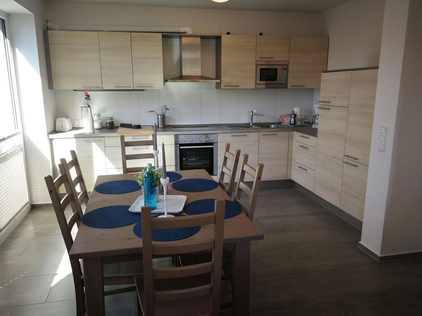 Die Küche liegt zentral in der Wohnung. Hier können Sie alles für das große Barbecue im Garten vorbereiten, mit Cocktails in den Abend starten oder auch einfach frischen Kaffee am Nachmittag zubereiten. Im angeschlossenem Essbereich können Sie gemütlich beisammen sitzen.