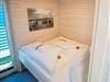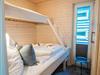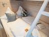 Die beiden Schlafzimmer mit bodentiefen Fenstern verfügen über bequeme Doppelbetten (160×200 und 140×200) sowie ein Hochbett (80×200) im vorderen Schlafraum. Alle Fenster sind mit Plissees (Sichtschutzrollos) ausgestattet,