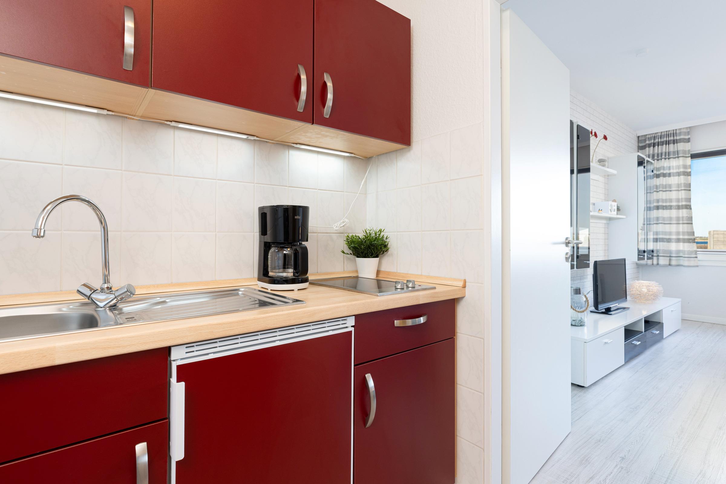 Diese gemütlich eingerichtete Ferienwohnung bietet genau den richtigen Entspannungskomfort. Der Wohn-/Schlafraum verfügt über ein Doppelbett sowie eine schöne Essecke. Hier können Sie Ihre Mahlzeiten zusammen einnehmen, Pläne für Ihren Urlaub schmieden, Spieleabende genießen oder vor dem Fernseher entspannen. In der kleinen Küche können Sie Ihre Lieblingsspeisen mühelos zubereiten. Nach einem schönen Tag auf der Sonneninsel nächtigen Sie entweder im Wohn-/Schlafraum oder im separaten Schlafzimmer, in dem zwei Einzelbetten stehen. Im Kleiderschrank findet Ihre Urlaubsgarderobe Platz. Das innenliegende Duschbad ist hell gefliest.