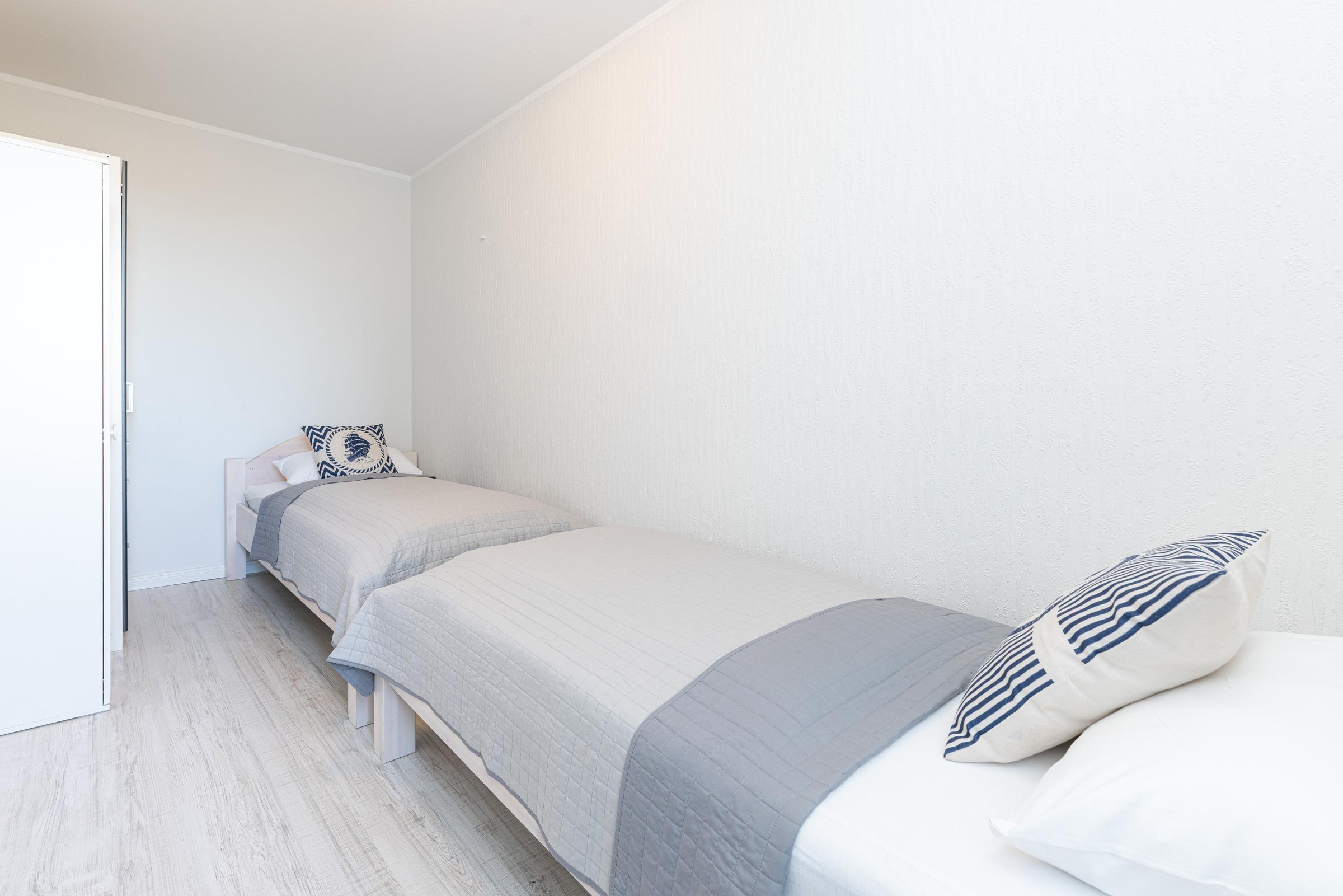 Schlafzimmer: 2 Einzelbetten, Verdunkelung: Gardinen, Kleiderschrank, kein Platz für ein Babybett