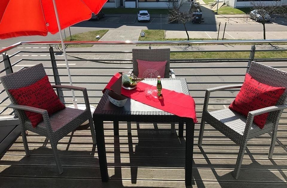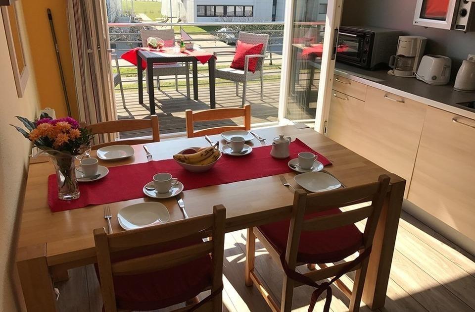 Die Wohnung 10 ist die Eckwohnung im 1. Obergeschoss und somit ideal für Gäste, die es etwas ruhiger mögen. Sie ist über die Terrasse zu erreichen. Im Objekt befindet sich ein festes w-lan Netzwerk, in der Wohnung ein smart TV. Die Wohnung besteht aus einem großen Wohn-/Schlafraum mit Schlafsofa (140x200cm) sowie einem Wandklappbett (180x200cm) und einem Essplatz für bis zu 6 Personen. Die im selben Raum befindliche Versorgungsbar ist mit einem Kühlschrank, einer Mikrowelle und einem Kochfeld sowie einem mobilen Minibackofen ausgestattet. Geschirr und alles was Sie für Ihren Urlaub benötigen ist ebenfalls vorhanden. Separat steht Ihnen noch ein Schlafzimmer mit Doppelbett (180x200cm) sowie einen Kleiderschrank zur Verfügung. Das Duschbad rundet die Wohnung mit ihren 53qm ab.