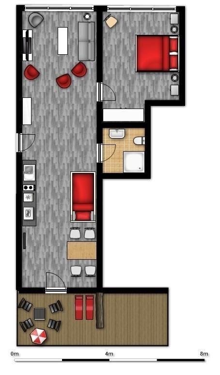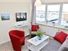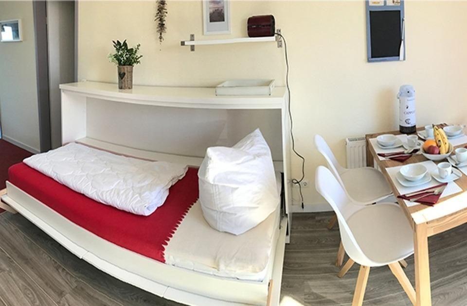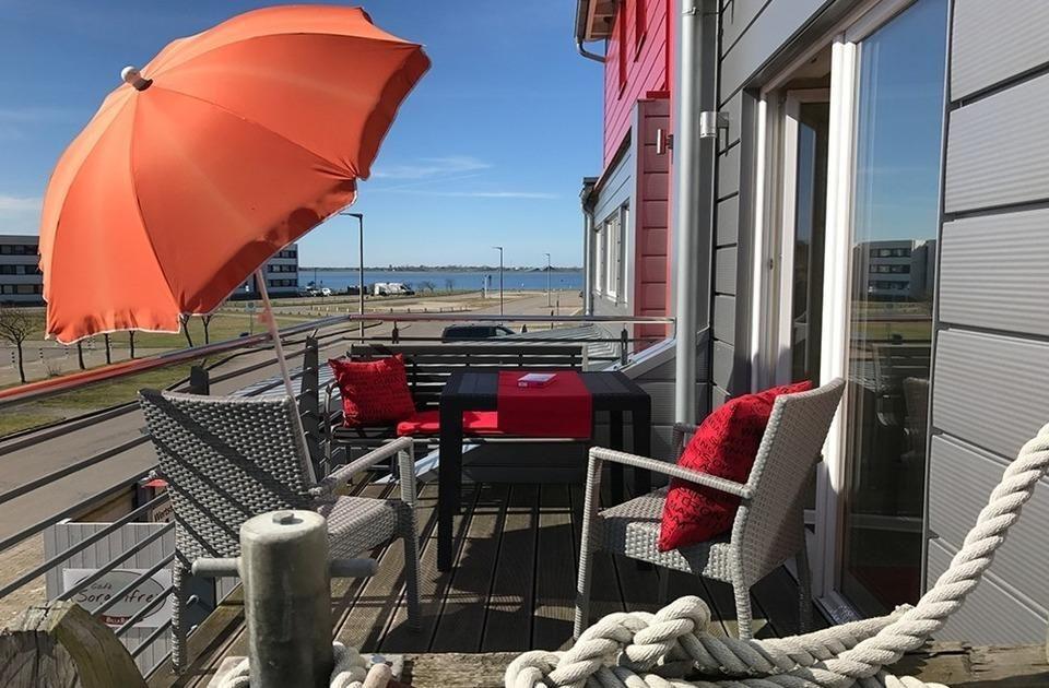 Sie besteht aus einem Wohnzimmer mit Essecke mit 4 Sitzplätzen, einer Versorgungsbar mit Kühlschrank, 2 Platten-Ceran-Feld, Mikrowelle, Kaffeemaschine, Toaster und einem Schlafzimmerbereich mit Doppelbett. Das Besondere ist der einmalige Blick auf die neu gestaltete Hafenpromenade mit eigener, abgetrennter Holzterrasse. Das Sofa im Wohnzimmer ist ausziehbar und verfügt über 2 weitere Schlafmöglichkeiten (140 x 200cm). Vom Sofa schaut man auf die Schiffe im Hafen mit all seinem maritimen Flair. Im Objekt befindet sich ein festes w-lan Netzwerk, in der Wohnung ein smart TV. Das Badezimmer besticht durch seine ebenerdige Dusche und ist somit auch für gehbehinderte Menschen ideal. Der kostenfreie, neugestaltete PKW-Stellplatz ist direkt vor der Tür.