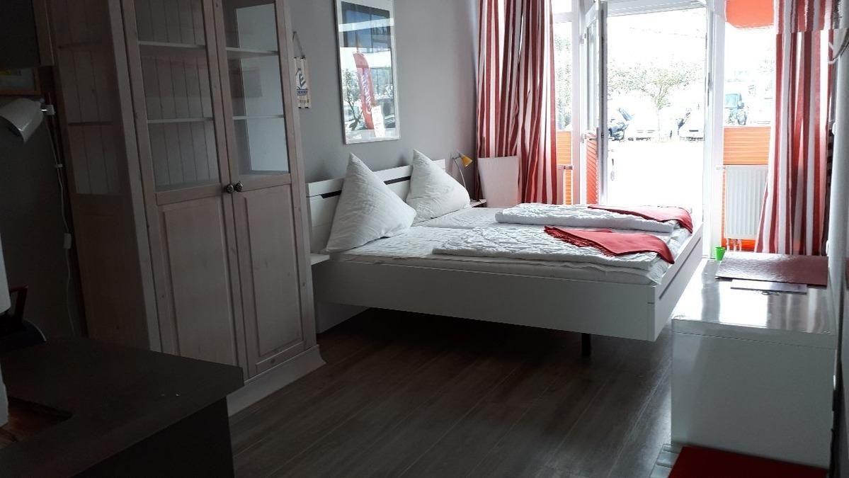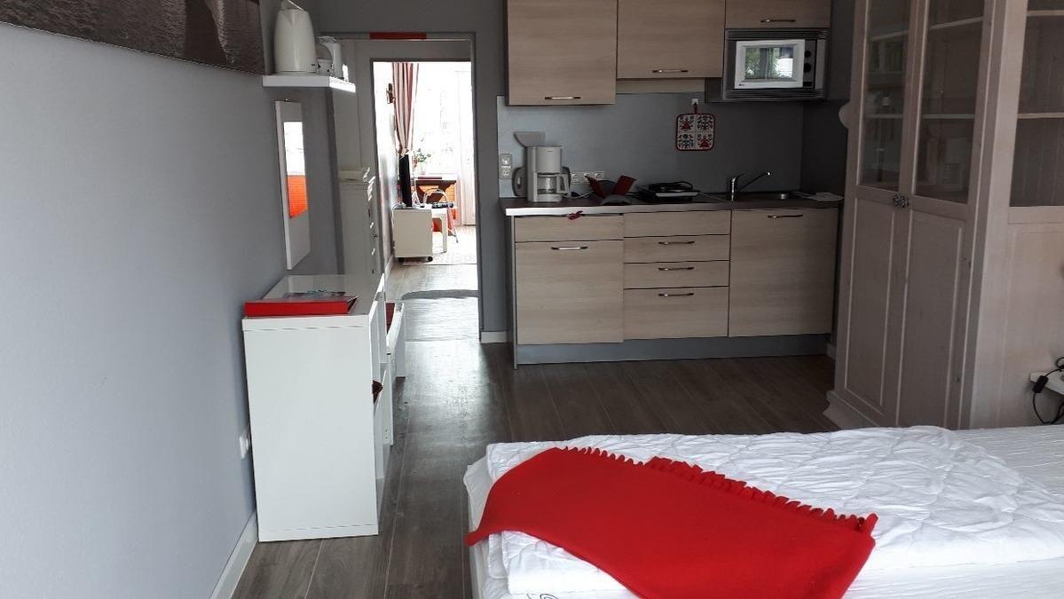 Diese Wohnung besteht aus einem Wohnzimmer mit Essecke , einer Versorgungsbar mit Kühlschrank, 2 Platten-Ceran-Feld, Mikrowelle, Kaffeemaschine, Toaster und einem Schlafzimmerbereich mit Doppelbett. Das Besondere ist der einmalige Blick auf die neu gestaltete Hafenpromenade mit eigener, abgetrennter Holzterrasse. Da der Boden ca. 2,50m über der Wasserlinie liegt, haben Sie einen hervorragenden Blick auf die Schiffe im Hafen und das maritime Flair. Im Objekt befindet sich ein festes w-lan Netzwerk, in der Wohnung ein smart TV.
