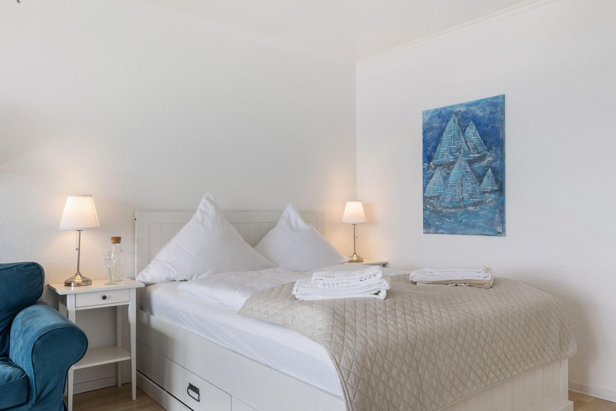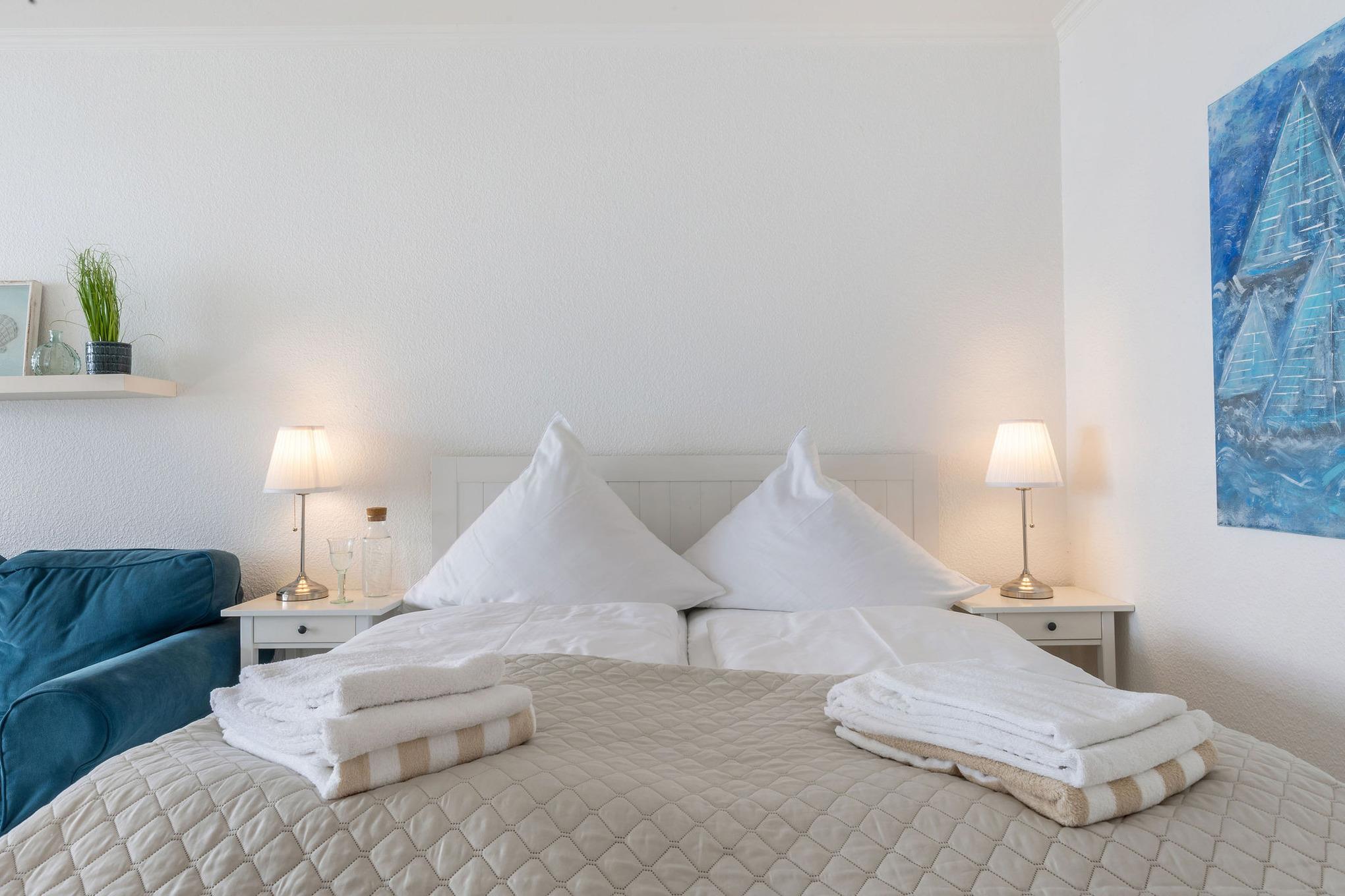 Traumhafter Blick auf Ostsee und Hafeneinfahrt - Verbringen Sie Ihren Urlaub in Cozy Beach, der besonderen Ferienwohnung zwischen Strand und Yachthafen! Das 49 qm große Apartment besticht durch den sensationellen Ausblick, direkt vor dem überdachten Balkon liegt die Hafeneinfahrt in den Yachthafen Burgtiefe und es lässt sich herrlich auf die Ostsee und die einfahrenden Schiffe schauen. Aufgeteilt ist Cozy Beach in eine Küche im Eingangsbereich der Wohnung, die über alle Annehmlichkeiten verfügt. Angrenzend befindet sich das Duschbad. Der große kombinierte Wohn-Schlafraum verfügt über ein Doppelbett (160x200 cm), Sofa, Smart-TV und Esstisch für 4 Personen. Im separaten Schlafzimmer befindet sich ein weiteres Doppelbett (180x200 cm) sowie ein Kleiderschrank. Zur Wohnung gehört ein Stellplatz vor dem Haus, es gibt einen Abstellraum für Fahrräder für die Hausgemeinschaft.