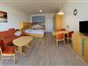 Im Wohn-/Schlafraum befindet sich ein Doppelbett für 2 Personen (200cm x 180cm), eine Sofaecke mit TV und einem Essbereich.