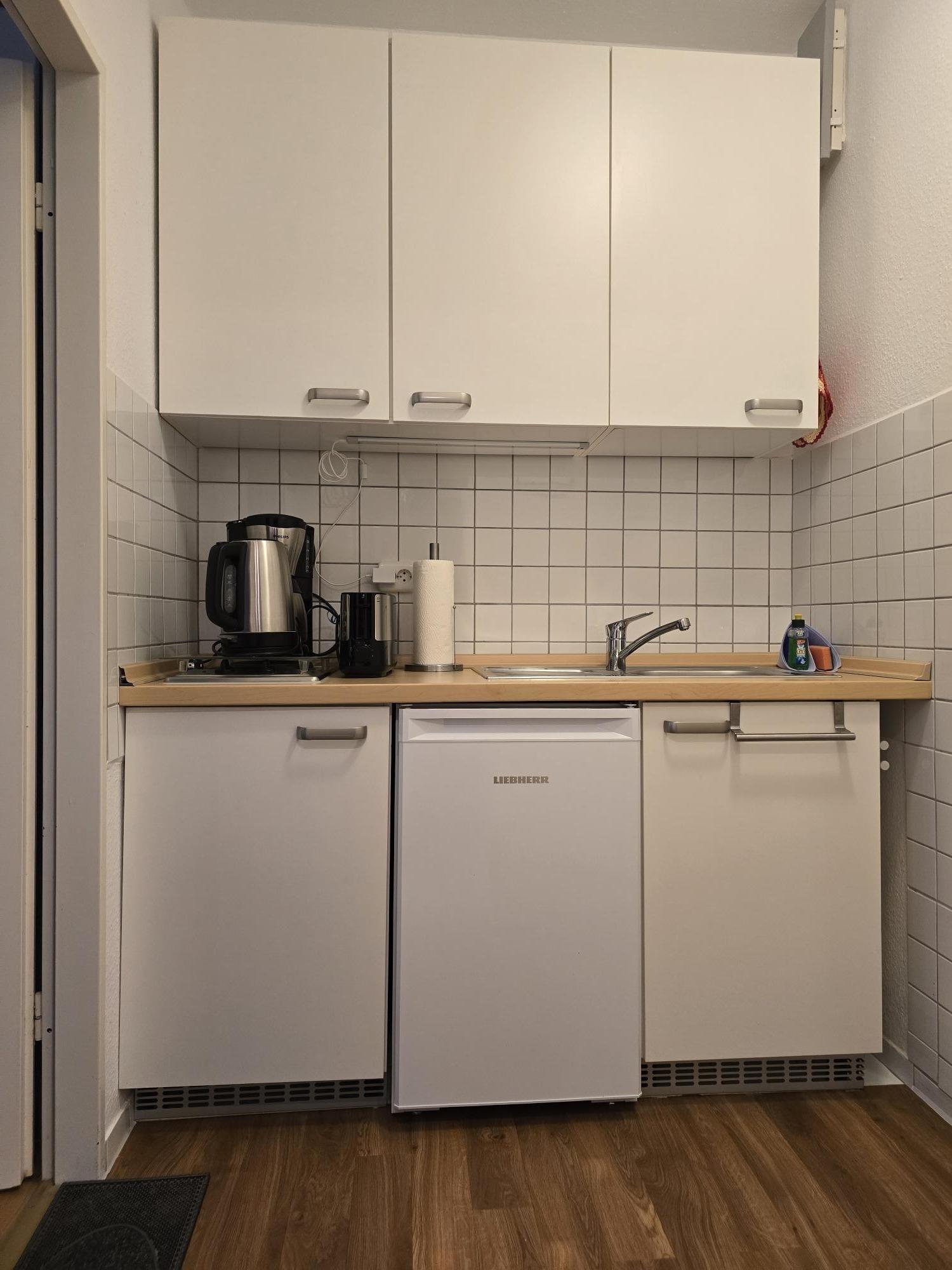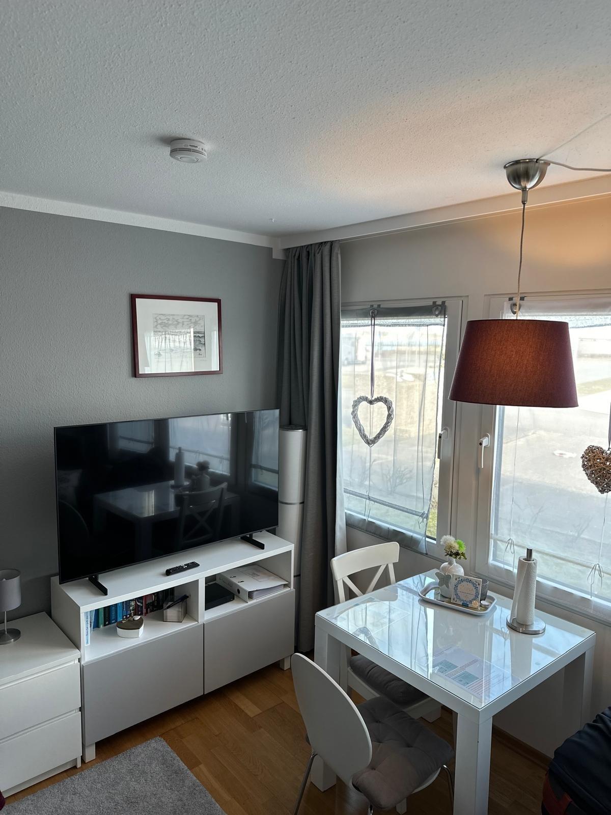 Die Wohnung ist modern und freundlich in Weiß- und Grautönen eingerichtet und bietet mit zwei gemütlichen Sesseln und Fußhocker einen entspannten Rückzugsort nach einem Tag am Meer. Ideal für Paare oder zwei Personen, die eine stilvolle und zugleich unkomplizierte Unterkunft in bester Lage suchen.