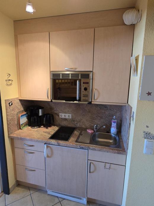 Im Eingangsbereich befindet sich die voll ausgestattete Küchenzeile mit einem Ceranfeld, Kühlschrank mit Gefrierfach, Mikrowelle, Kaffeemaschine, Wasserkocher, Toaster und Eierkocher.