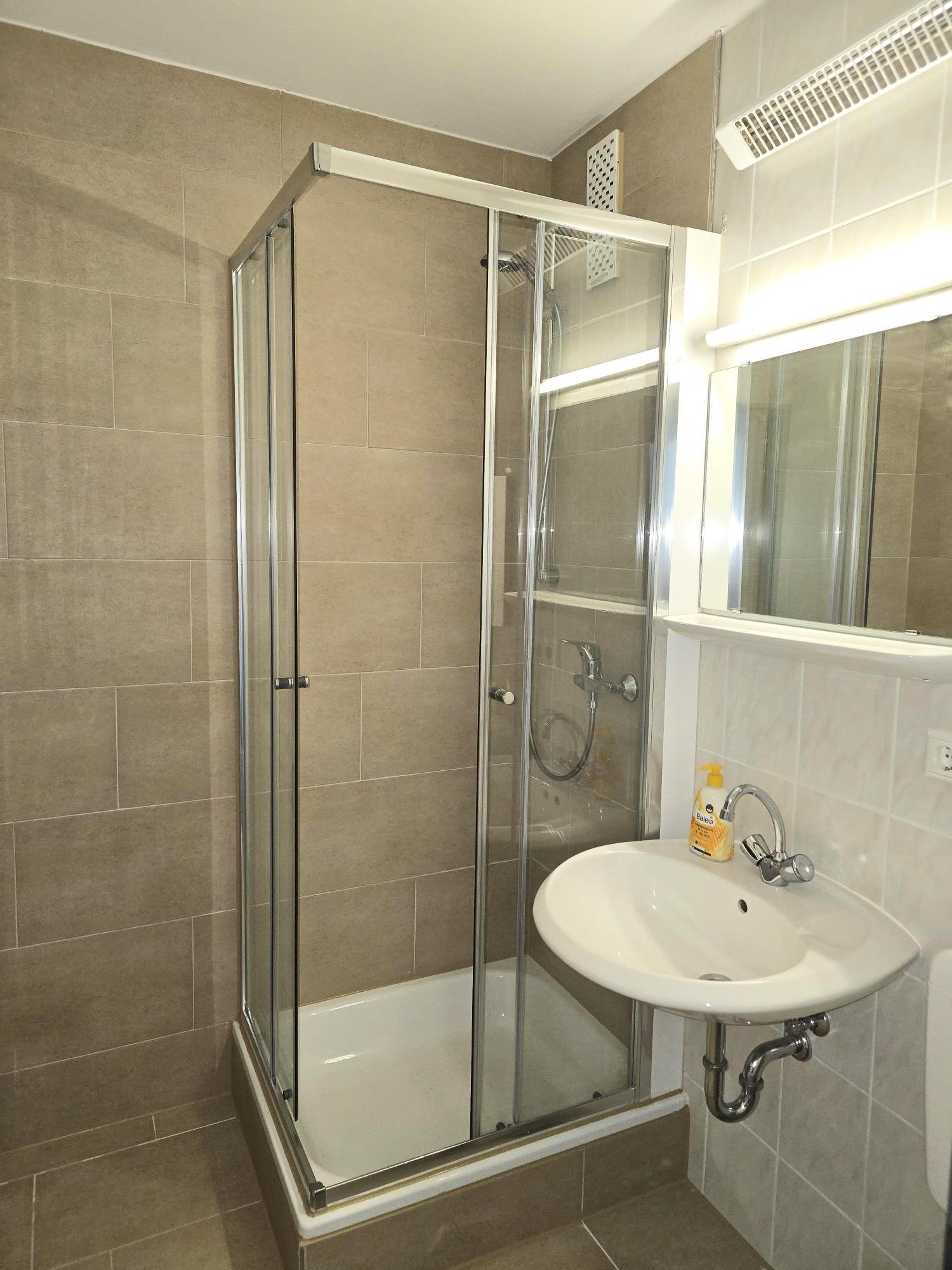 Das Duschbad ist hell gefliest.