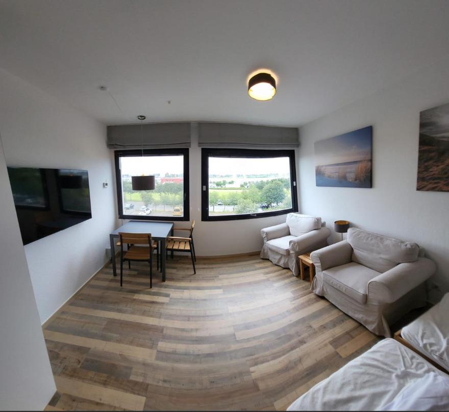 Das kombinierte Wohn- und Schlafzimmer ist mit einem Klappbett ausgestattet, zwei Sesseln und einem Esstisch.