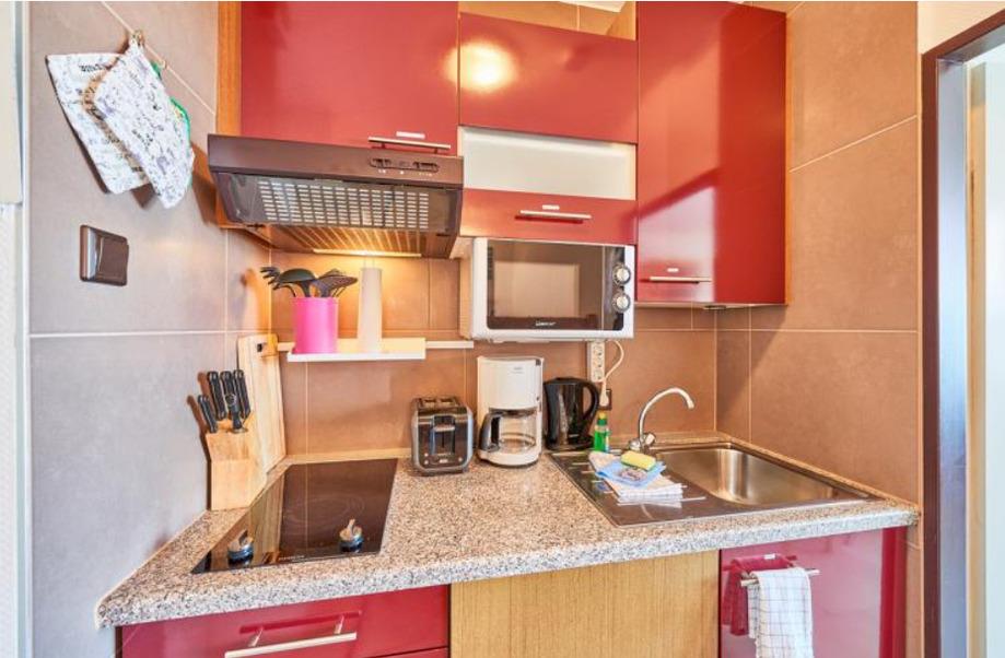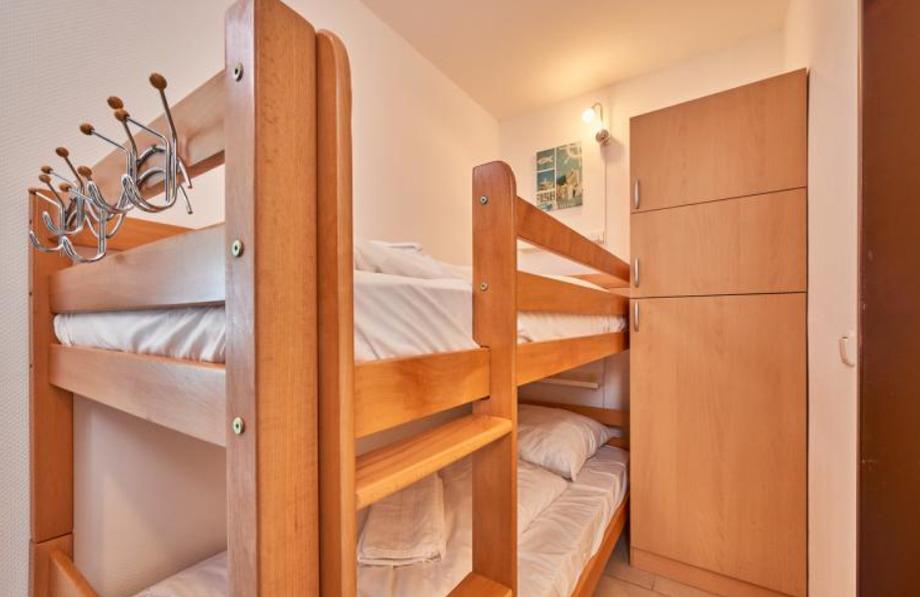 Die Wohnung verfügt über eine Doppelschlafcouch, ein Etagenbett, ein Duschbad und eine Pantryküche.