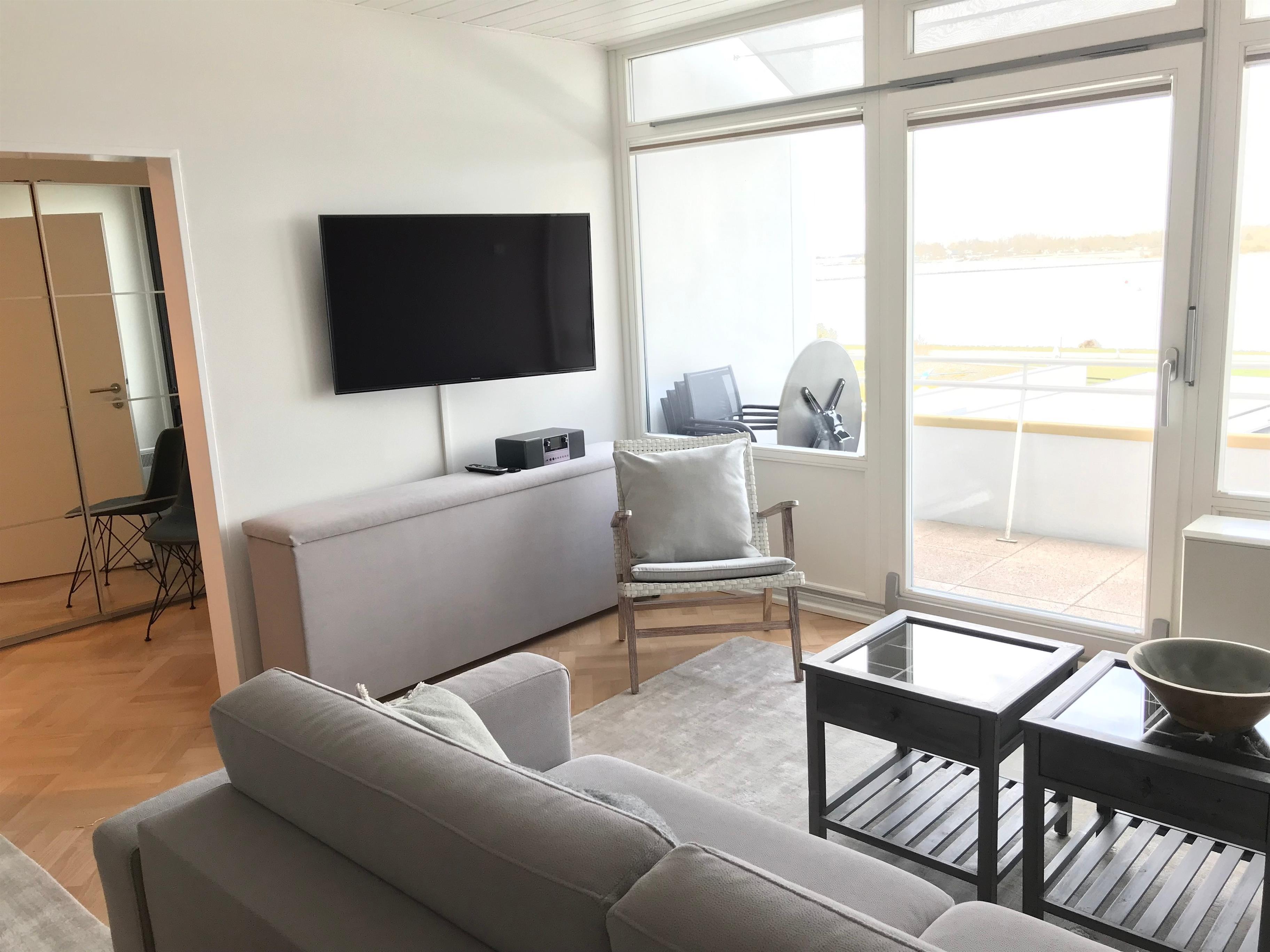 Im Wohn- und Essbereich befindet sich der Esstisch, von dem aus Sie schon beim Essen das Treiben auf dem Wasser beobachten können. Hier steht auch ein gemütliches Sofa mit Blick aufs Meer und das TV.