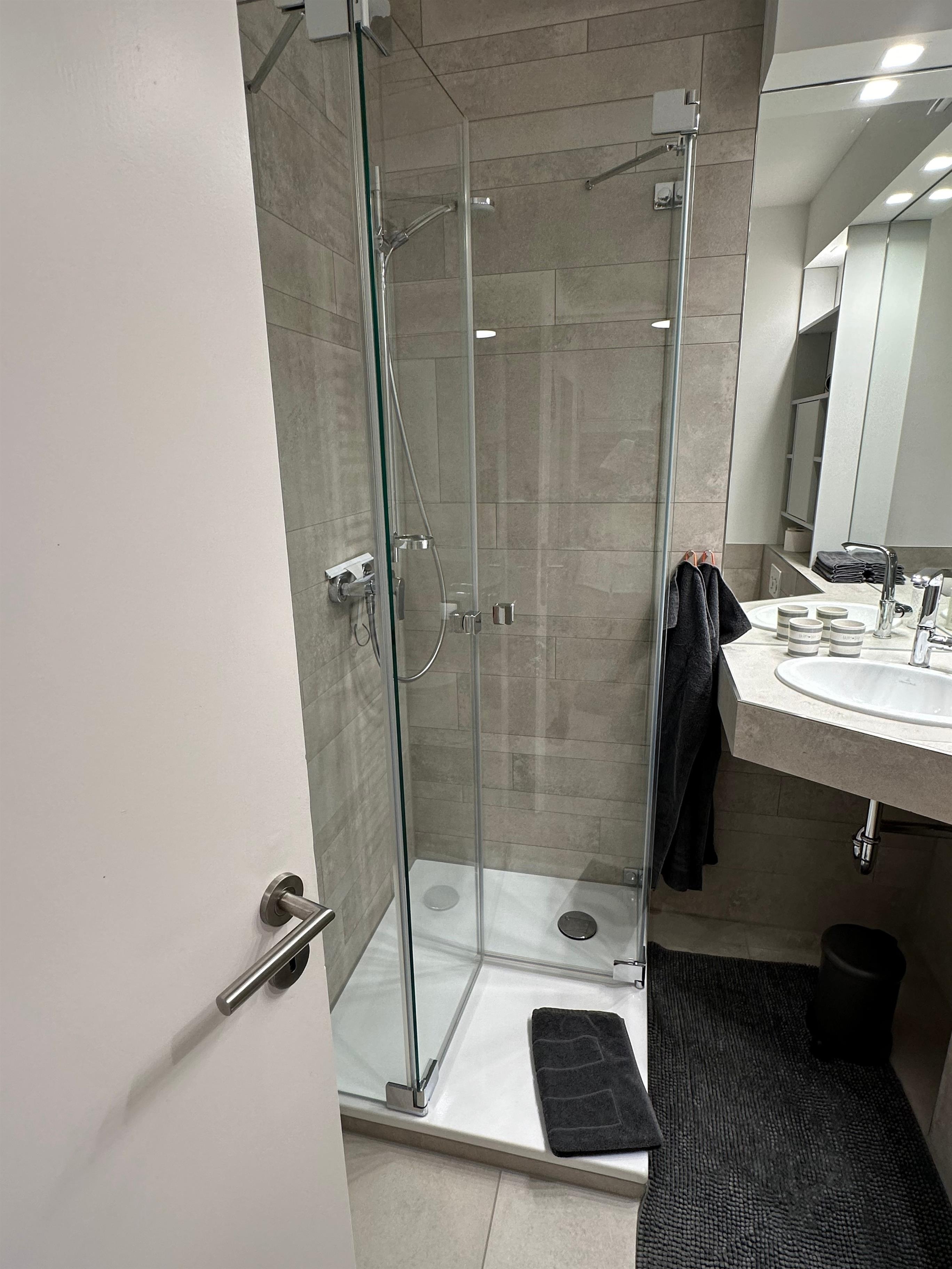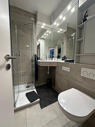 Das Bad ist hell und freundlich gefliest. Die Dusche hat eine Größe von 80x80cm. Ein Durchlauferhitzer bietet Ihnen unbegrenzt heißes Wasser.