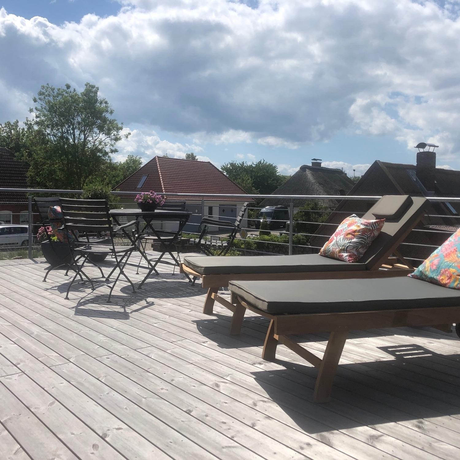 Die 30 qm Dachterrasse lädt zur morgendlichen Yogaeinheit mit anschließendem Frühstück ebenso ein, wie zum Sundowner bei Sonnenuntergang. Insgesamt bieten wir Ihnen 120 qm zur alleinigen Nutzung - Platz zum Ausbreiten und es sich richtig gut gehen lassen. Darüberhinaus haben Sie die Möglichkeit in unserem 2000 qm herrlich angelegtem, mit Sonnenliegen und Grillplatz ausgestattetem Garten Ihren Lieblingsplatz zu finden.