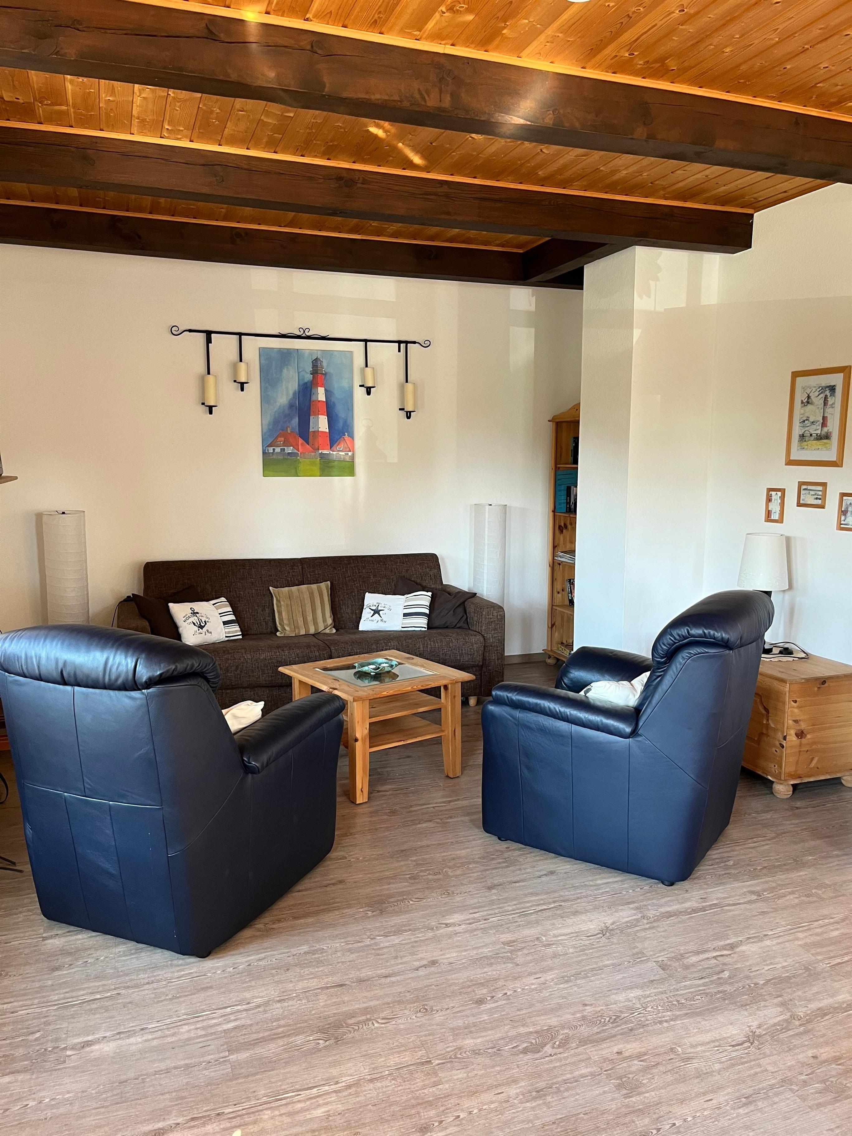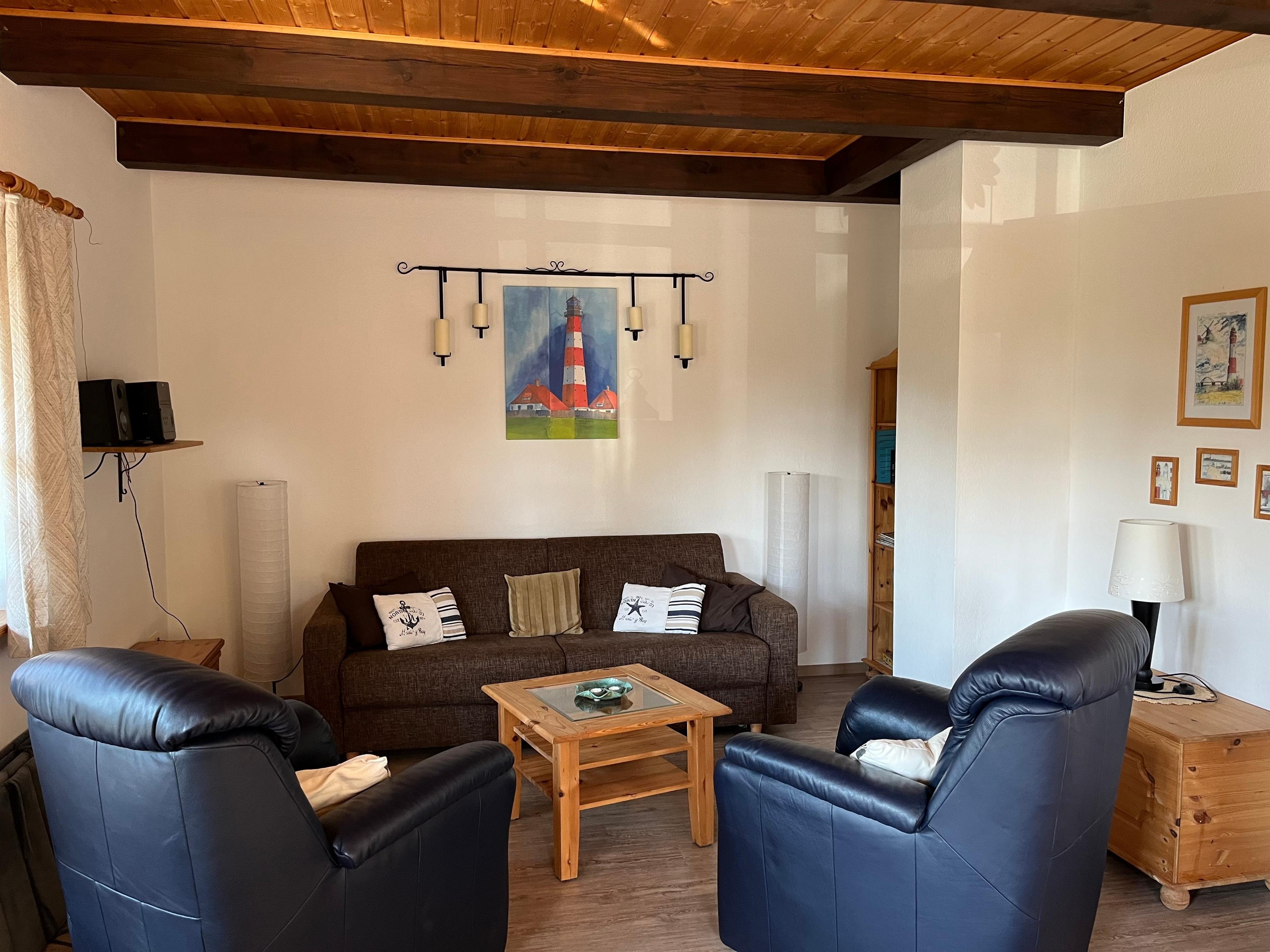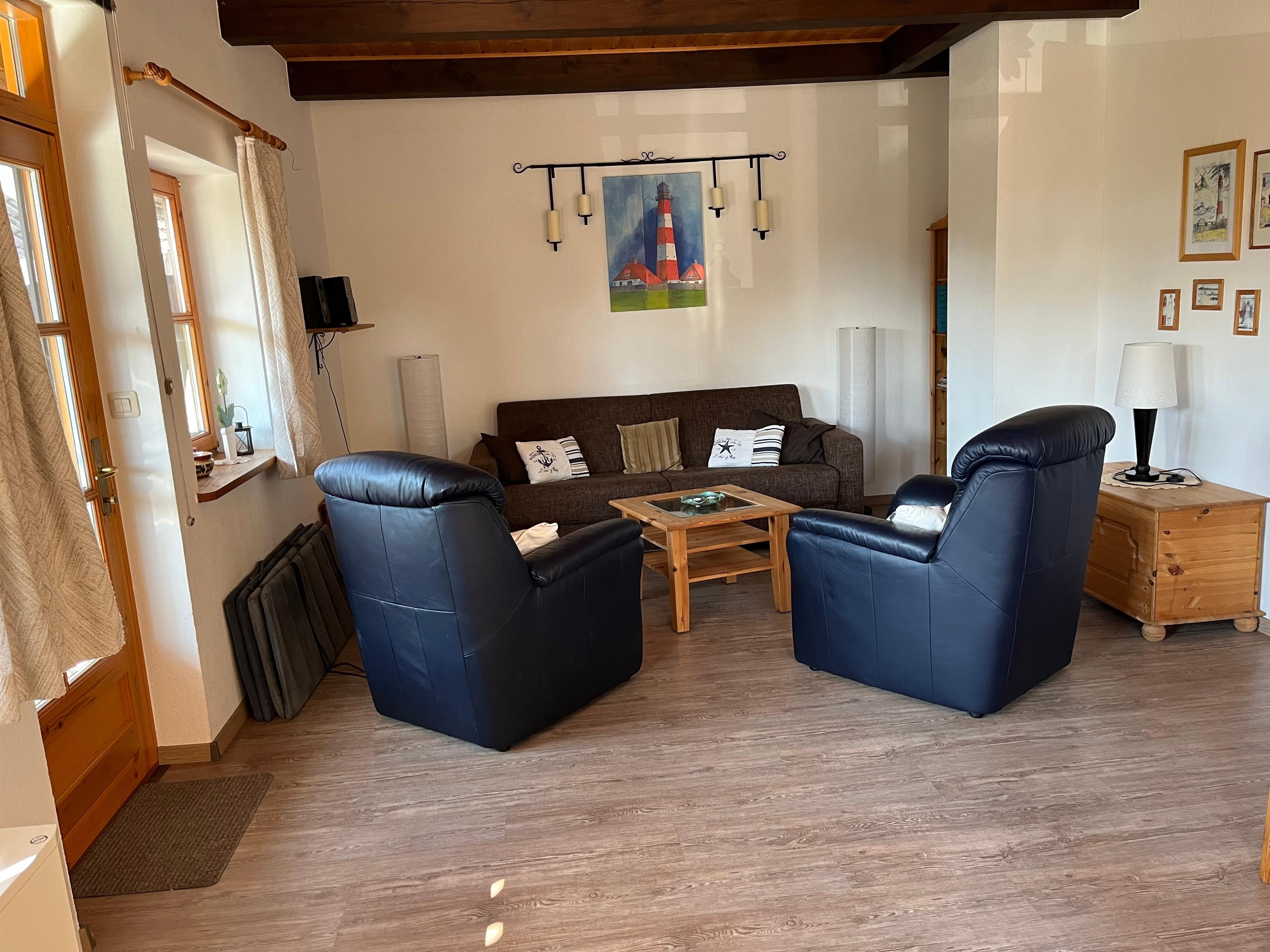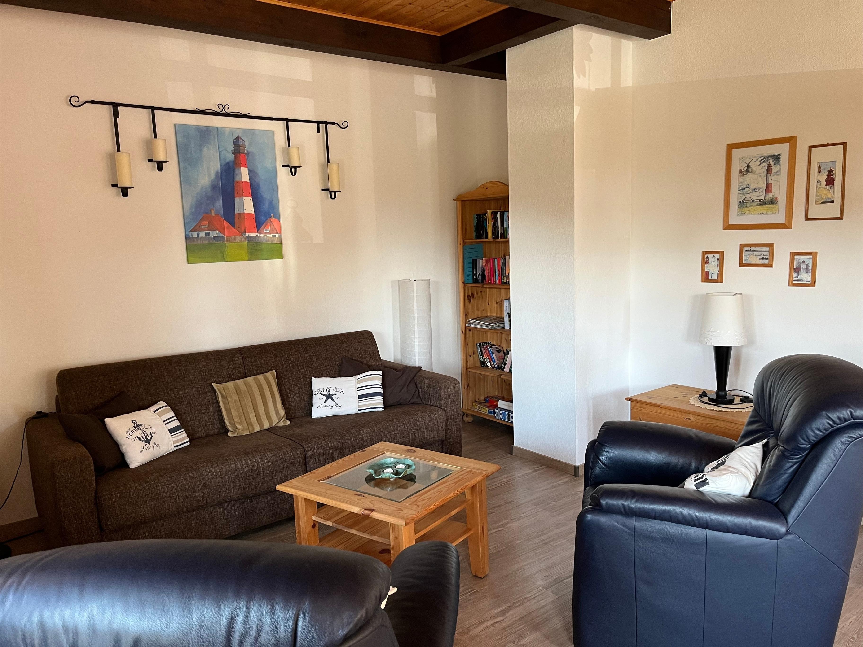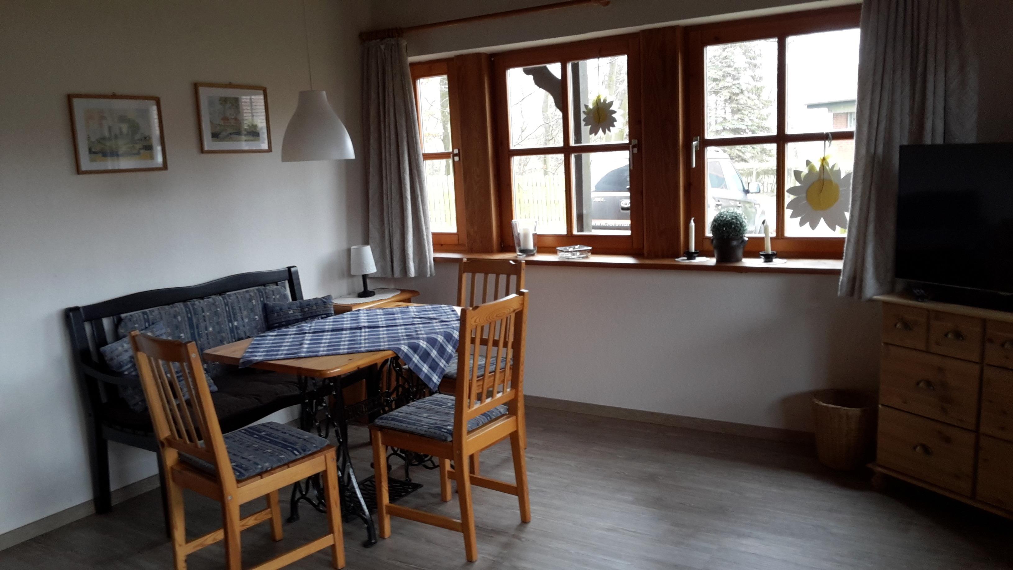 Die Wohnung ist liebevoll im maritimen Stil eingerichtet mit einem Wohn u. Essbereich mit neuem komfortablen Schlafsofa. Aus diesem sich eine 160m breite auf Lattenrost gelagerte Kaltschaummatratze herausfaltet. Im separaten Kinderzimmer befinden sich 2 Einzelbetten (auch zusammen stellbar). Anstelle der Komode können Sie gerne ein mitgebrachtes Babyreisebett aufstellen, für ein weiteres Kind. Die Ferienwohnung bieten wir nur als bedingt allergikergerecht an. Wir haben keine Federbettdecken, Pflegeleichte Böden und Fliesen.