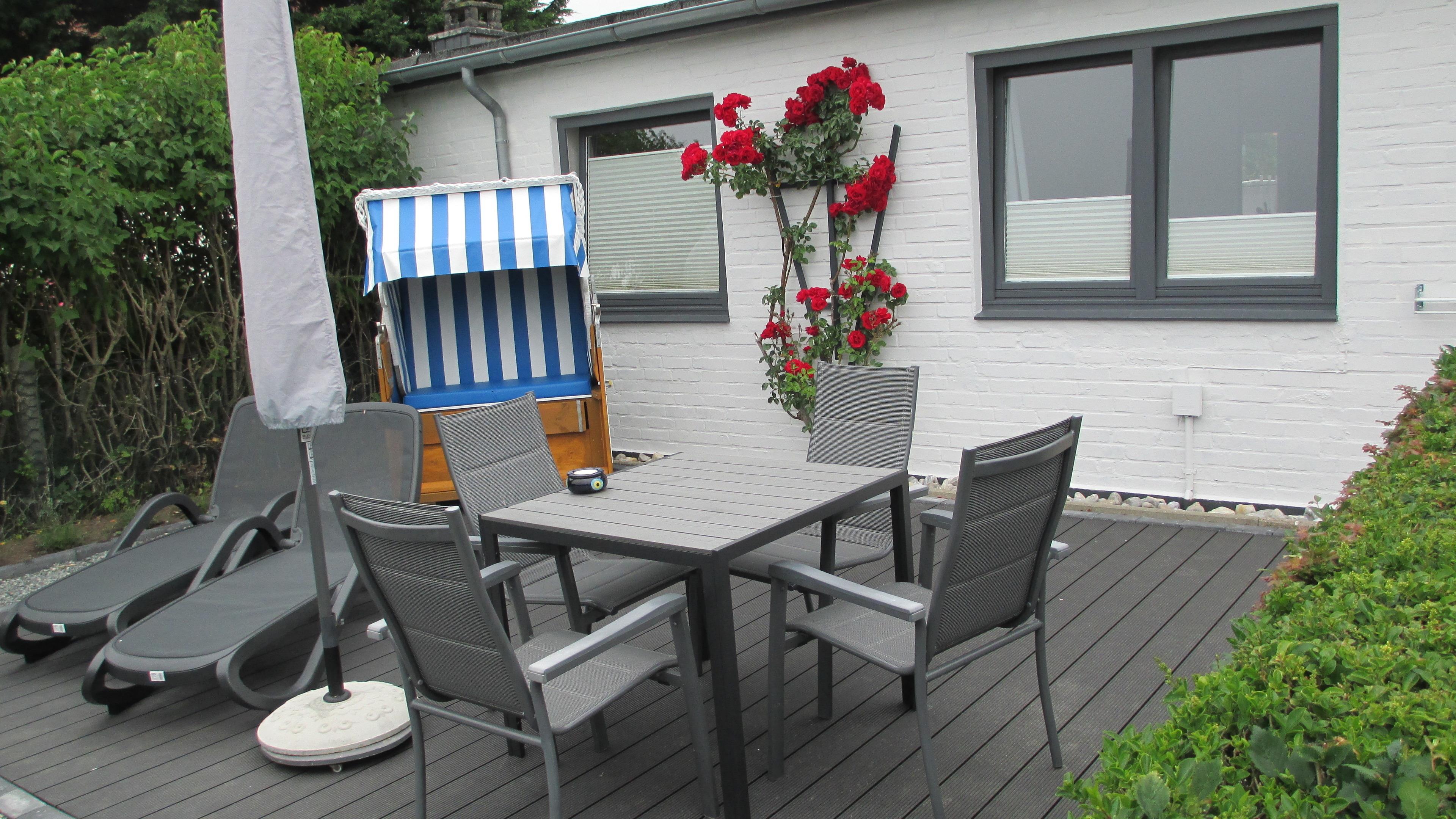 Die Meerblick Ferienwohnung ca 58 qm für zwei Erwachsene besteht aus Wohnraum, Schlafraum, beides mit Meerblick, einer voll ausgestatteten Küche mit Geschirrspüler. Duschbad und einer schönen Terrasse mit Meerblick , SatTV und WLan kostenlos, einen Strandkorb, 2 Hotelliegen, Gartentisch mit Stühlen sowie einen großen Sonnenschirm und einem kleinen Holzkohlegrill. Die mitgebrachten Fahrräder können untergestellt werden.