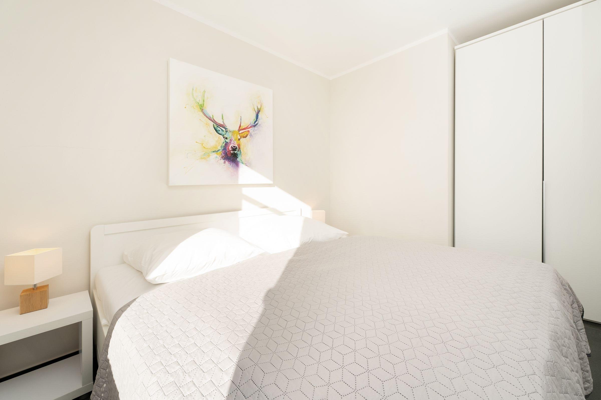 Schlafzimmer 1: Doppelbett, Kleiderschrank, TV